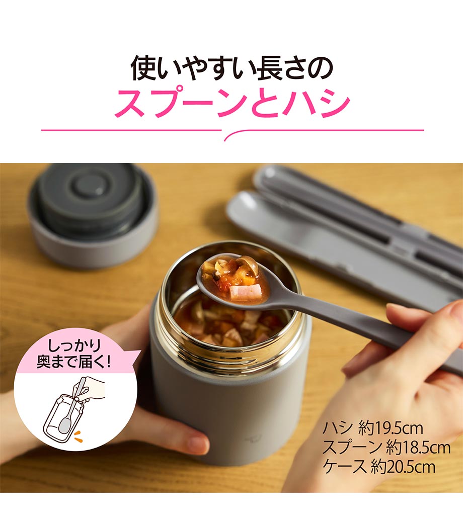 真空二重構造と象印独自の「サーモリング構造」でランチタイムまで温かさ・冷たさをキープ。せんとパッキンが一体化した「シームレスせん」を採用し、食洗機対応でお手入れが簡単。具沢山スープやカレーにぴったりの大きめお茶碗サイズです。