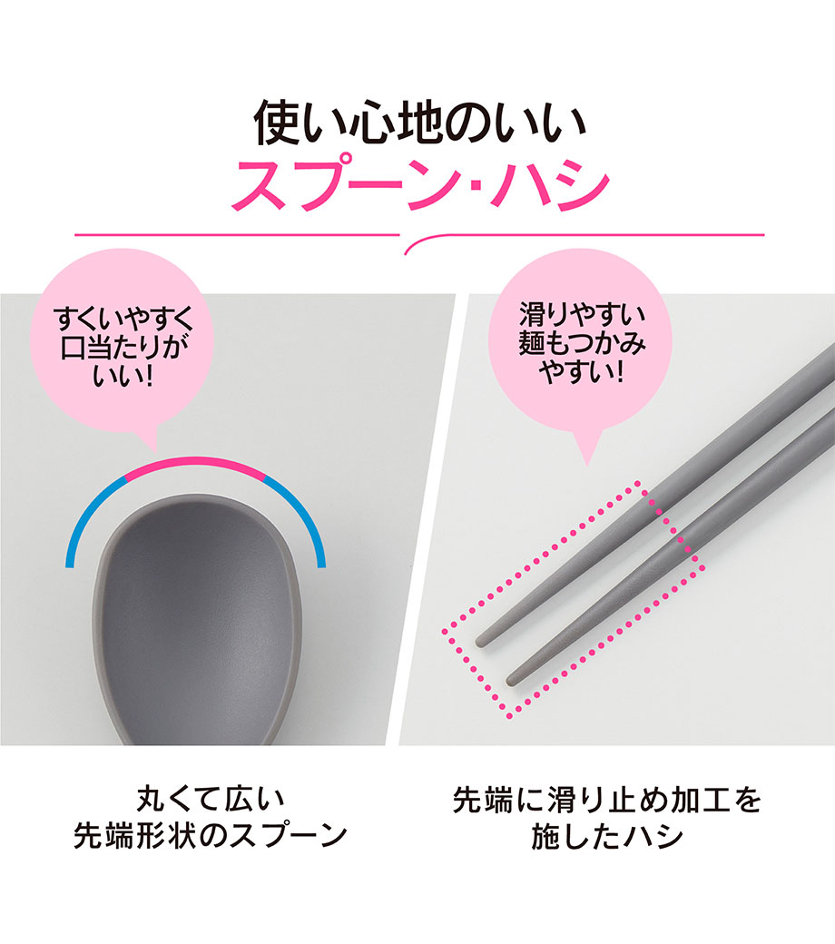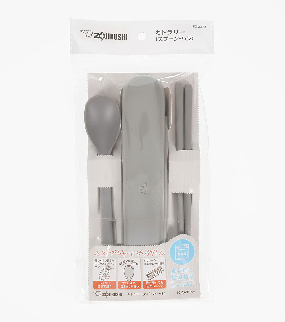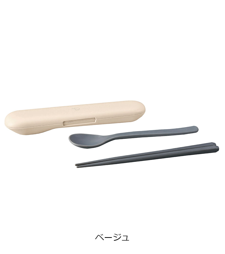 丸くて広い先端形状で、すくいやすく口当たりがよいスプーンと、お箸がケースに入ったカトラリーセットです。スプーンはスープジャーに丁度良いつくりで、しっかり奥まで届く長さがうれしい。持ち歩いてもカタカタ音がしにくいシリコーンゴム製のハシ留め付き。全パーツ食洗機対応です。