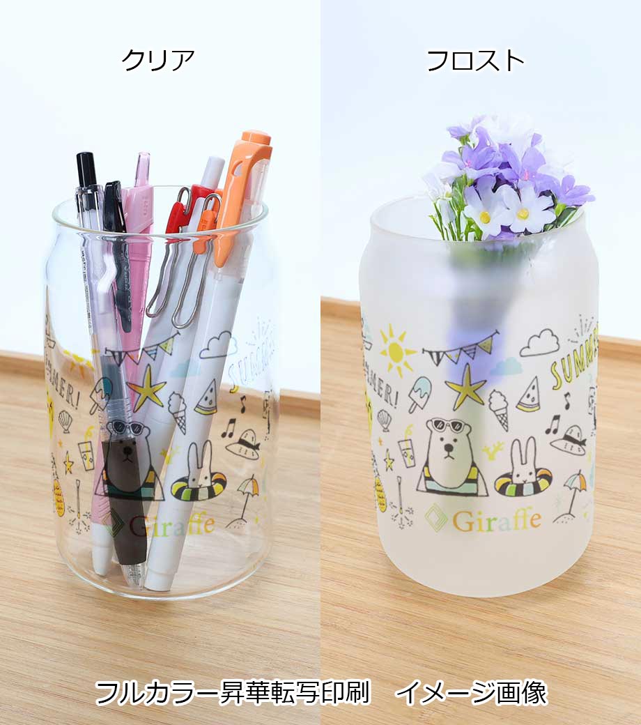 飲料缶のような形状のユニークなグラスです。側面にぐるっとフルカラー印刷ができ、写真やイラストも鮮やかに表現します。インパクトやデザイン性を重視したオリジナルグッズ、同人グッズなどの作成にぴったり!