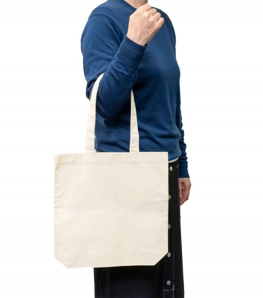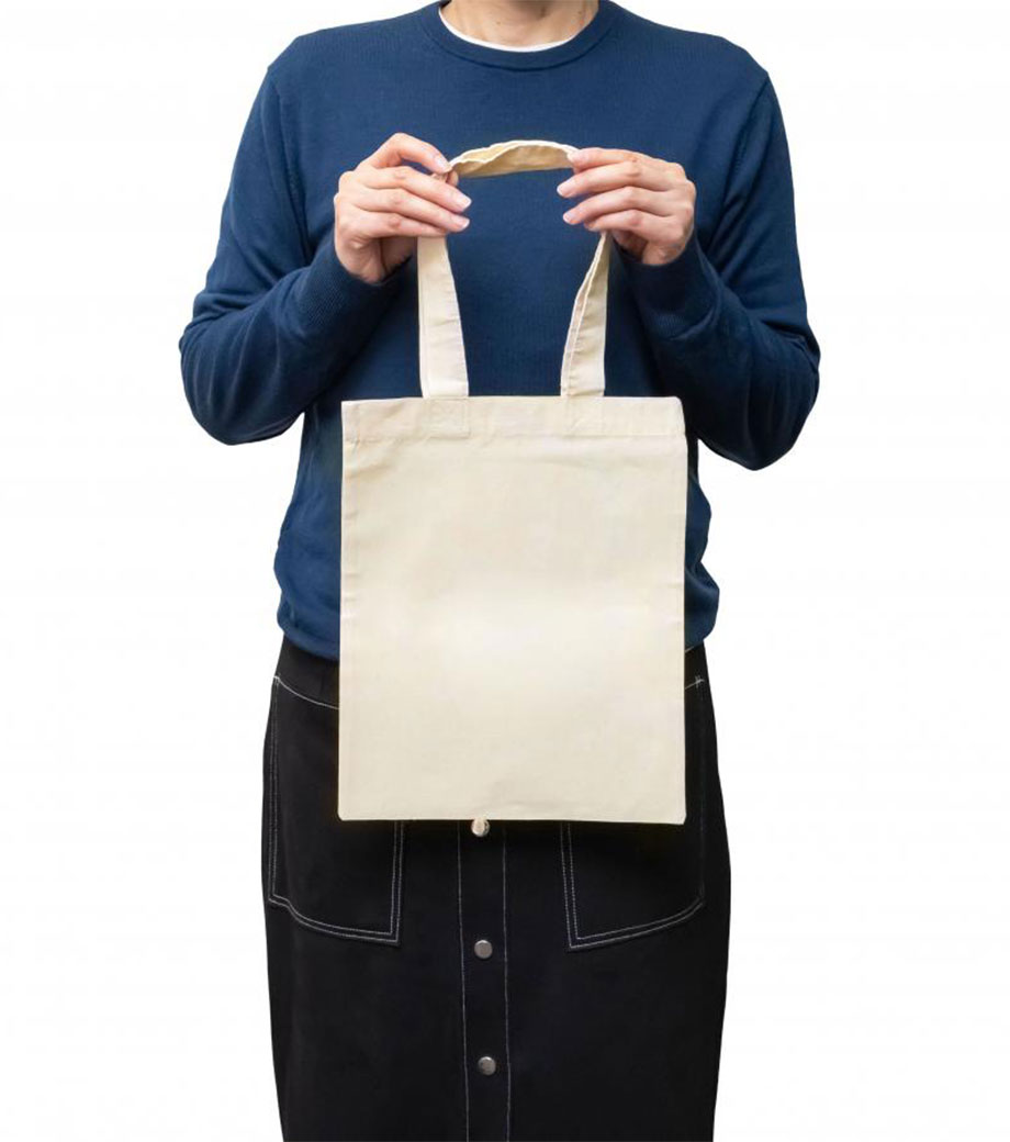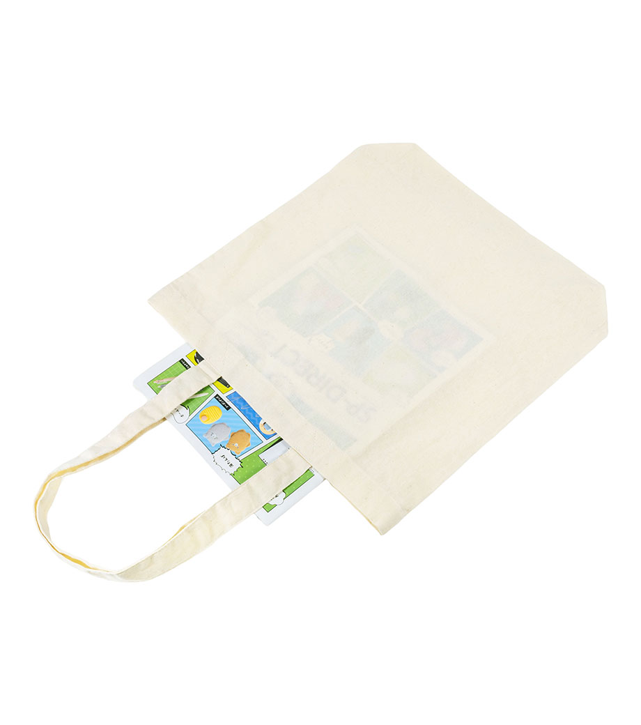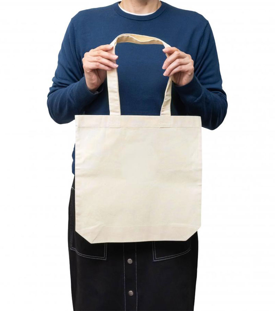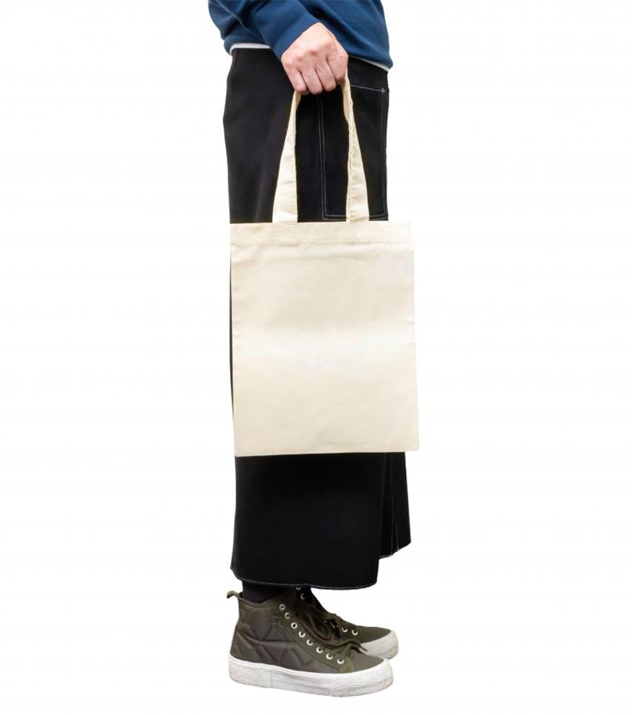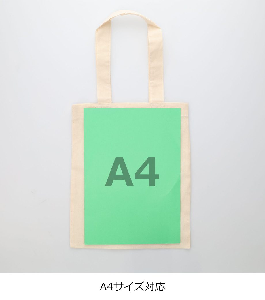 再生コットンを使った環境配慮型トートバッグ。A4対応で資料配布におすすめです。底マチ付きのため、資料以外にサンプルの配布にも便利です。持ち手は肩掛けしやすい長さ。生地はシーチングで中身がやや透ける程度の厚みです。展示会やセミナー、各種イベントで活躍します。