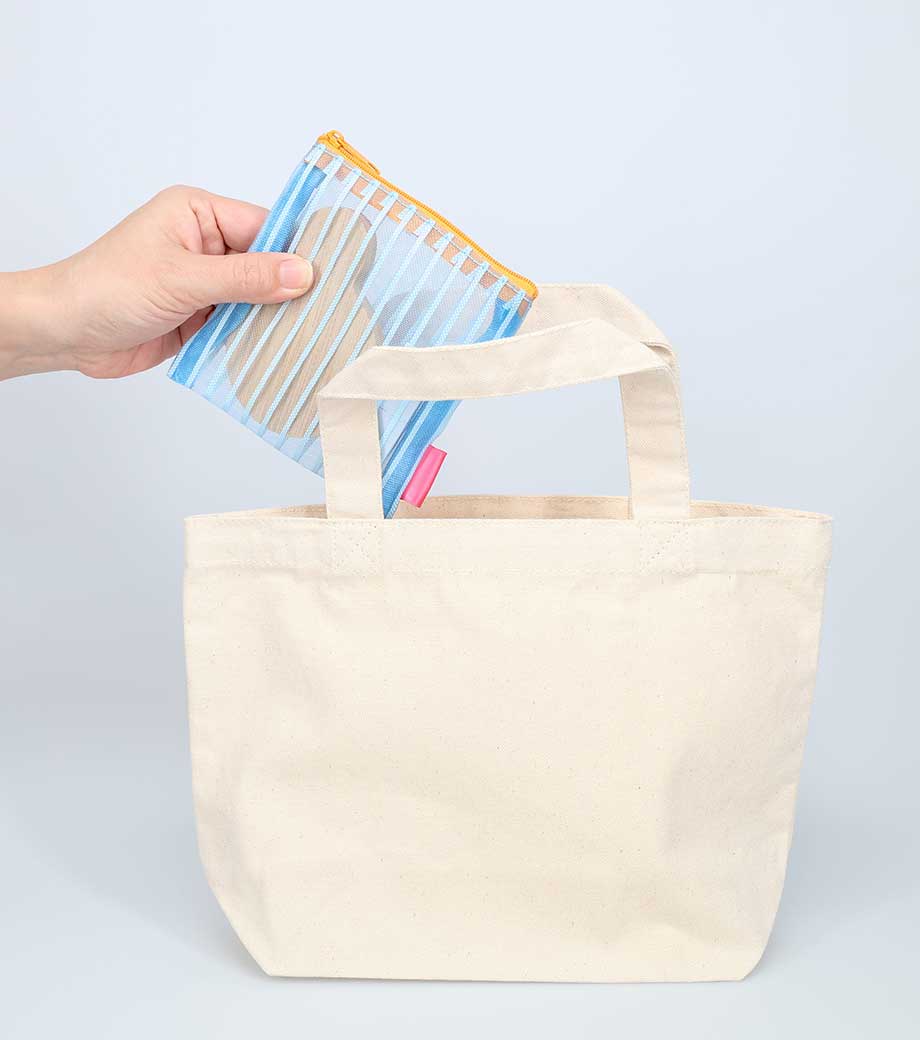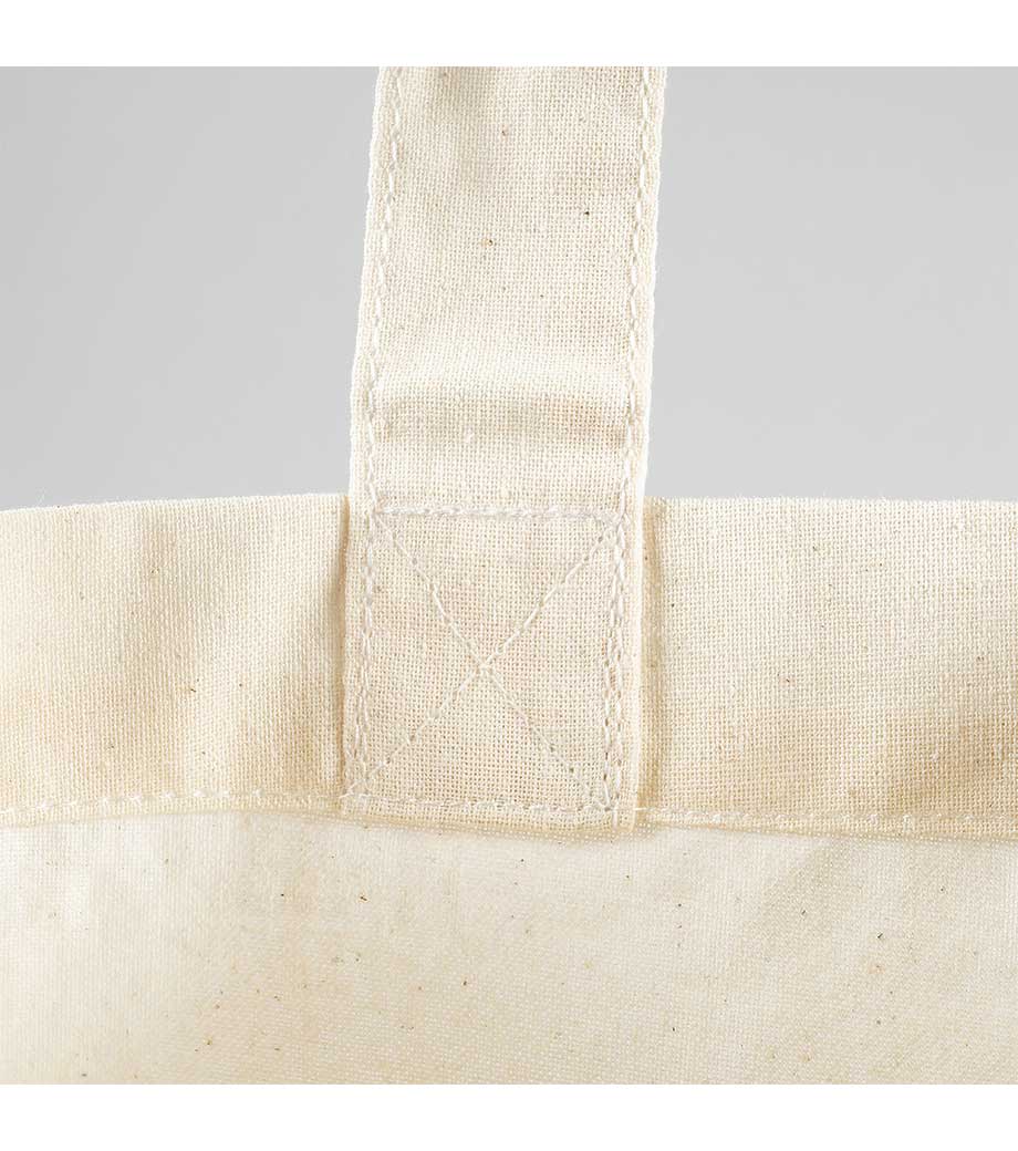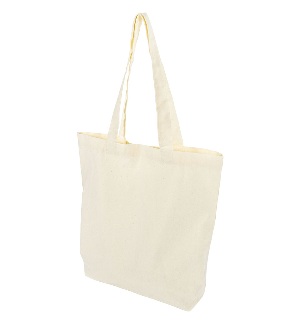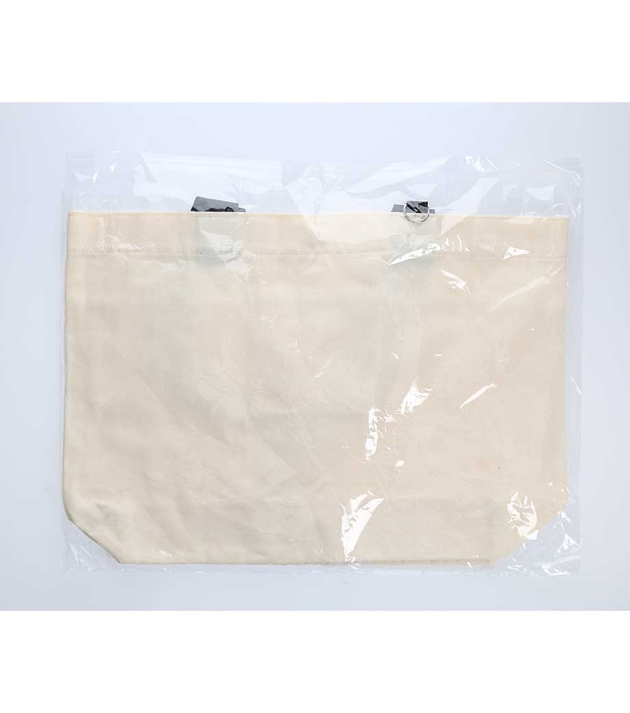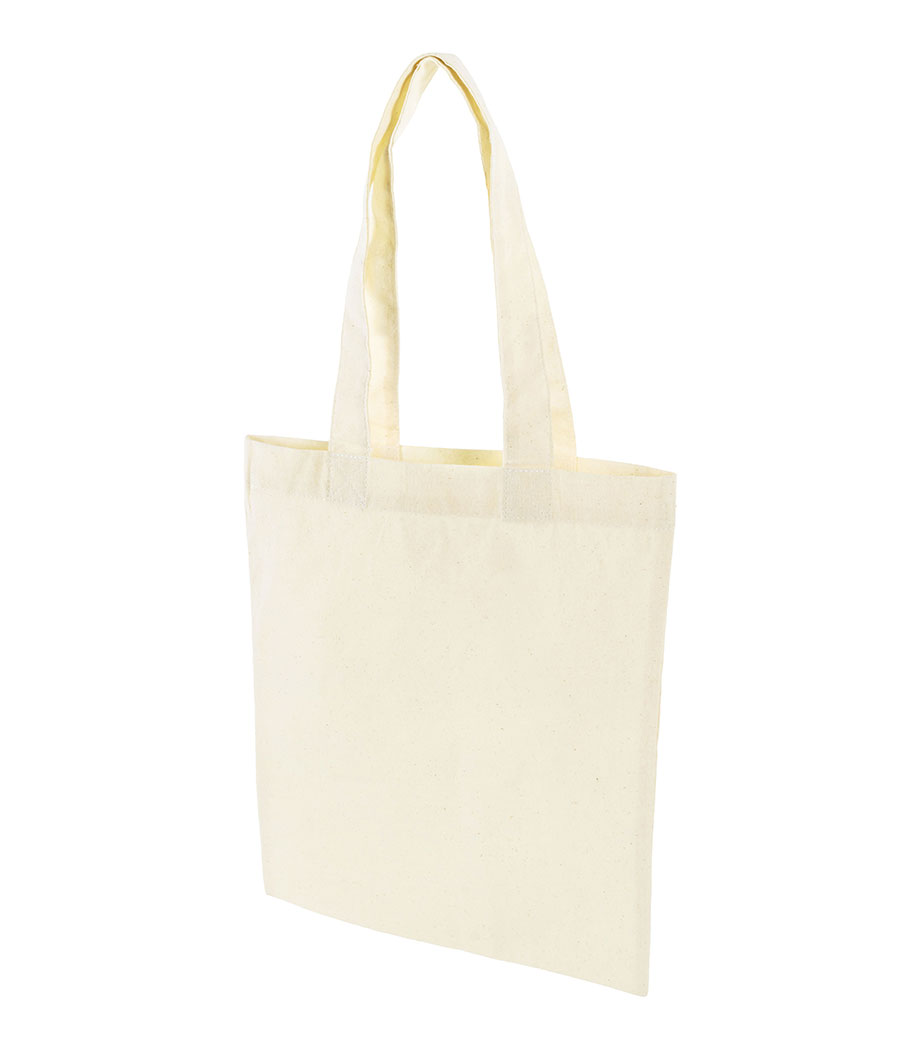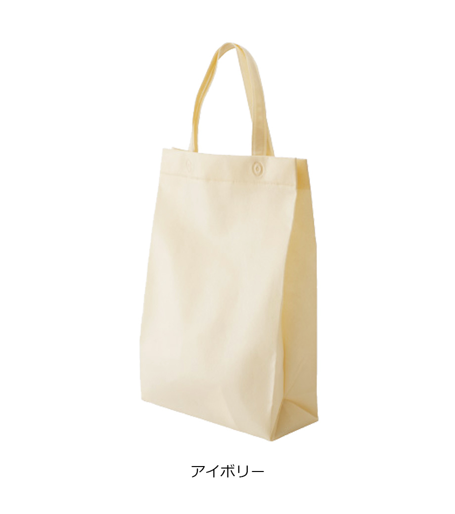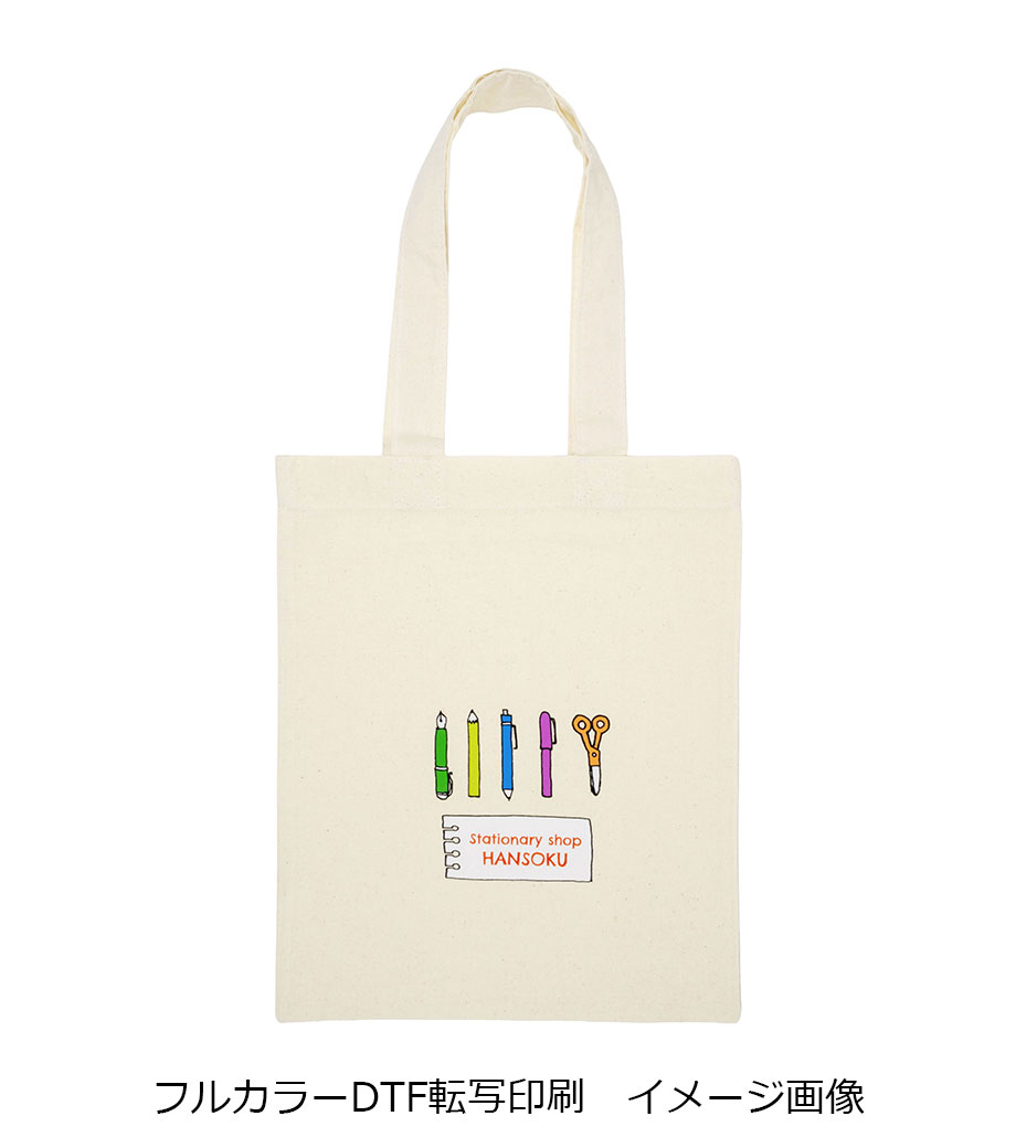 再生コットンを使った環境配慮型トートバッグ。A4対応で資料配布におすすめです。底マチ付きのため、資料以外にサンプルの配布にも便利です。持ち手は肩掛けしやすい長さ。生地はシーチングで中身がやや透ける程度の厚みです。展示会やセミナー、各種イベントで活躍します。