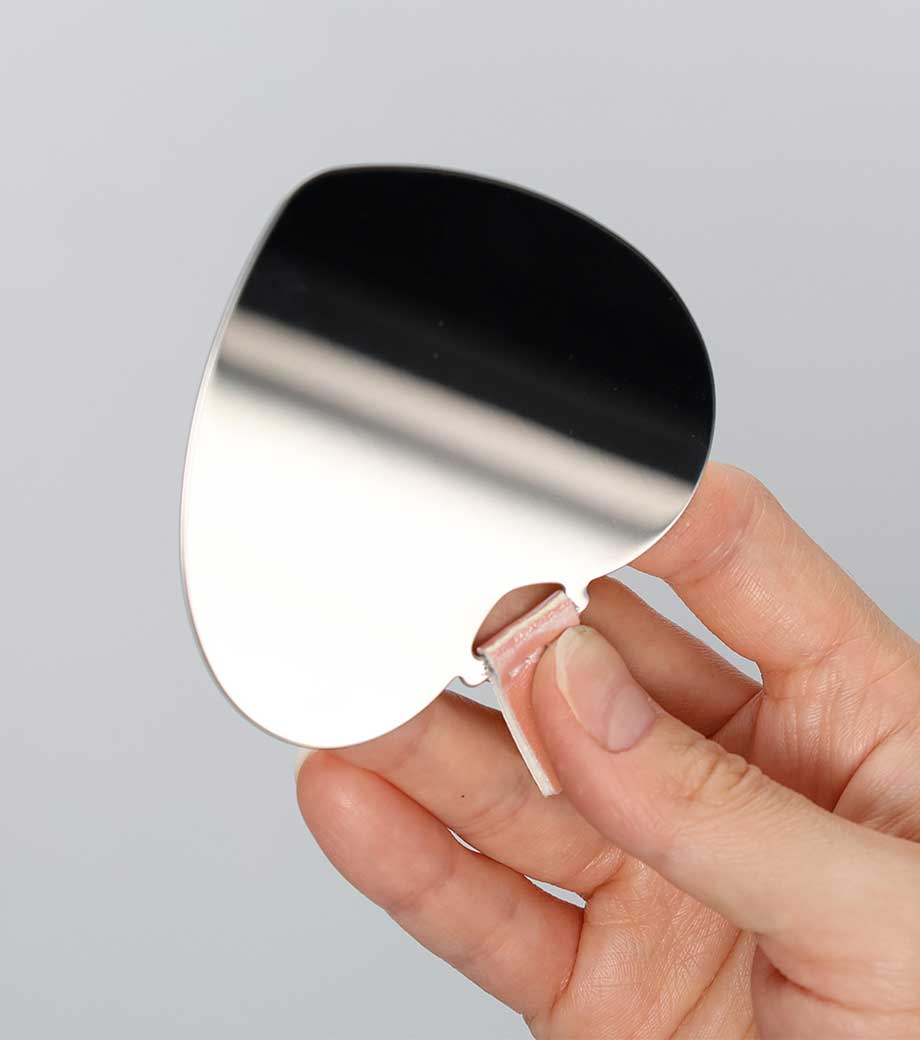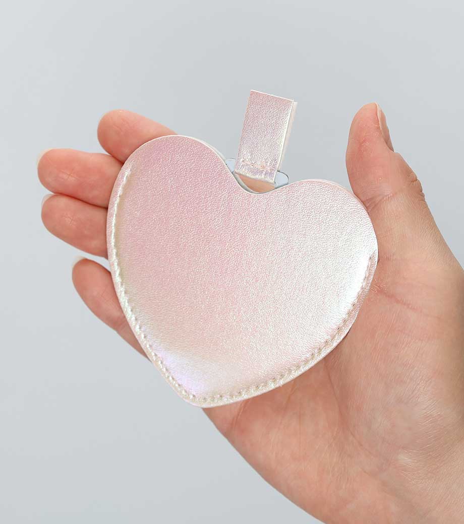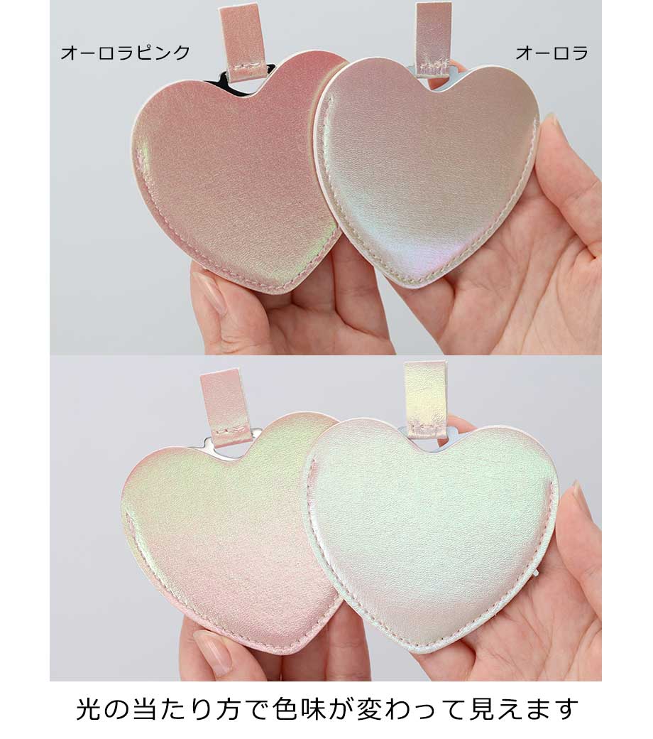 見ているだけで気分が高まる、可愛らしいハート型のミラーです。カバーに光が当たるとオーロラのようにツヤっと輝いておしゃれ。スリムなプレートタイプでかさばらず、持ち手やカバーが付いているので鏡面に汚れや傷が付きにくいです。普段使いにぴったりで、学生から大人の女性まで幅広く愛用いただけます。
