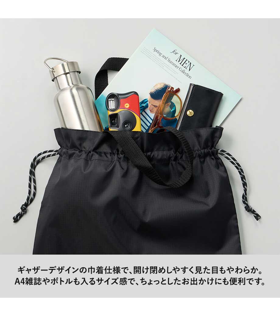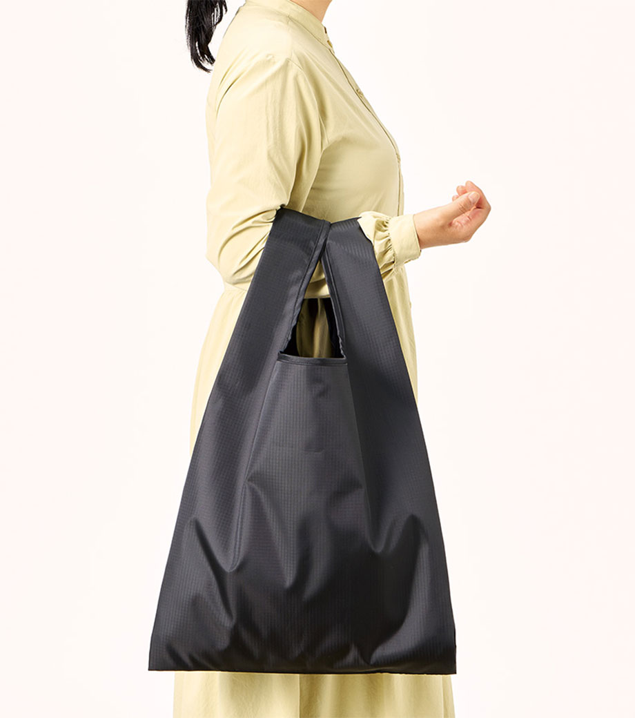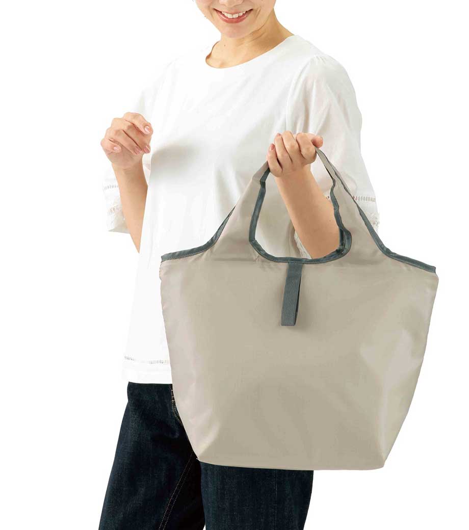 しなやかな光沢とさらっとした手触りが心地よい、ファインライトポリ素材の舟形バッグです。超薄手・超軽量でありながら、お買い物に嬉しい大容量サイズを実現。持ち手にはデザインのアクセントにもなるテープハンドルを採用。持ちやすさにもこだわりました。折りたたんで付属のゴムで留めればコンパクトに携帯できます。
