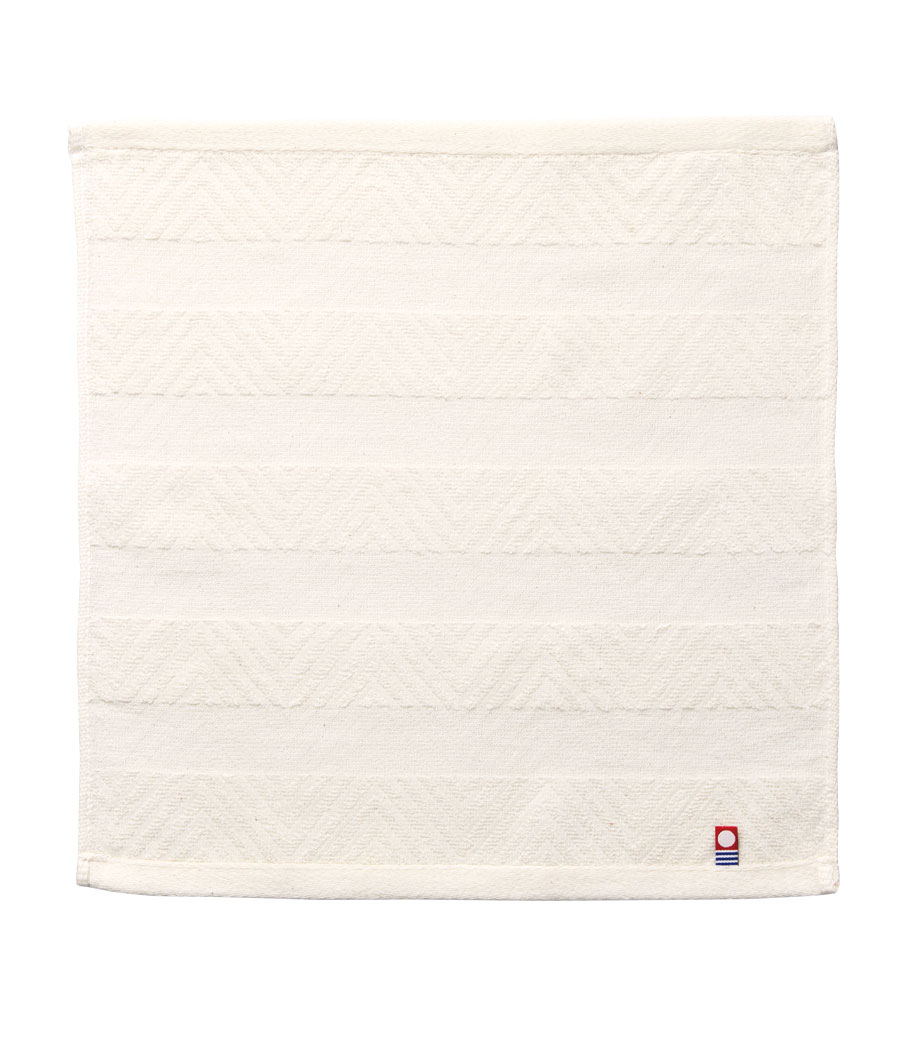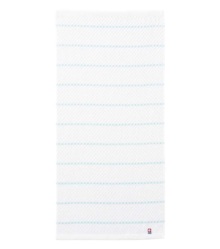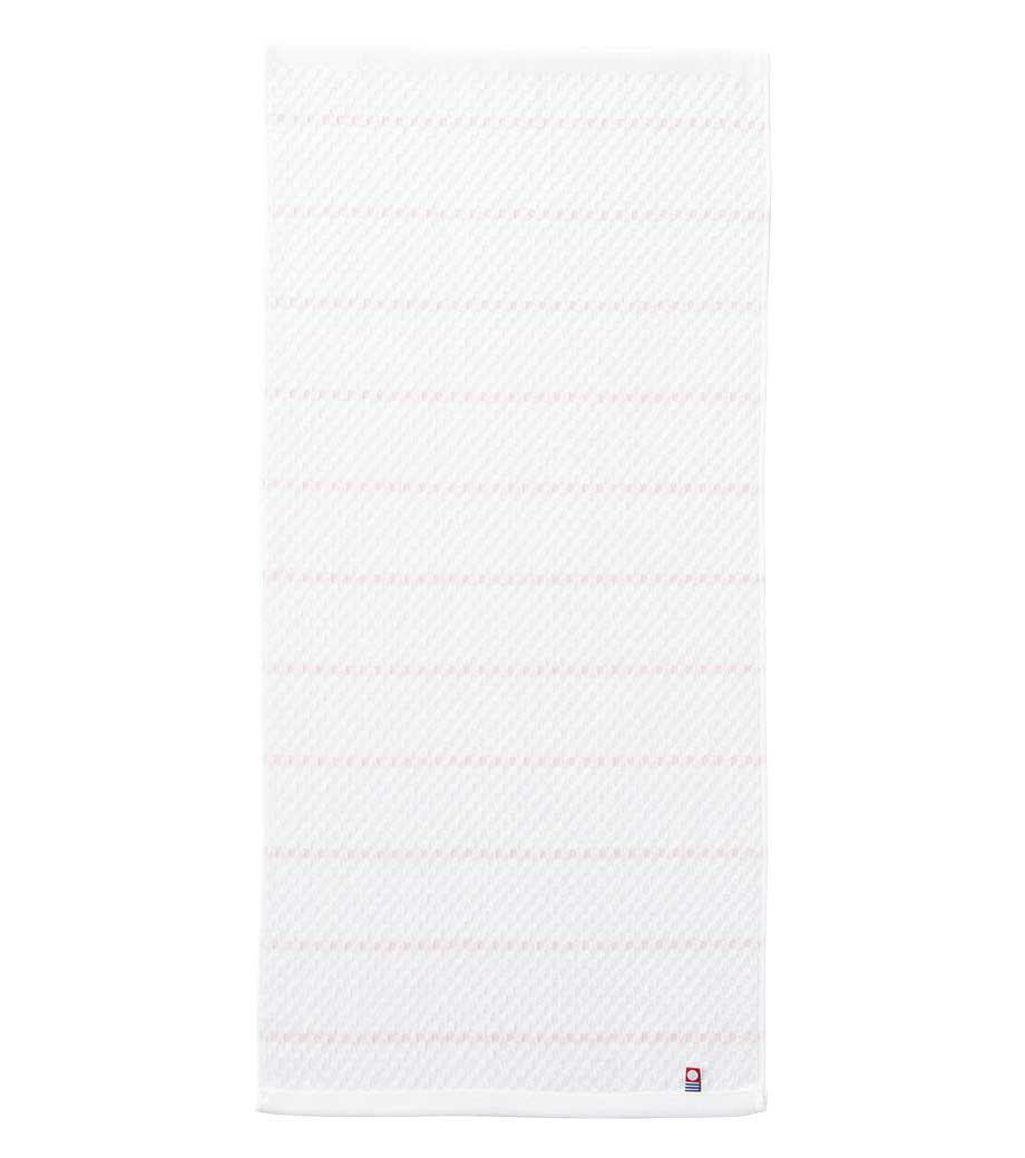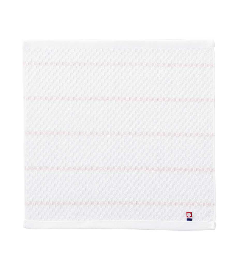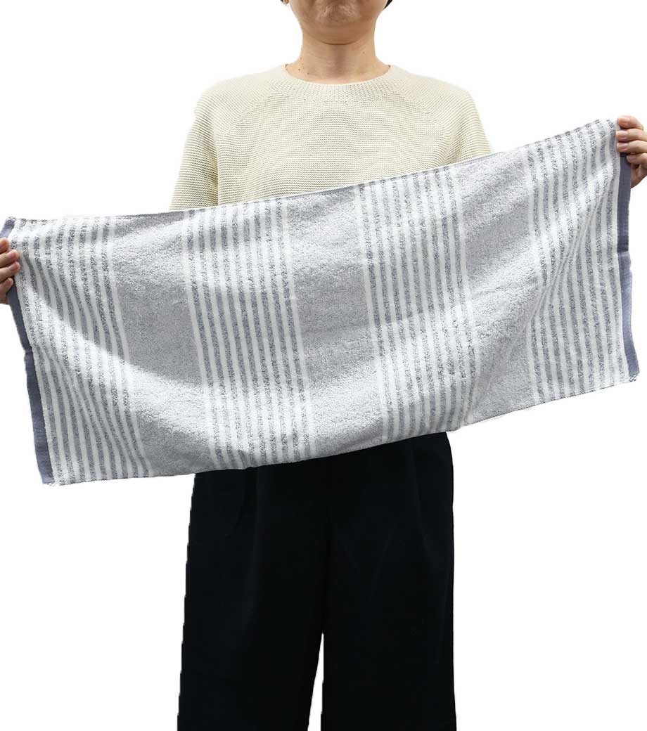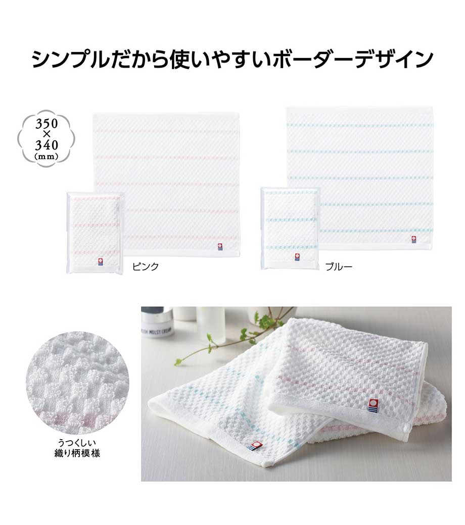 タオル産業の本場として知られる今治で作られた、安心品質のフェイスタオルです。爽やかなボーダー柄に加え、生地表面には市松のようなさりげない織り柄が入っています。日常使いしやすいシンプルさの中に、上品さも感じられるデザインです。