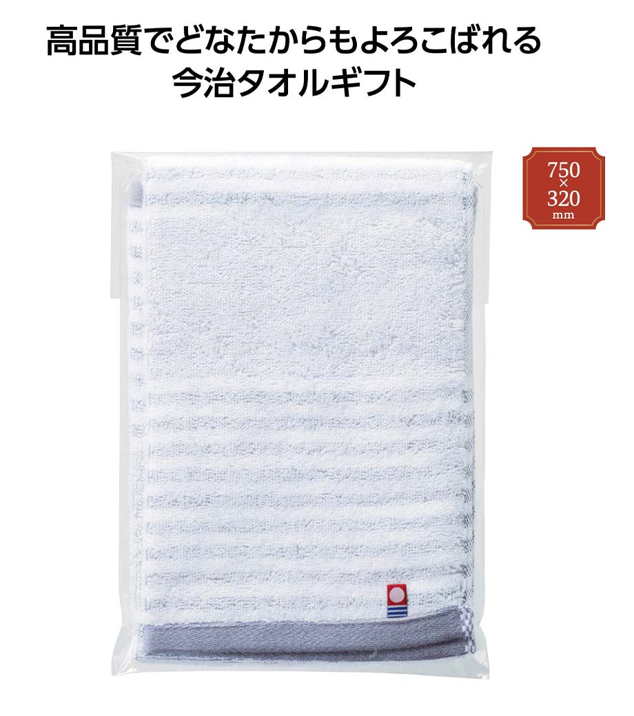 暮らしにすっと馴染む、シックなボーダー柄のフェイスタオルです。独自の審査基準を満たした今治タオルブランド認定商品で、ふんわり柔らかい肌触りと高い吸水性が魅力。安心品質のノベルティです。日常的に使いやすいサイズ感で、幅広い年代の方に喜ばれます。