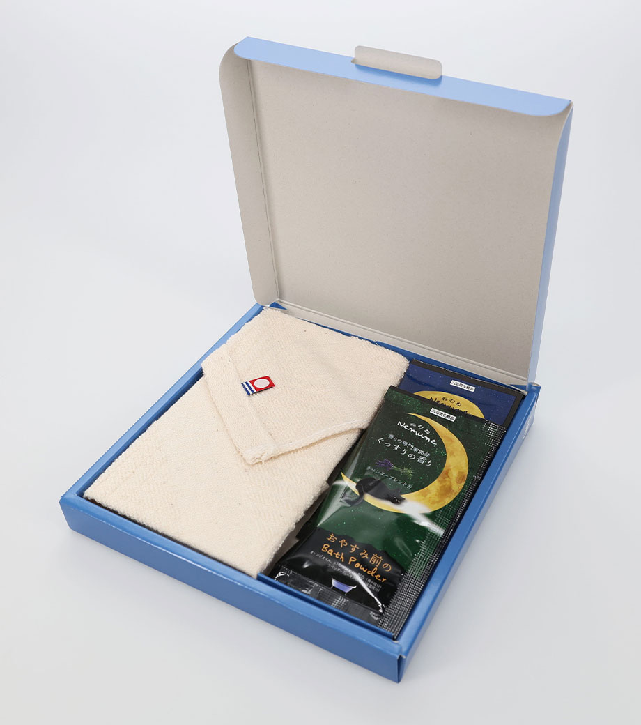 日本最大のタオル産地「今治」製のハンドタオルと、入浴剤2包がセットになったギフトノベルティ。入浴剤は、ラベンダーブレンドとシトラスブレンドの香り。ナチュラルカラーの今治タオルと相まって、ご自宅でのリラックスタイムに最適なセットです。