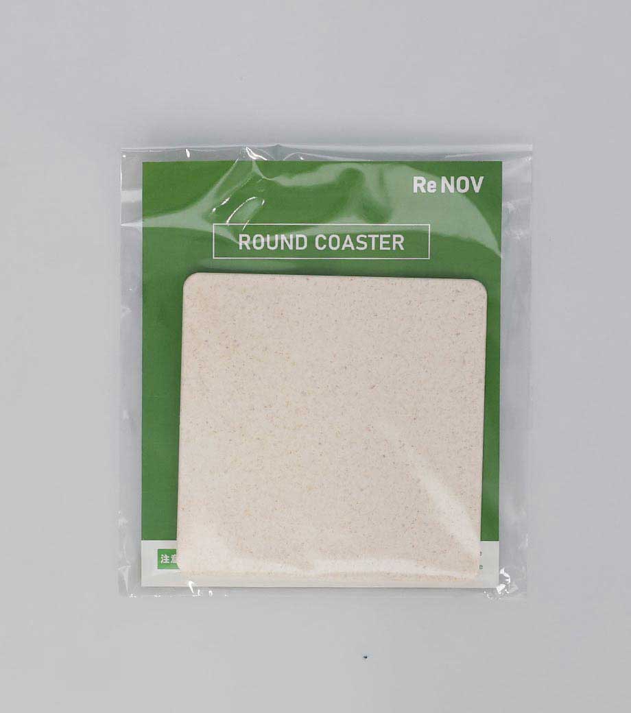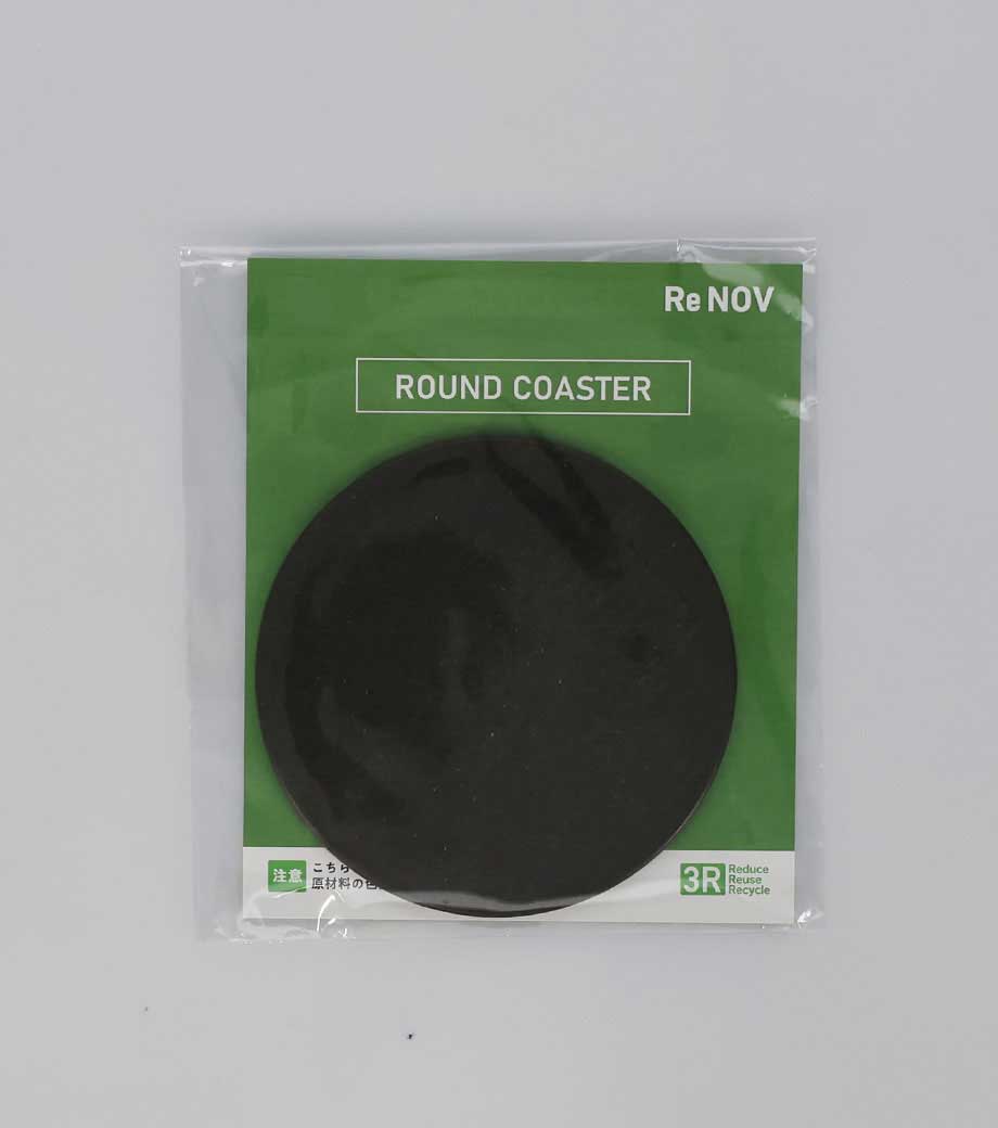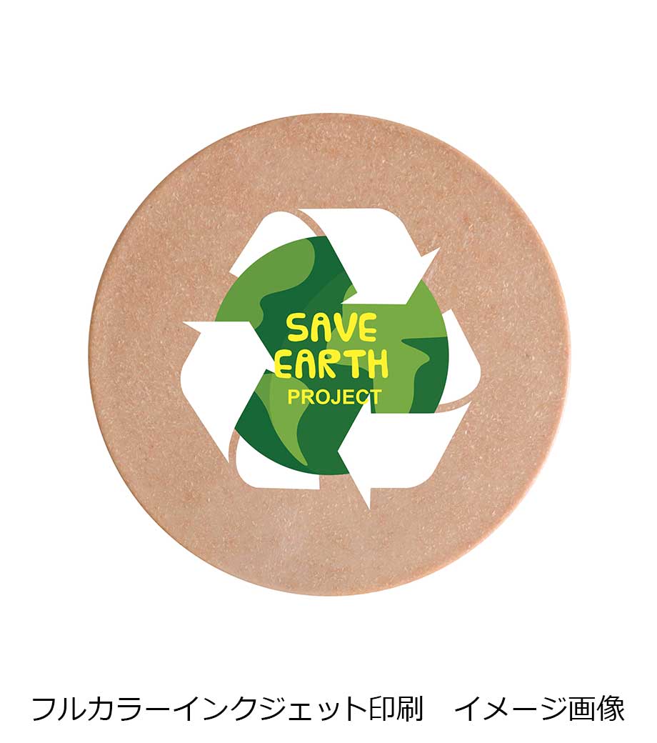 日本製のリサイクル素材を使った国内加工のノベルティグッズ。丸型のコースターはエコなイメージの色味3色をご用意しました。原材料に商品にならなかったコーヒー・お茶・木くずが使われていています。