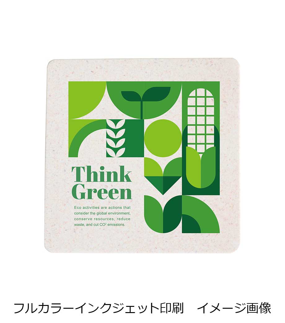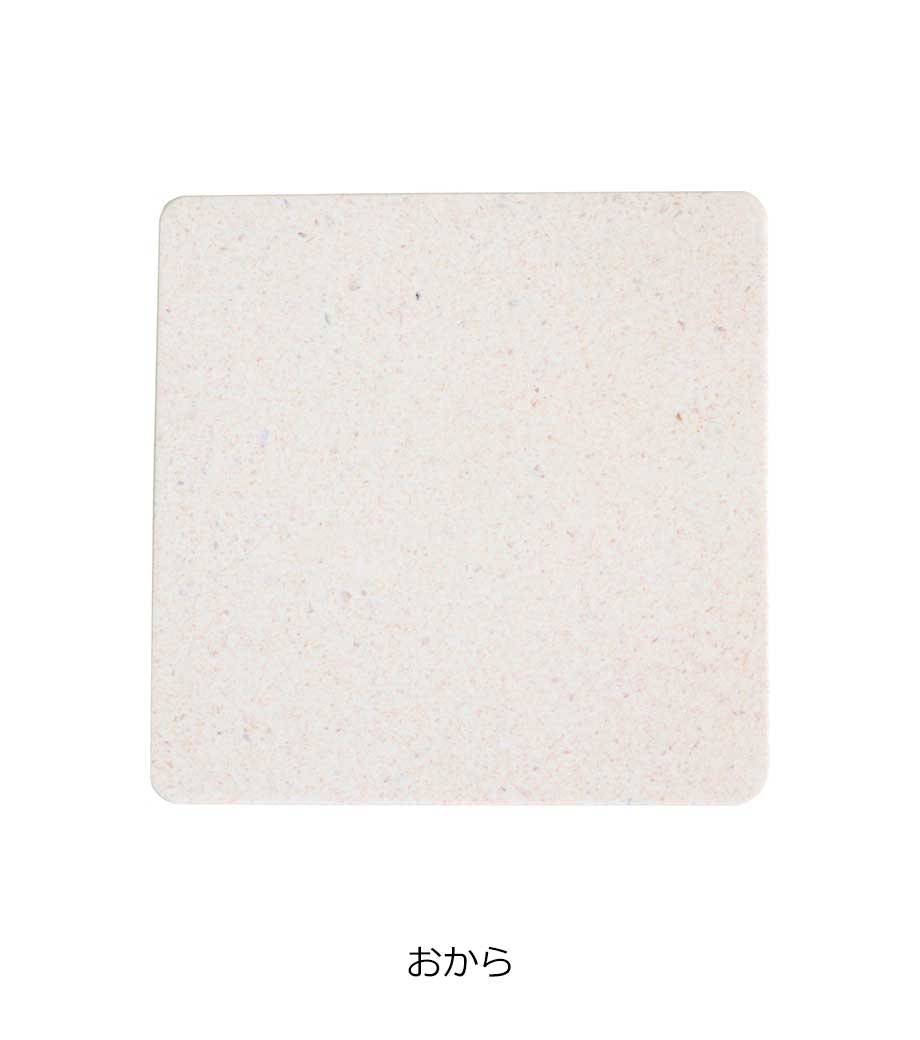 日本製のリサイクル素材を使った国内加工のノベルティグッズ。四角いコースターでエコなイメージの色味3色をご用意しました。原材料に商品にならなかったコーヒー・おから・お茶が使われていています。