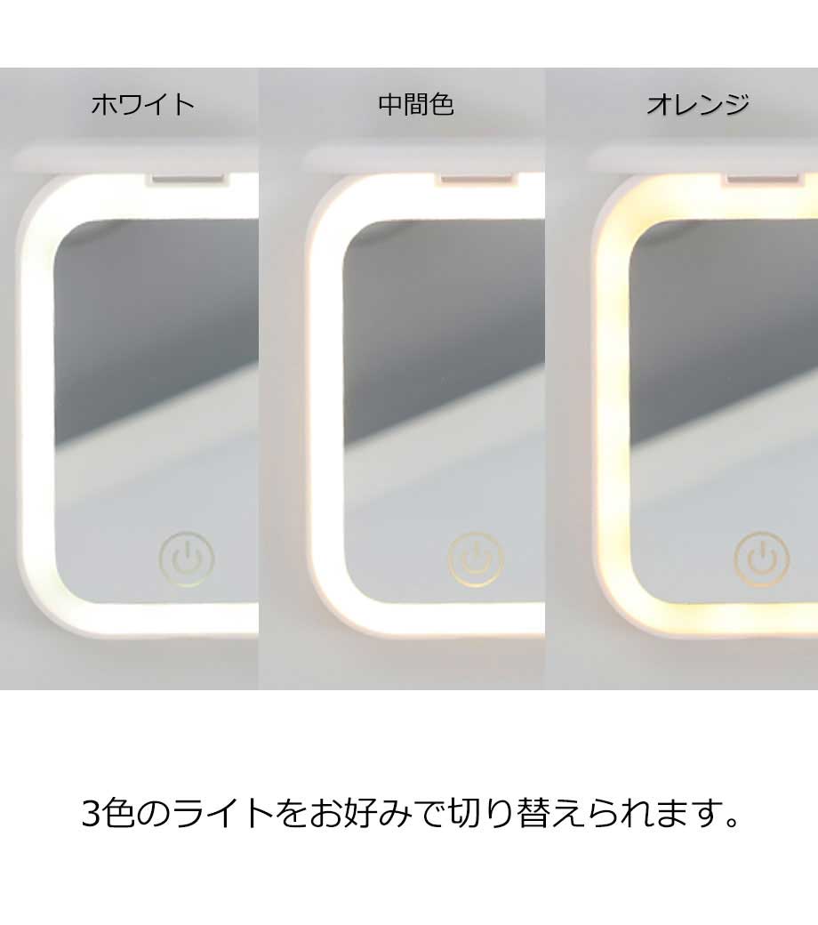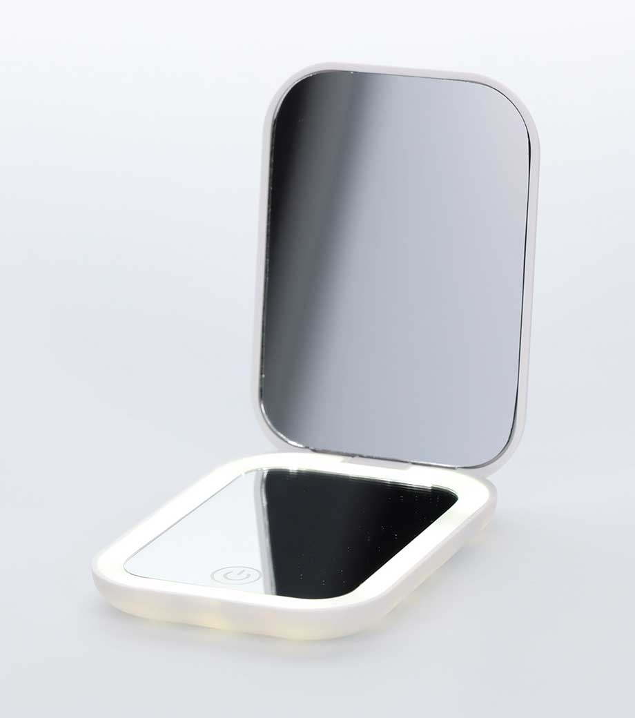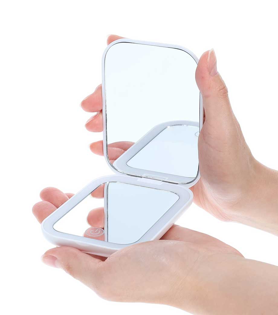 鏡とライトが一体型になった便利なコンパクトミラー。ワンタップで電源のオン・オフや明るさ調節もラクラク。顔をふんわり明るく照らしてくれるから、影ができにくくメイクがスムーズに。ホワイト、オレンジ、中間色の3色ライトをお好みで切り替えられます。
