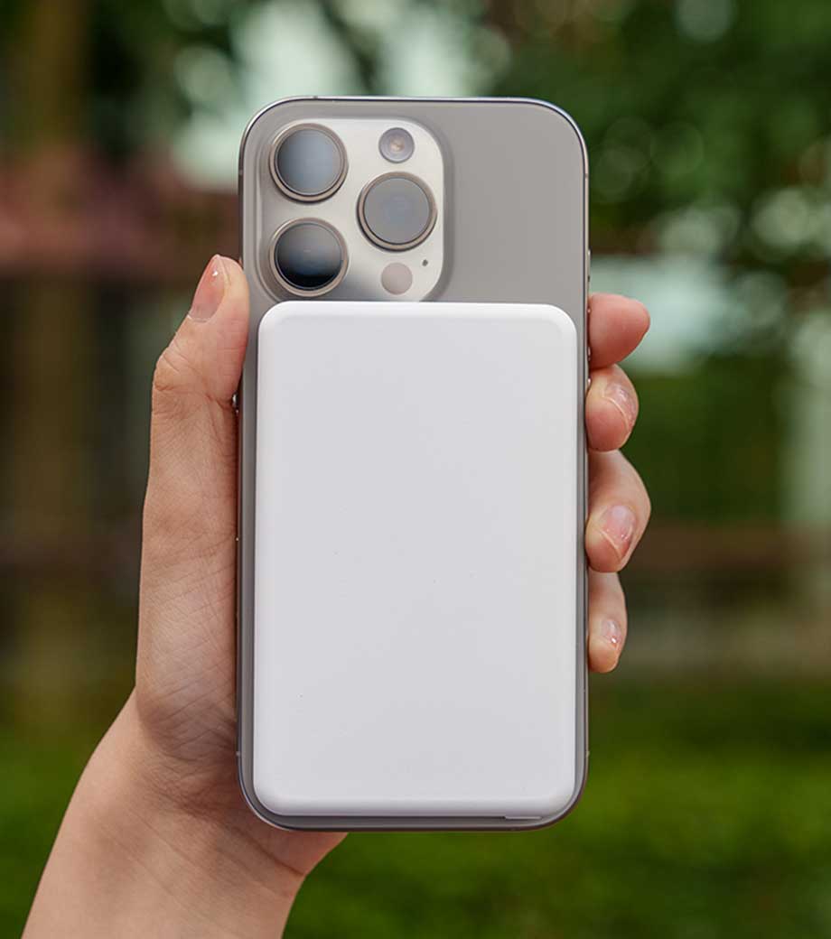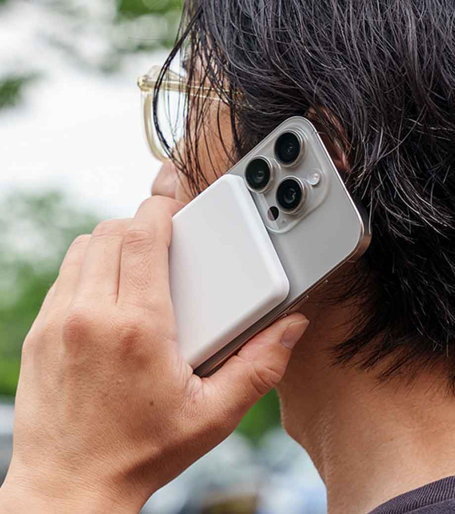 マグネットで貼るだけの手軽さが魅力のワイヤレスバッテリー。5000mAhは、標準的なスマートフォンを日常的に使用するのに十分な容量です。ケーブル不要で気軽に貼り付け充電でき、撮影や操作の邪魔にならずスマホでのオンライン会議にも便利です。