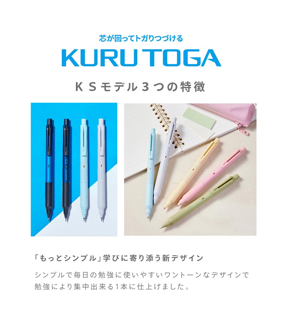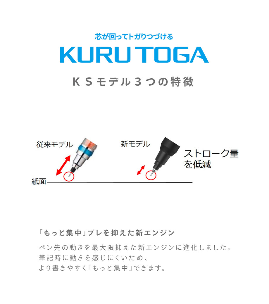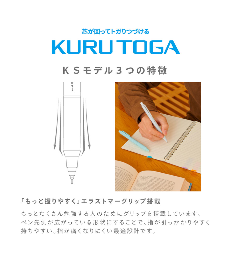 不動の人気を誇る「クルトガ」が、さらに書きやすく進化したKSモデル。極細の0.3mm芯タイプです。最新のクルトガエンジンでペン先のブレが最小限に。グリップは握りやすいエラストマーグリップで集中力アップ。グッドデザイン賞を受賞したデザインはシンプルで、使用シーンを選びません。