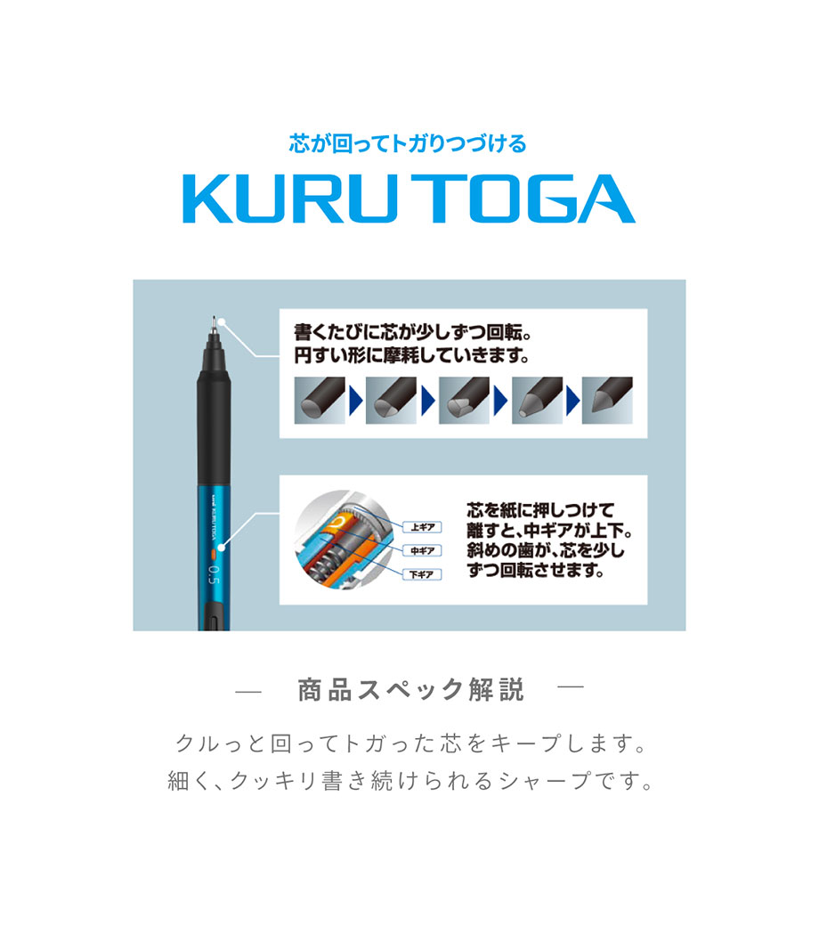 抜群の人気を誇る「クルトガ」が、さらに書きやすく進化したKSモデル。ポピュラーな0.5mm芯タイプです。ペン先のブレを最小限に抑えた最新のクルトガエンジンを搭載。グリップは握りやすいエラストマーグリップ。グッドデザイン賞を受賞したデザインはシンプルで、使用シーンを選びません。