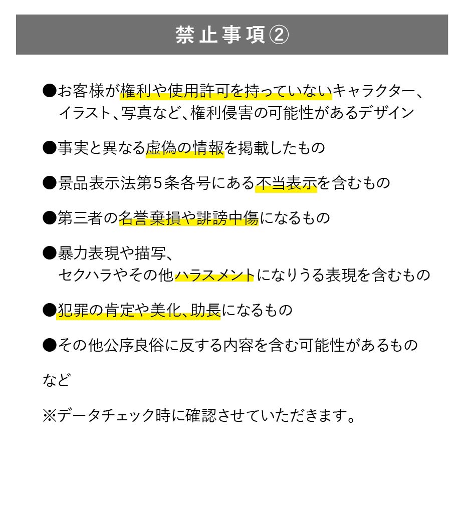 デザイン入稿後、印刷のイメージ画像を作成しお送りします。OKのお返事を頂いてから印刷を開始いたします。