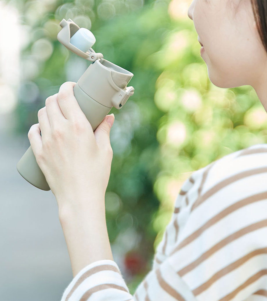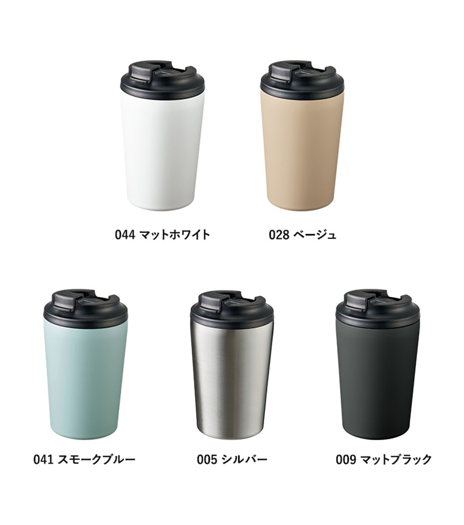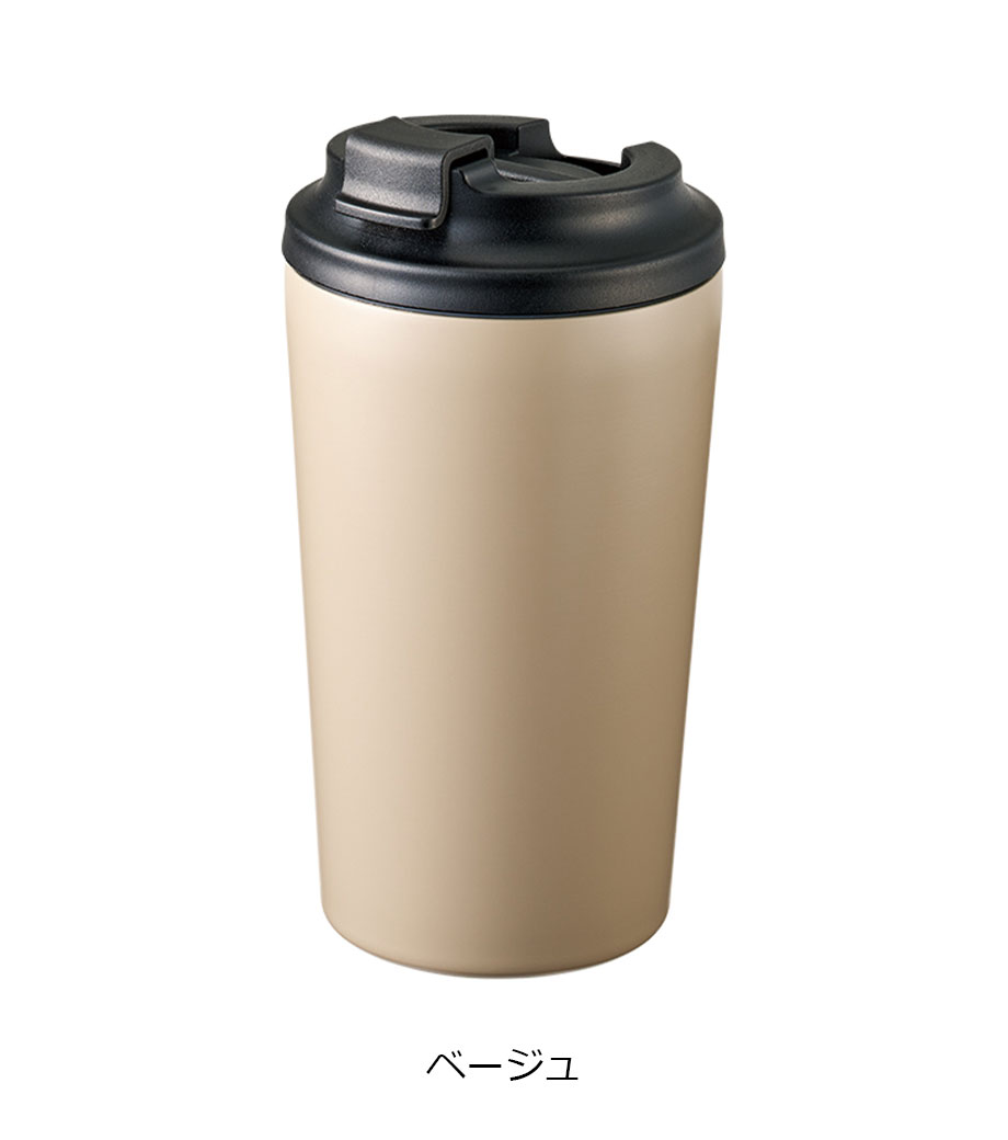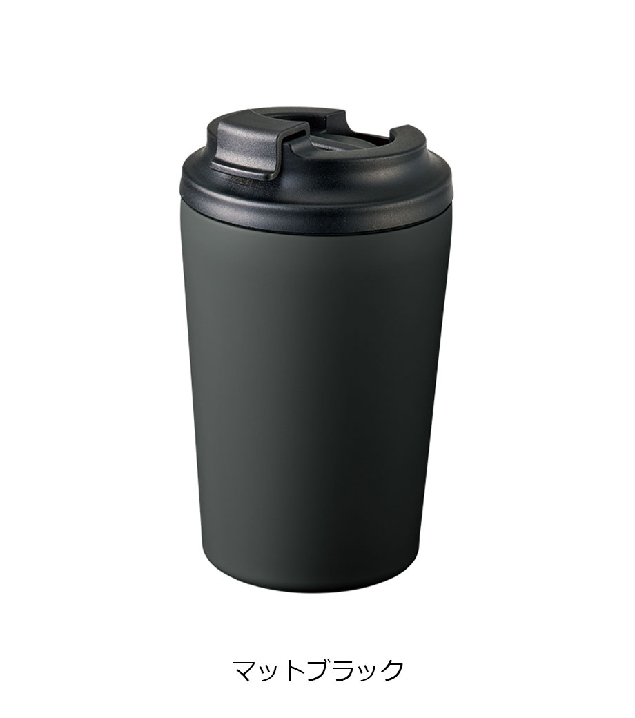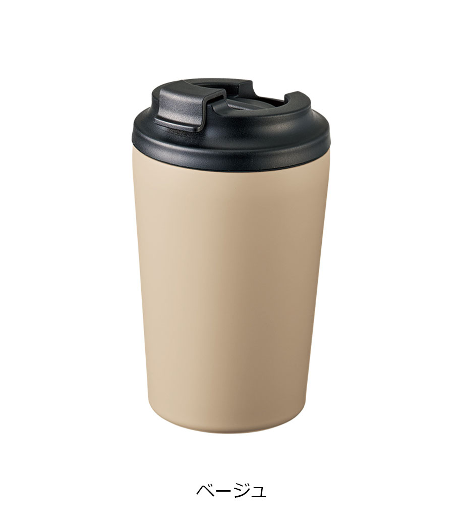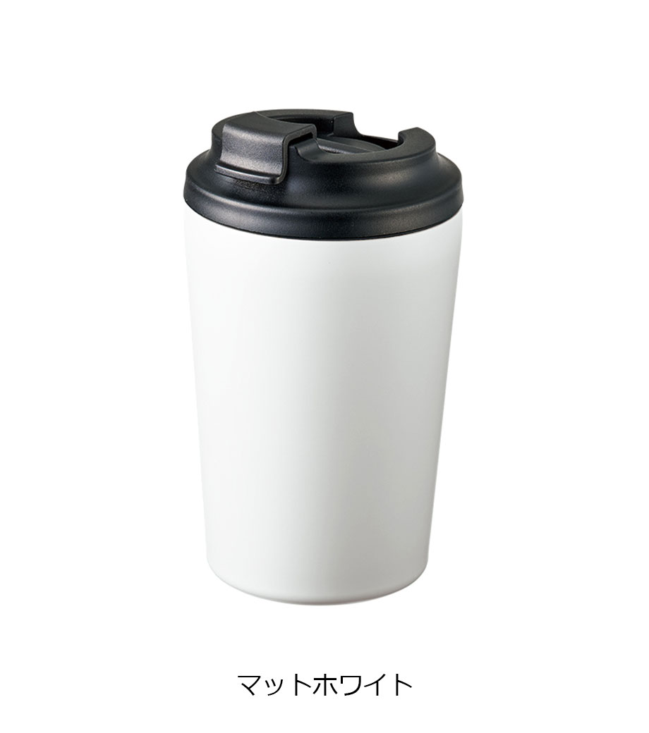 フタ付で保冷温効果が高い真空断熱二重構造。氷も楽々入る広い口径です。氷も解けにくいのでコンビニのコーヒーをそのまま移し替えて、いつもよりも美味しくいただけます。フタの飲み口は水滴が飛び散りにくい『グリップスライド機構』。容量は310mlです。