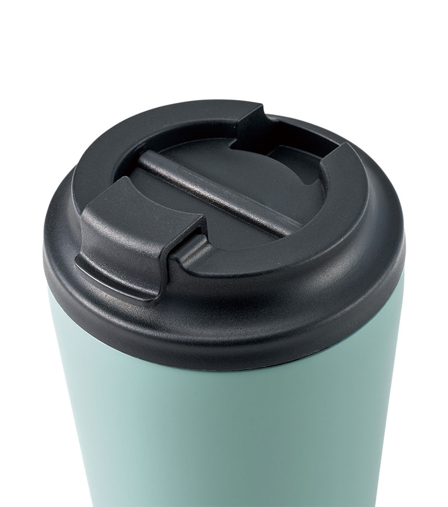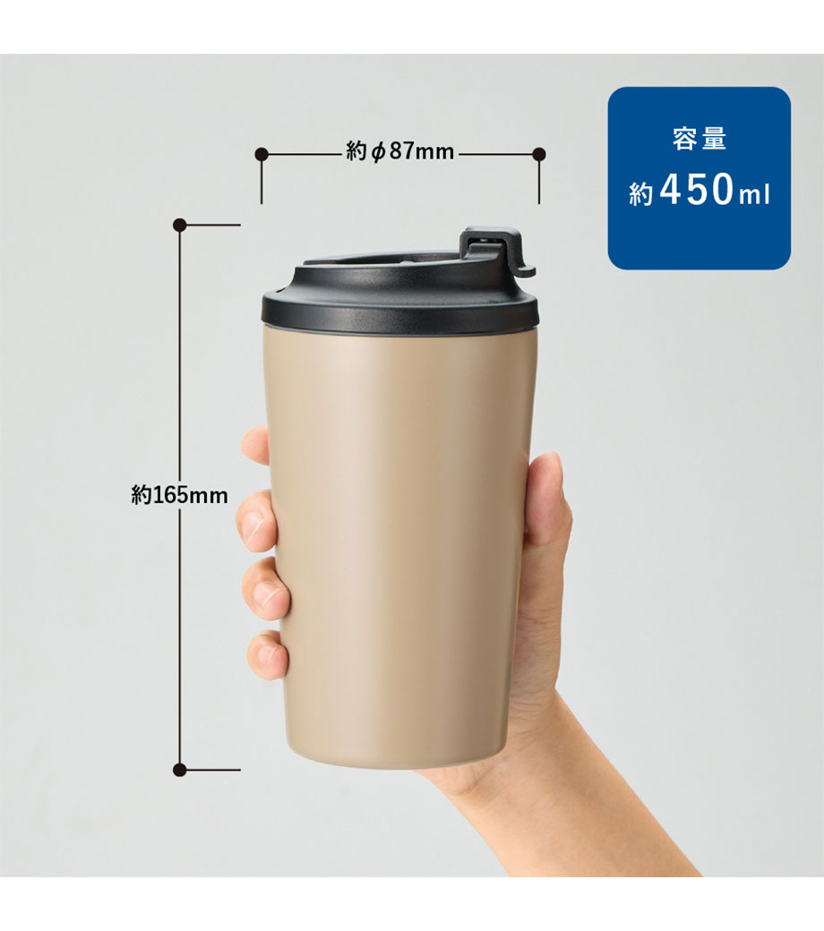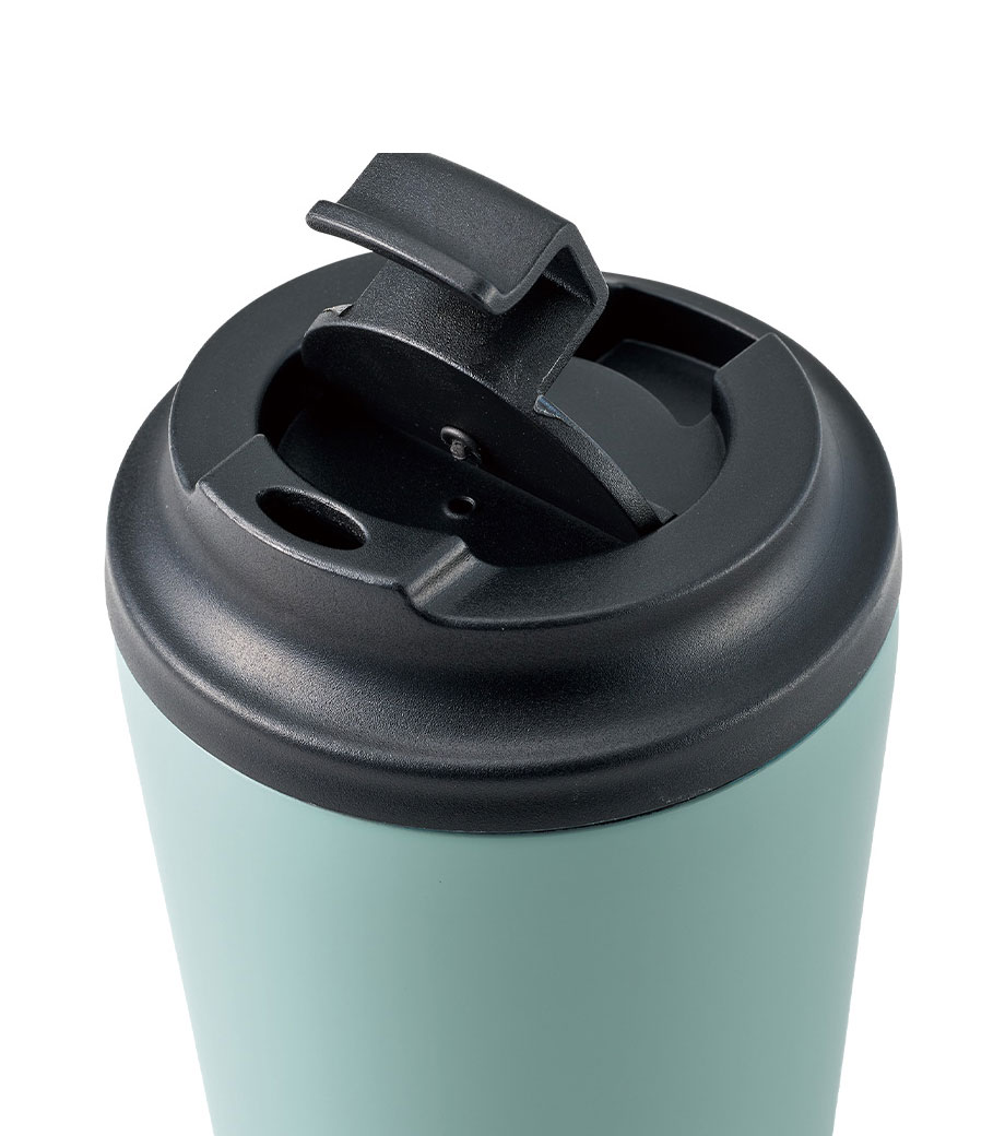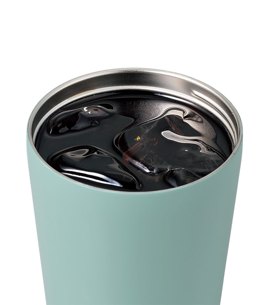 フタ付で保冷温効果が高い真空断熱二重構造。氷も楽々入る広い口径です。氷も解けにくいのでコンビニのコーヒーをそのまま移し替えて、いつもよりも美味しくいただけます。フタの飲み口は水滴が飛び散りにくい『グリップスライド機構』。容量は410mlです。