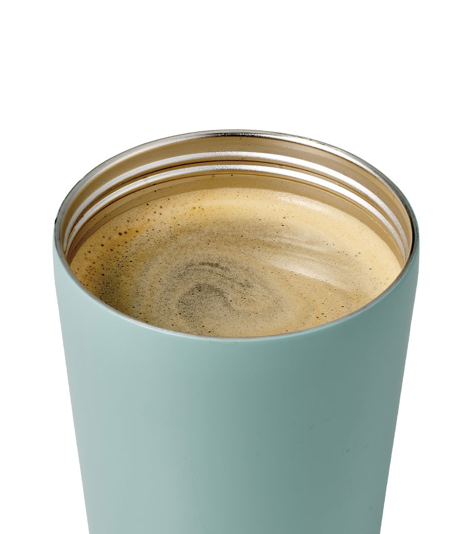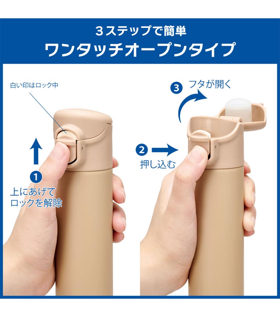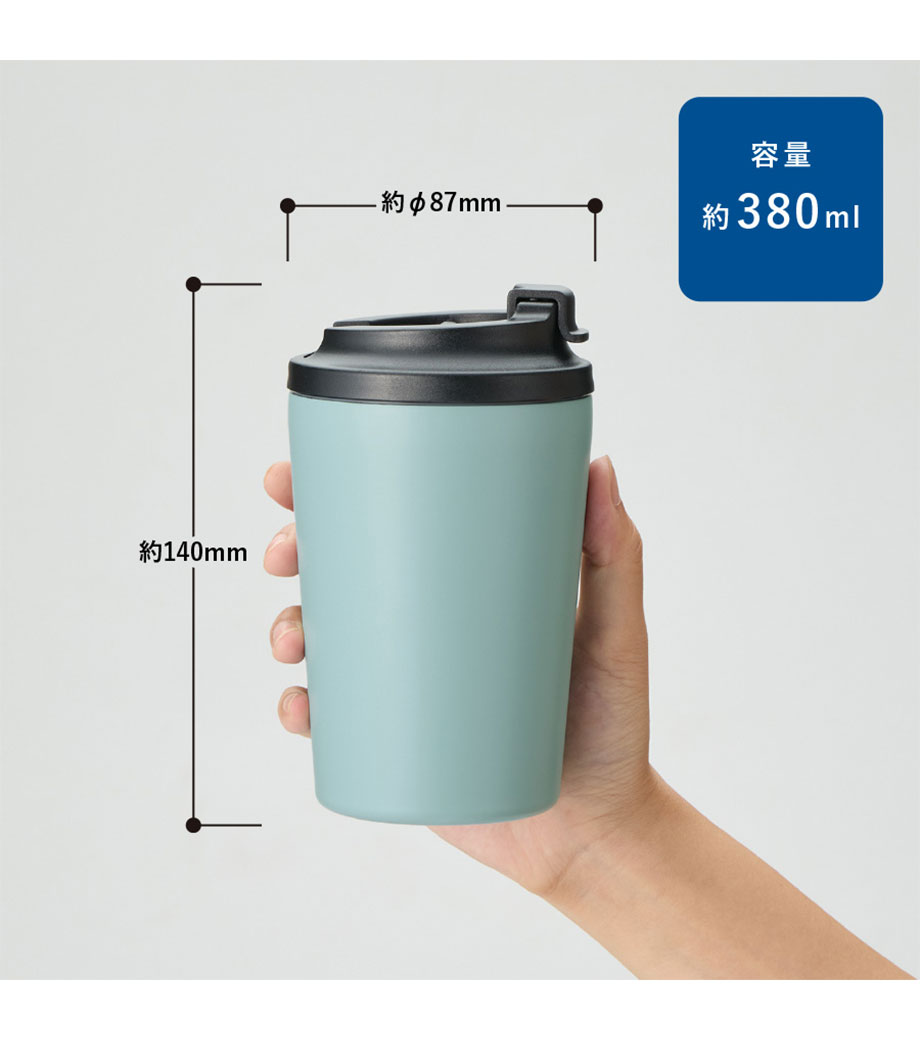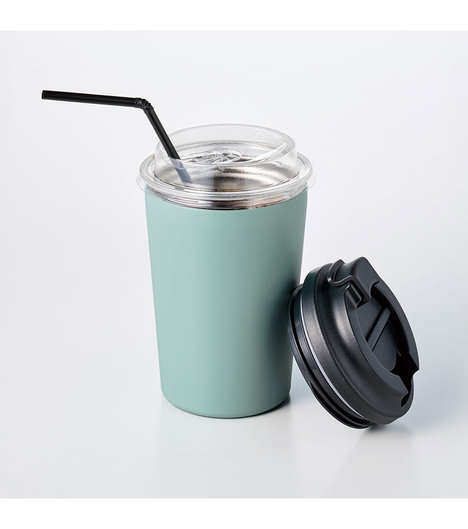 フタ付で保冷温効果が高い真空断熱二重構造。氷も楽々入る広い口径です。氷も解けにくいのでコンビニのコーヒーをそのまま移し替えて、いつもよりも美味しくいただけます。フタの飲み口は水滴が飛び散りにくい『グリップスライド機構』。容量は410mlです。