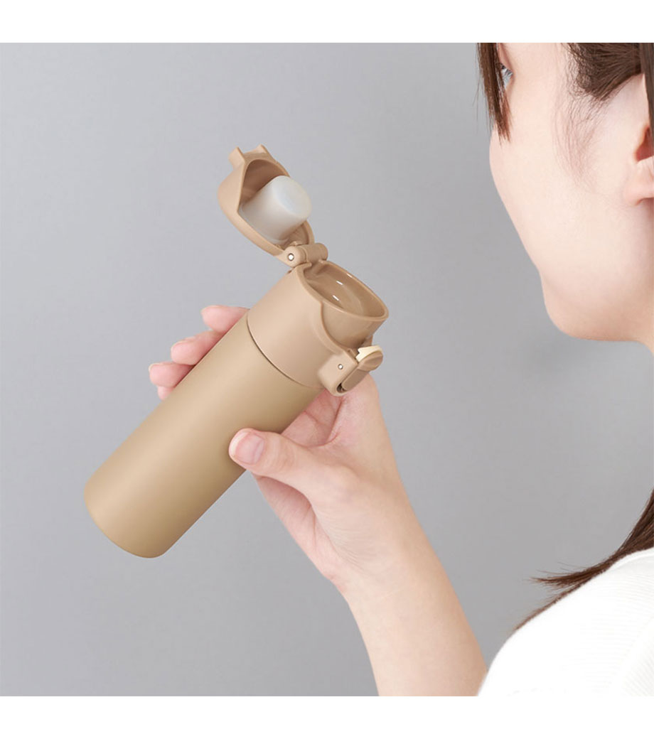 ワンタッチで開閉できる便利なボトル。保冷・保温効果が長く続く真空二重構造。お散歩や服薬用のお水を持ち歩くのに丁度いい140mlサイズです。安心のロック機構付き。小さいカバンにもすっぽり収まります。