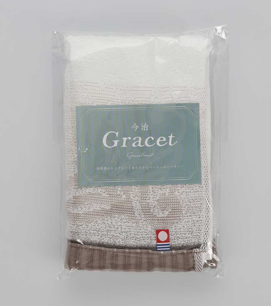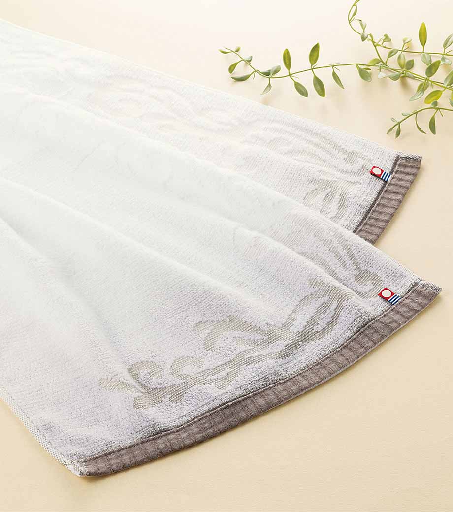 上品なボタニカル柄のジャガード織が魅力のフェイスタオルです。やわらかなグラデーションのグレージュカラーが高級感を演出します。安心の日本製。今治タオルならではの確かな品質で抜群の吸水性と速乾性があります。