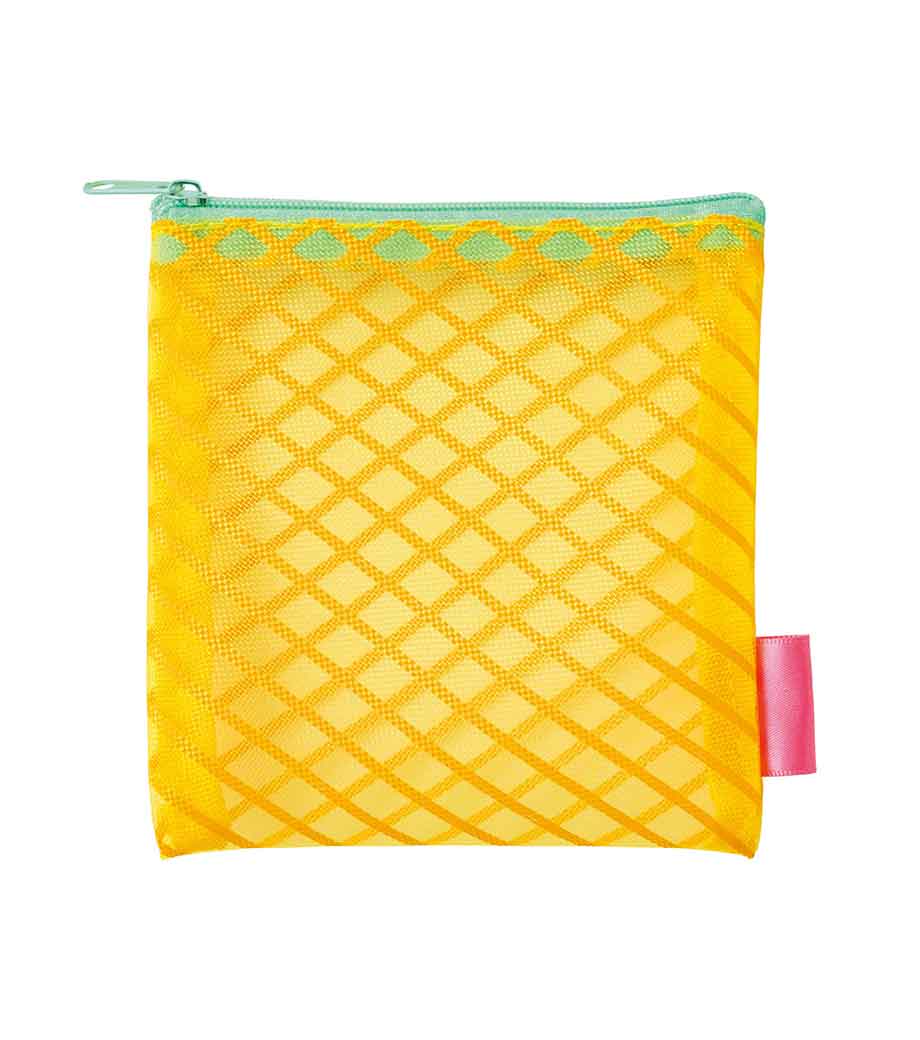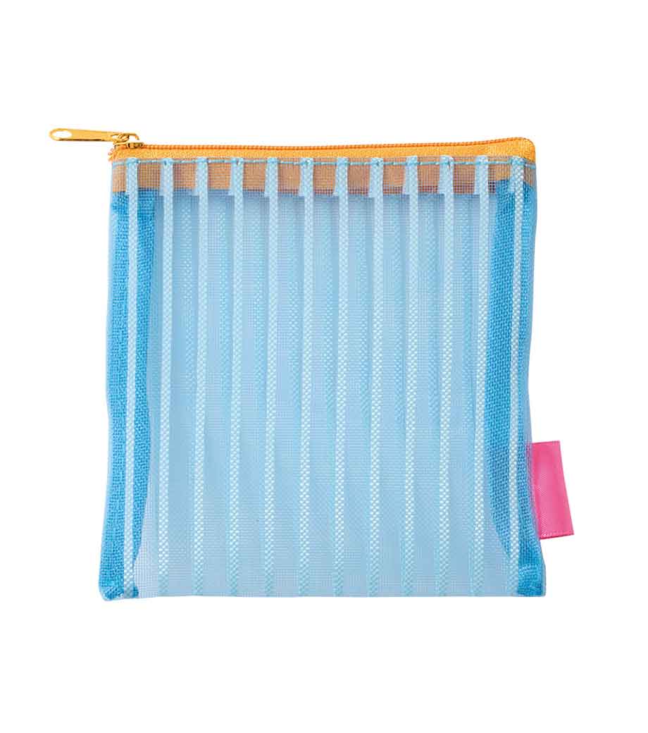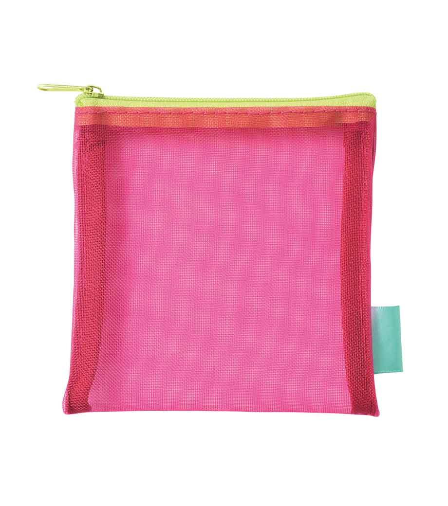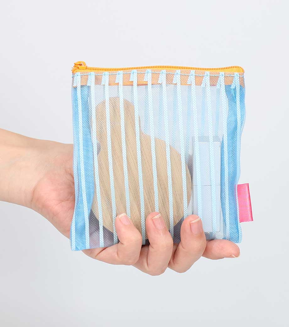メッシュ素材のコンパクトポーチ。トレンドのカラーブロック配色がポップで可愛らしいアイテムです。メッシュ素材なので中身がひと目で確認でき、取り出しもスムーズ。リップやヘアゴムなどの細かなアイテム収納にぴったりサイズ。バッグの中でもかさばらないフラットタイプです。