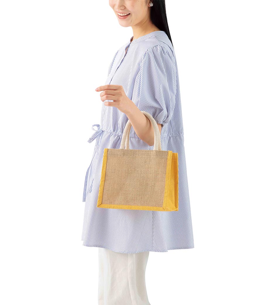 環境配慮とデザイン性を両立したジュート素材のバッグ。マチ付きで500mlペットボトルやお弁当箱がすっきり収まるサイズ感。サイド部分にカラーを効かせたバイカラーデザインが、さりげないアクセントに。シンプルすぎず、ほどよく個性を演出できます。ランチタイムはもちろん、ちょっとした外出やサブバッグとしても活躍。
