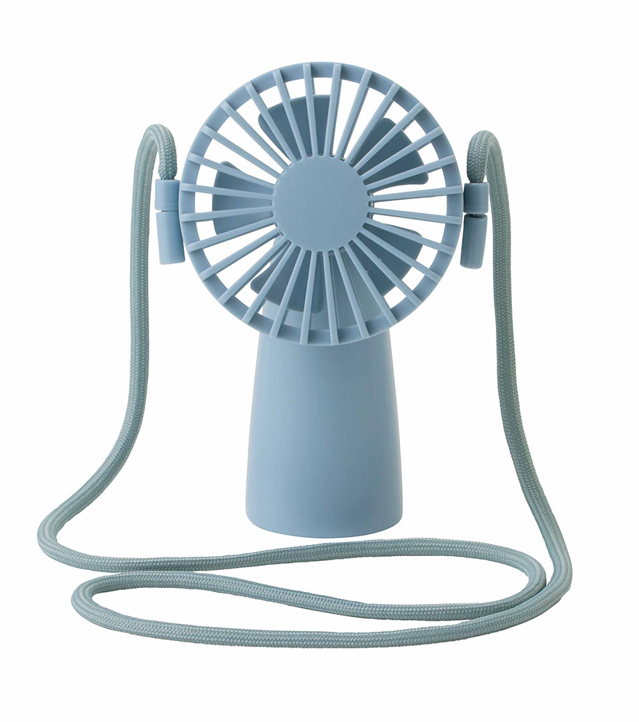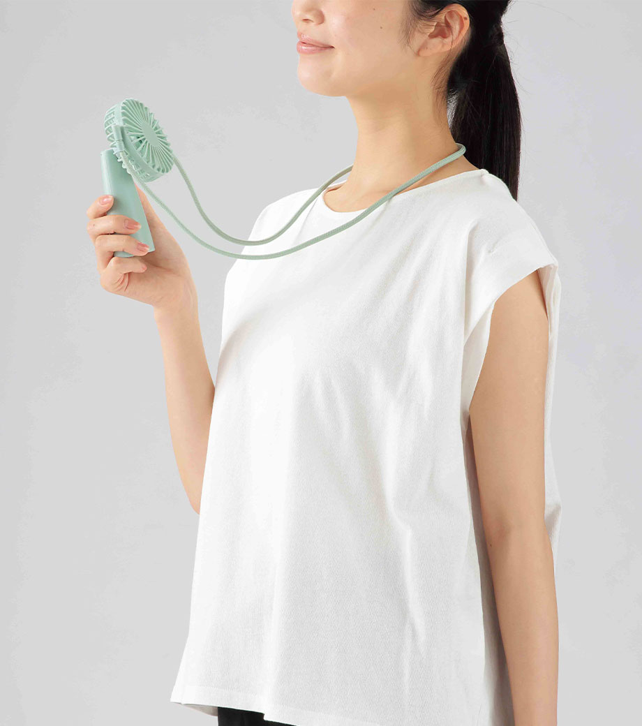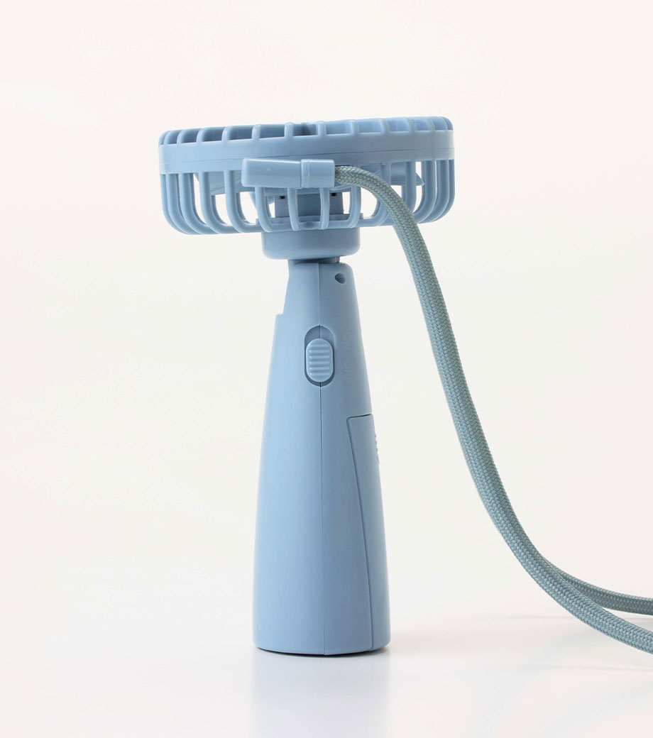 卓上と首提げを2wayで使えるハンディファン。充電不要の電池式で、家でも外出先でも使えます。スイッチはスライド式の簡単仕様。付属のネックストラップは長さ調節が可能です。くすみカラー2色を取混ぜでお届けします。