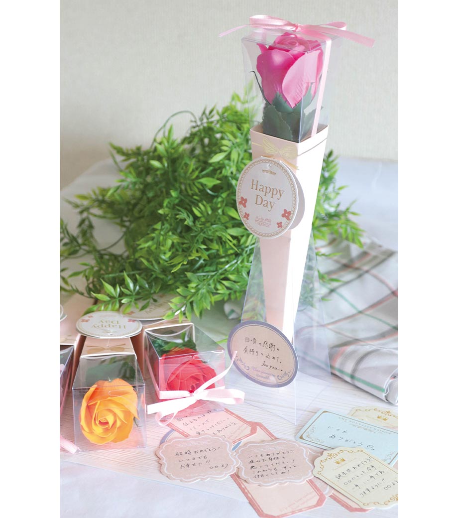 華やかな5色取混ぜでお届け。しっかりとした透明ケース入りで、タグの裏はメッセージカードとして使用できます。そのまま渡せるギフト品質も嬉しいポイント。ウェディングの送賓ギフトや、女性向けイベントのノベルティにおすすめ。「わあっと驚く笑顔」を演出できる、センスの光る一品です。