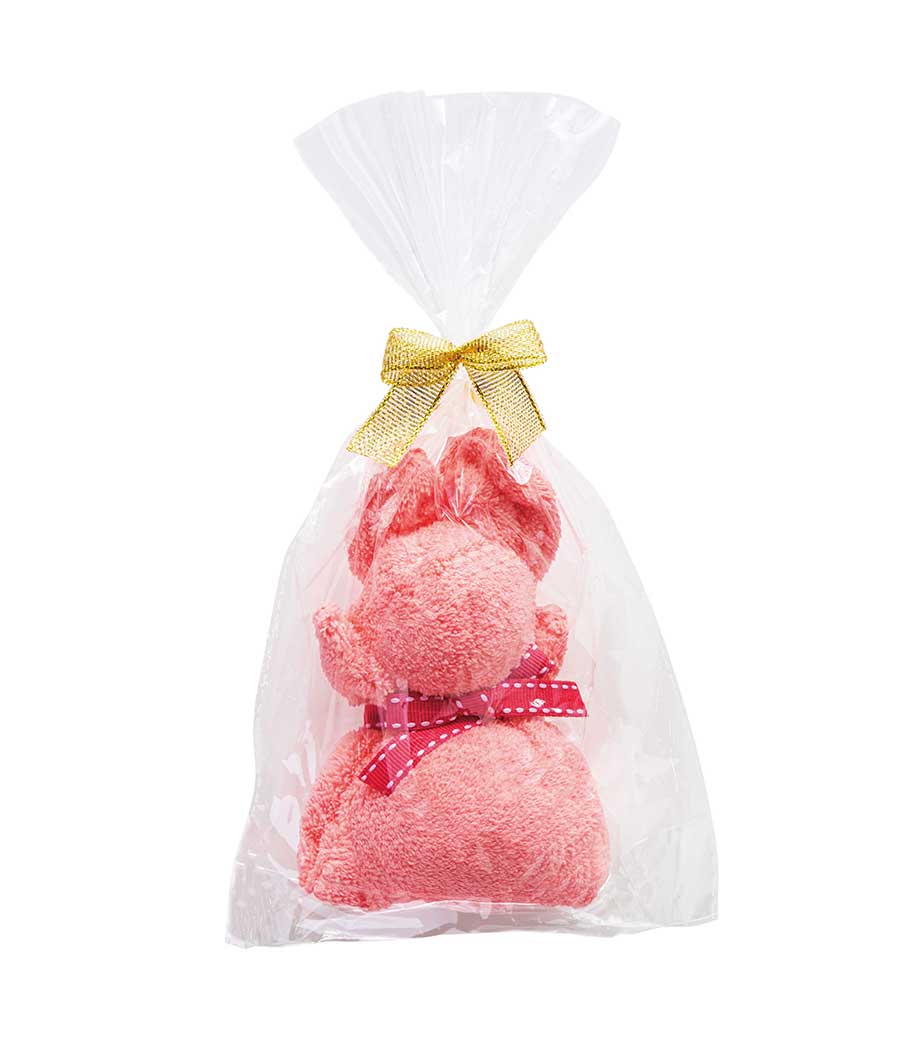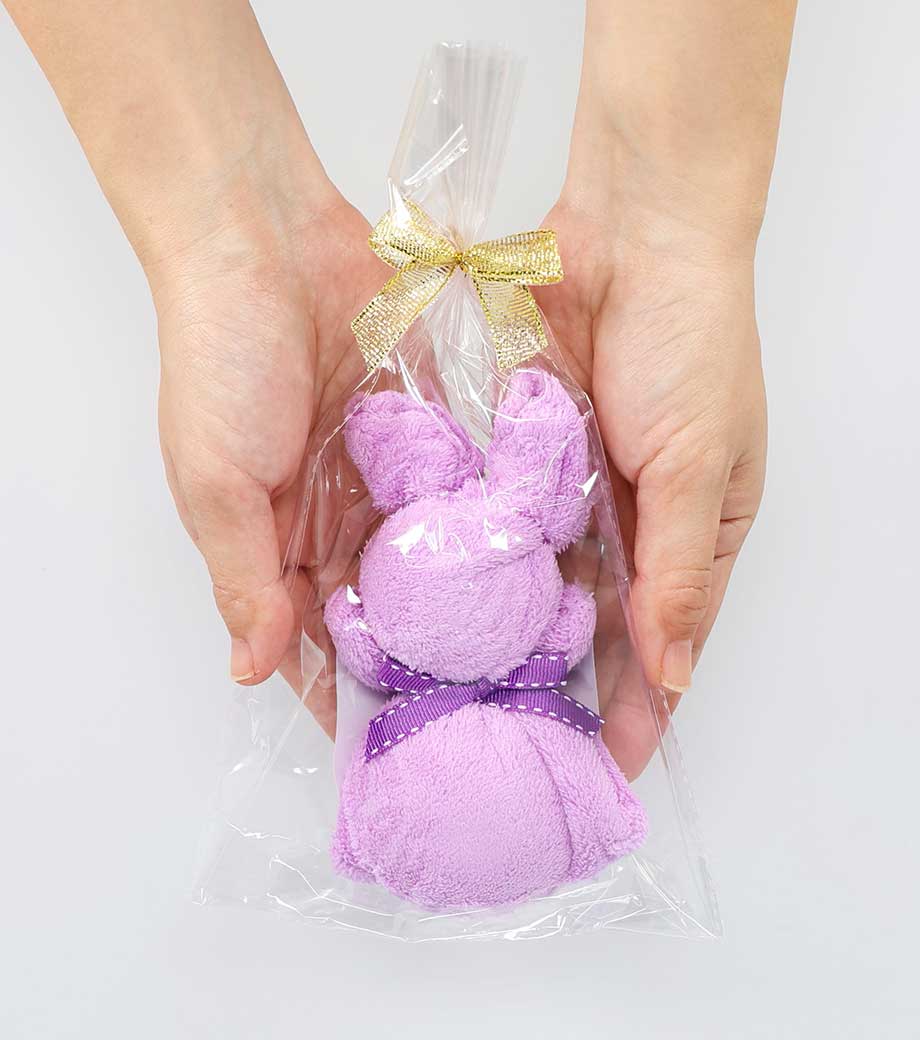 愛らしいウサギ型にアレンジされたプチギフトタオル。広げるとハンカチタオルとして使えます。マイクロファイバー素材で使い心地ふんわり。パッケージはリボン付きの袋入りなので、そのまま配布できます。ディスプレイでたくさん並べると可愛さも相まって注目度バツグンです。ファミリーイベントでのばらまきや商業施設のキャンペーンなどにおすすめ。小さなお子さまにも喜ばれるアイテムです。