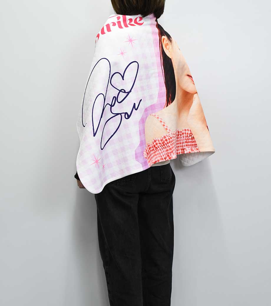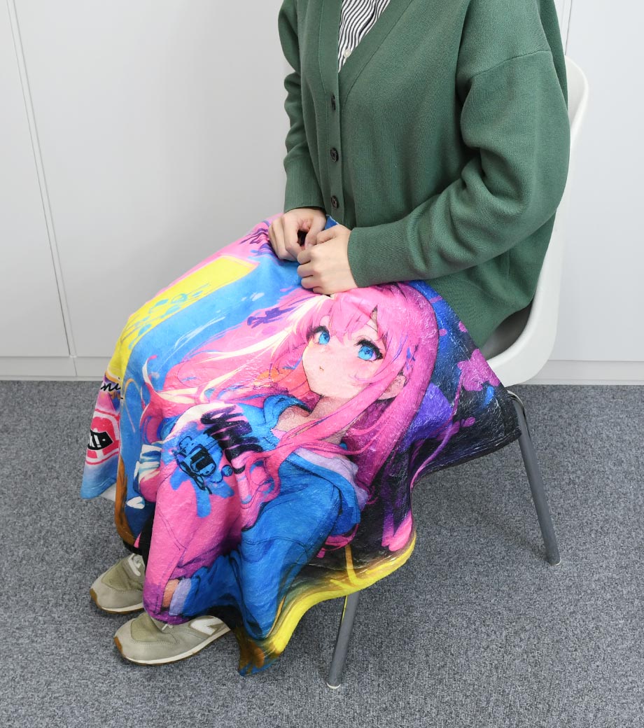 全面フルカラー印刷でインパクトと実用性を兼ね備えたブランケットです。イラストや写真も色鮮やかに表現できる昇華転写印刷で、オリジナルデザインの魅力をしっかり表現します。アーティストのファンクラブグッズや同人グッズ、ショップのオリジナルグッズなどの作成にぴったりです。