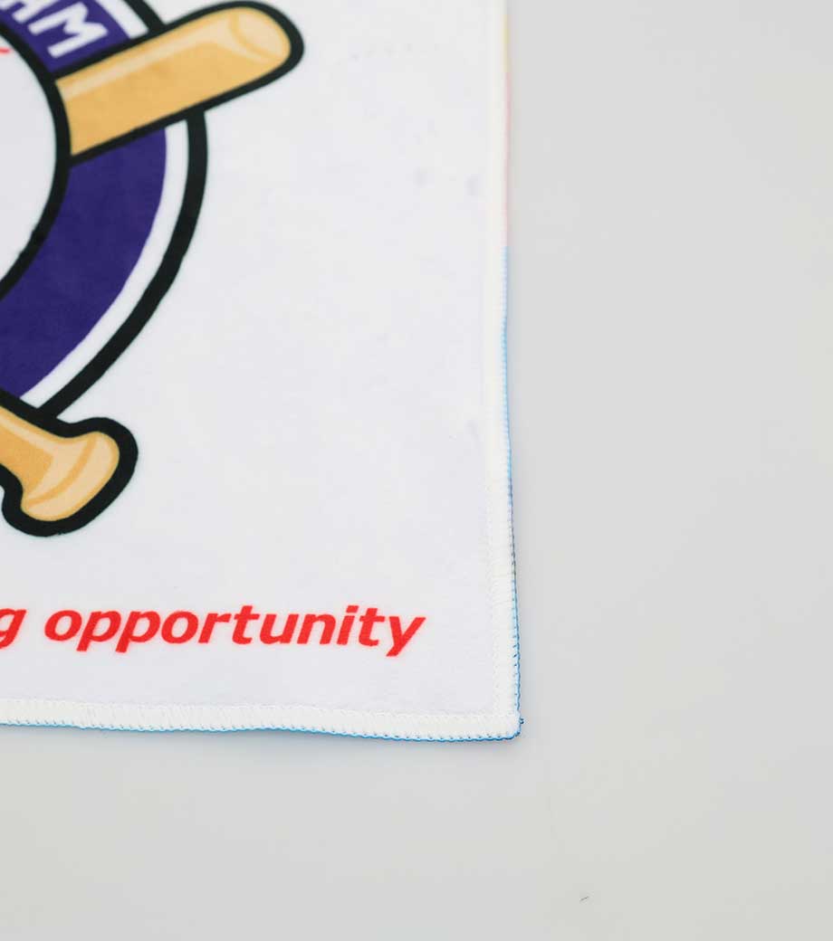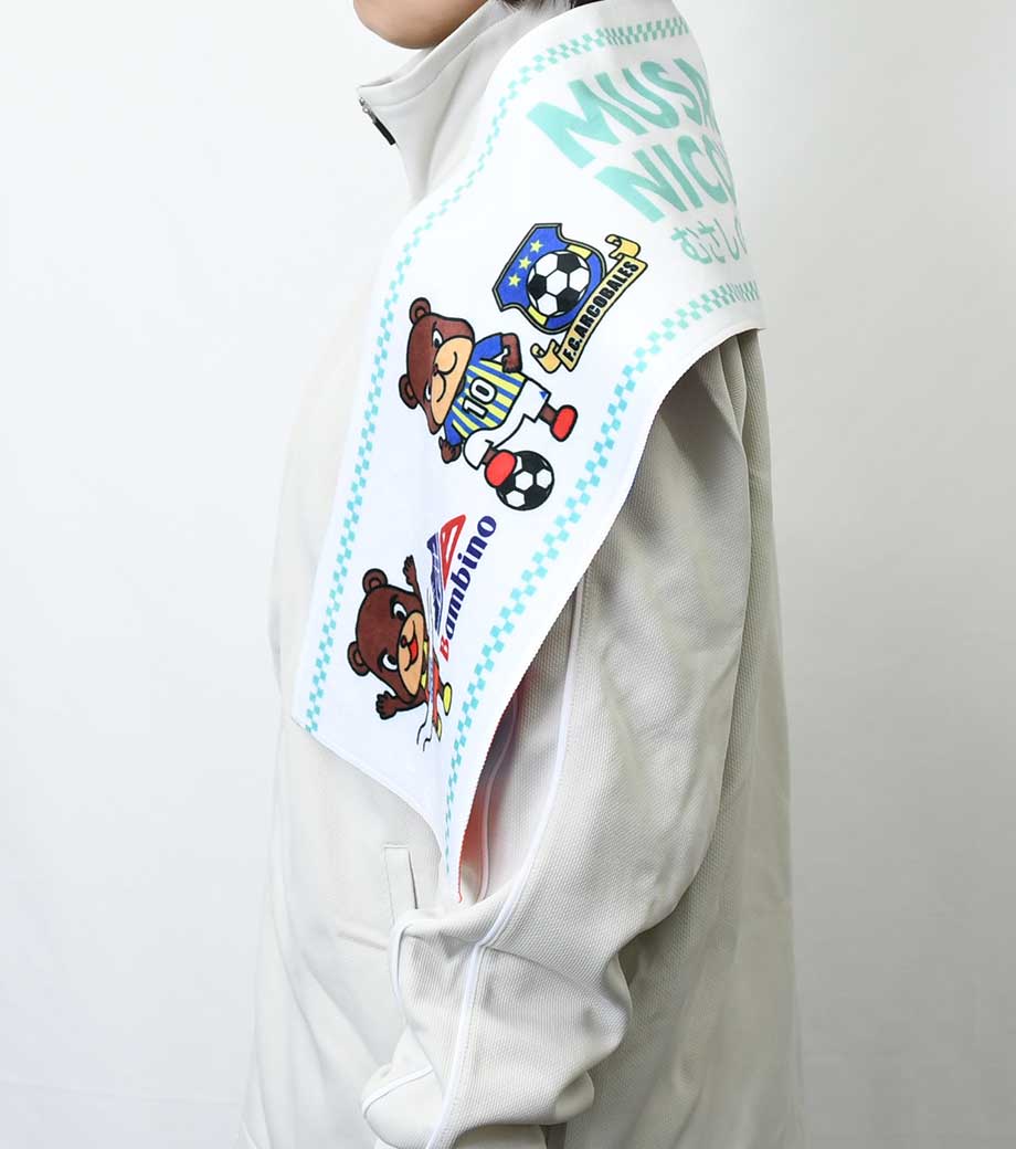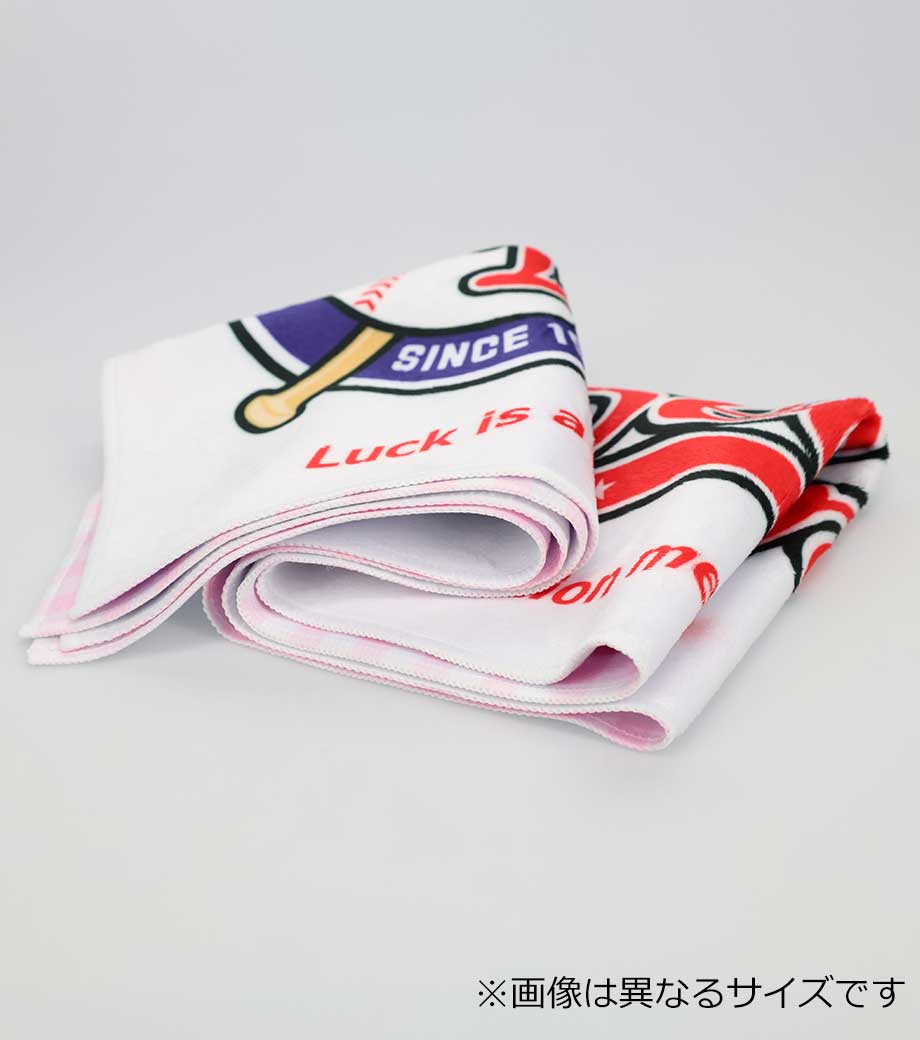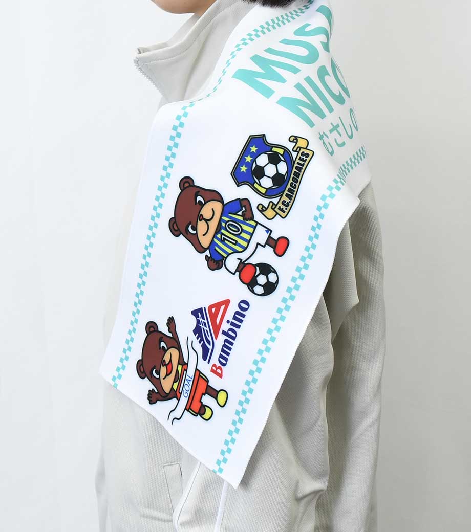 裏面は吸水性のあるパイル生地なので実用性も抜群!首に巻きやすいサイズ感で、スポーツ観戦やフェスなどのレジャーシーンで活躍します。クラブチームのロゴやオリジナルキャラクターなどを印刷した、オリジナルグッズ作成におすすめです。