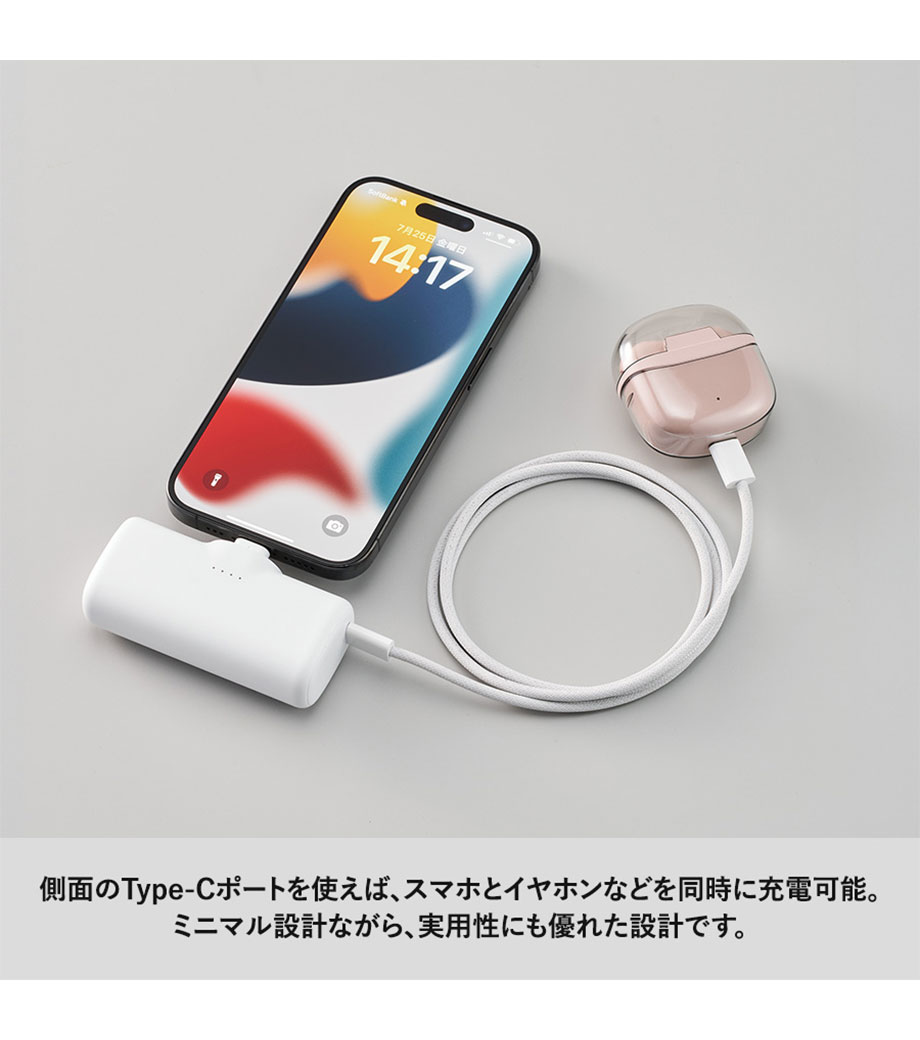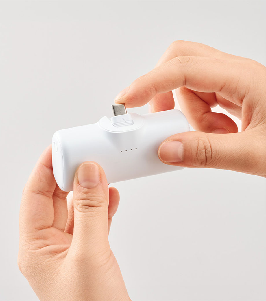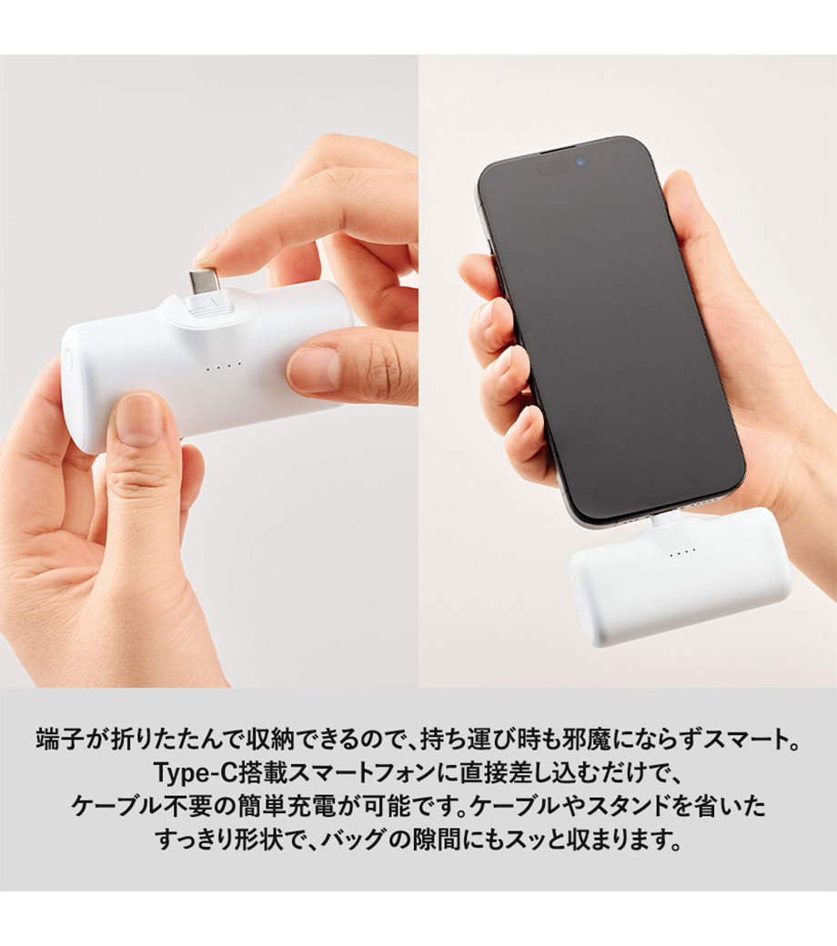 シンプルさと利便性を極めた、Type-C端子一体型のダイレクトチャージャーです。ケーブルいらずでスマートフォンにそのまま直挿ししてスピーディーに充電を開始できます。側面のType-Cポートを使えば、スマホとイヤホンなどの同時充電にも対応。端子部分は折りたたんで収納できるスリムな形状で持ち運びに便利です。