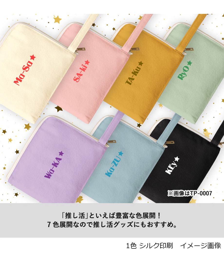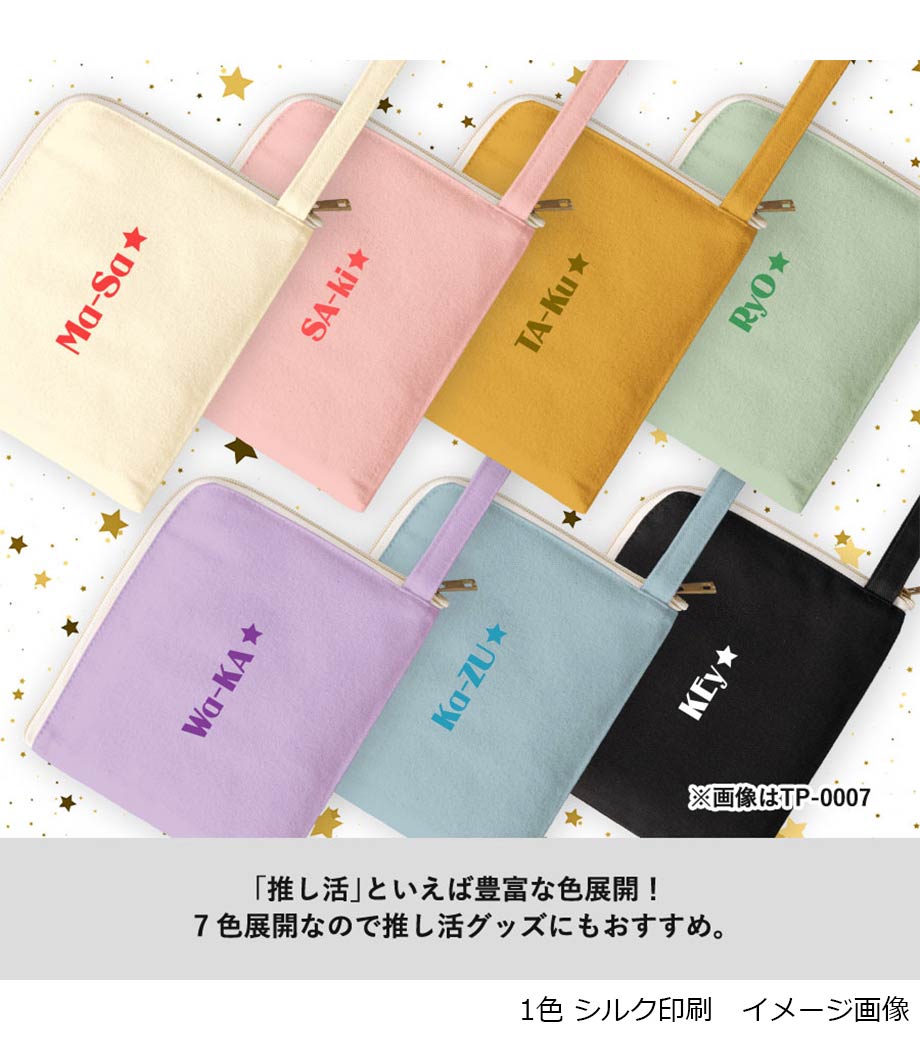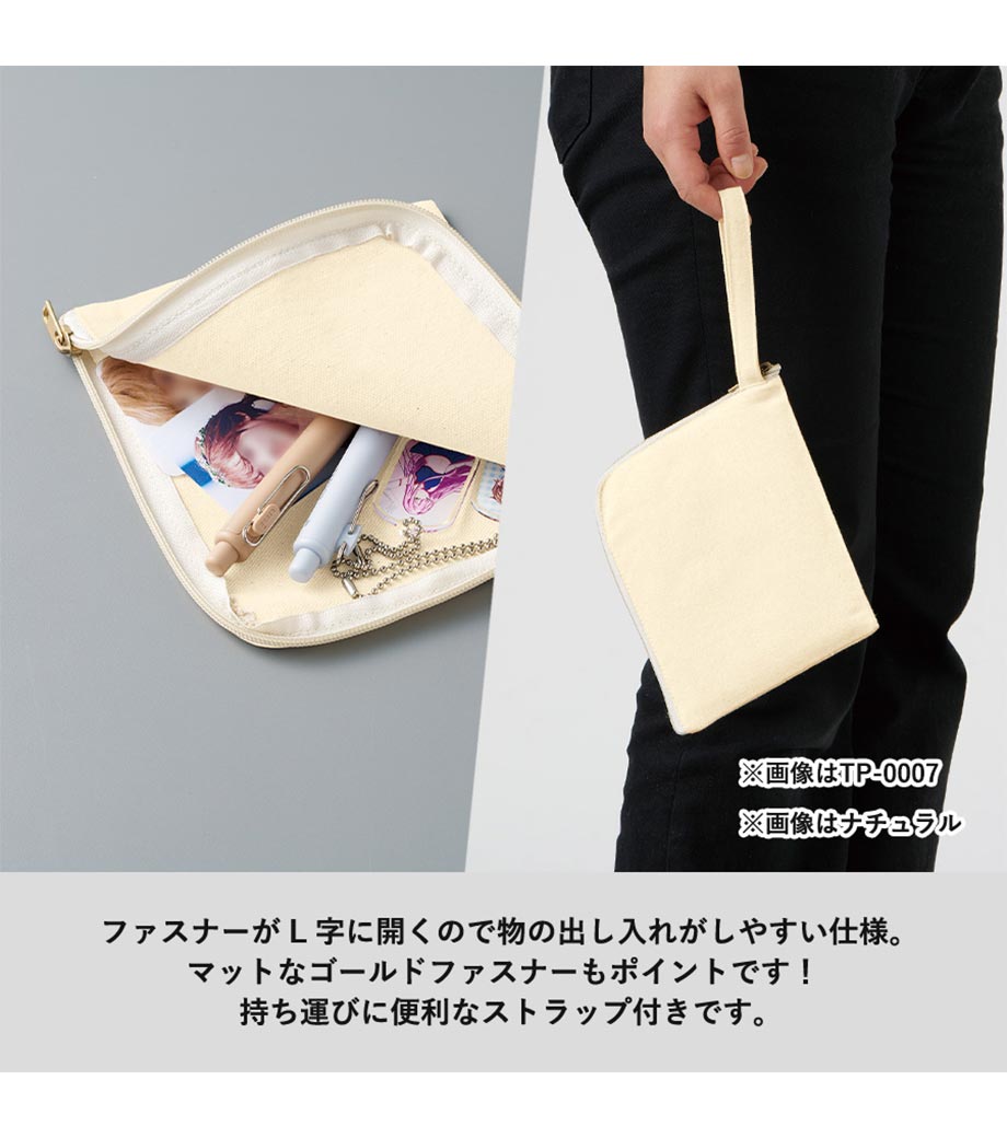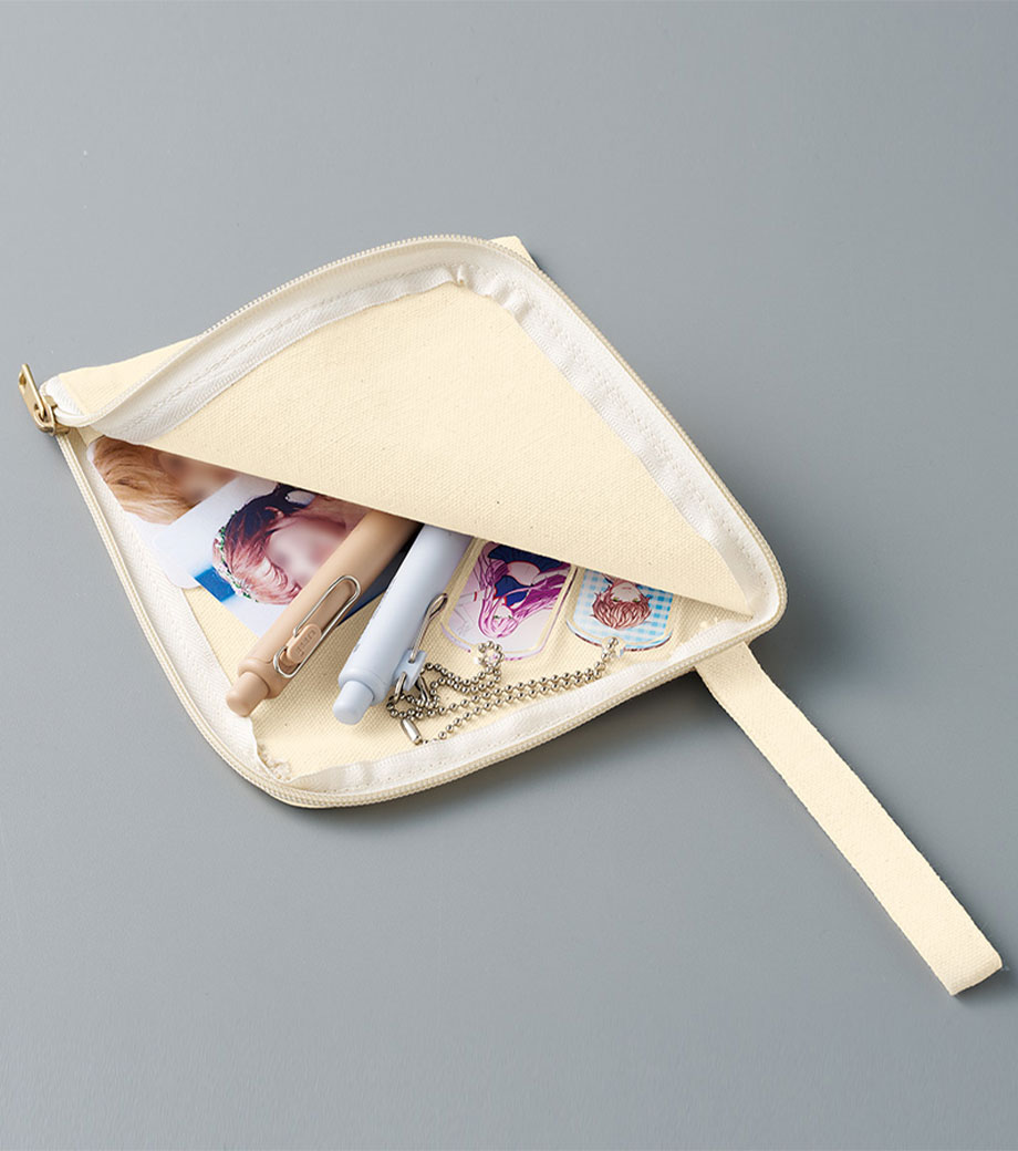 アクリルグッズやトレカなどの小物類をすっきり収納できるフラットポーチです。開けやすいL字ファスナー仕様で、中身の出し入れがスムーズ。マチなしでバッグの中でもかさばりにくいです。持ち運びに便利な持ち手付きで、イベントやライブなどの推し活シーンにぴったり!