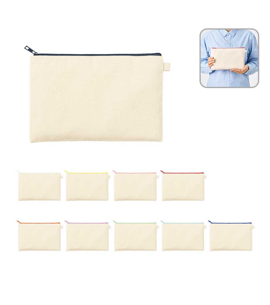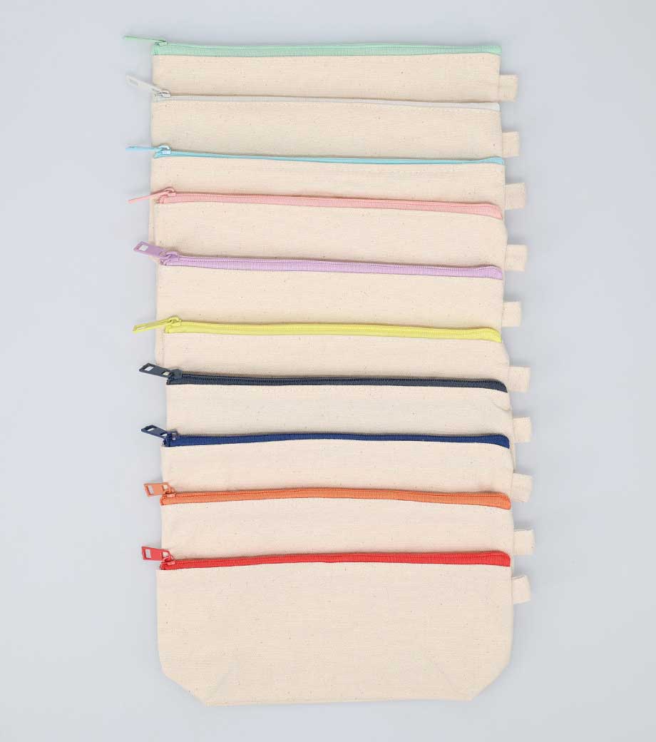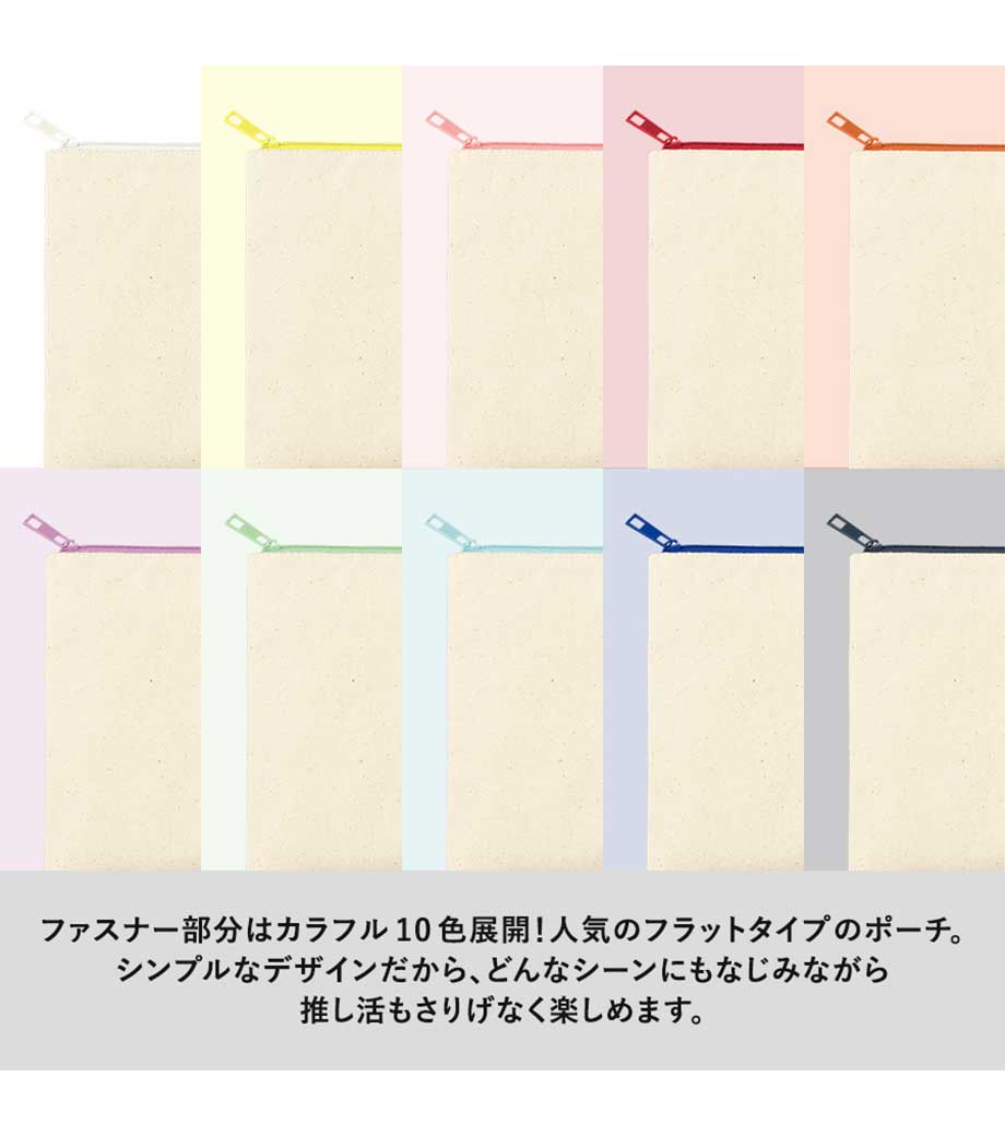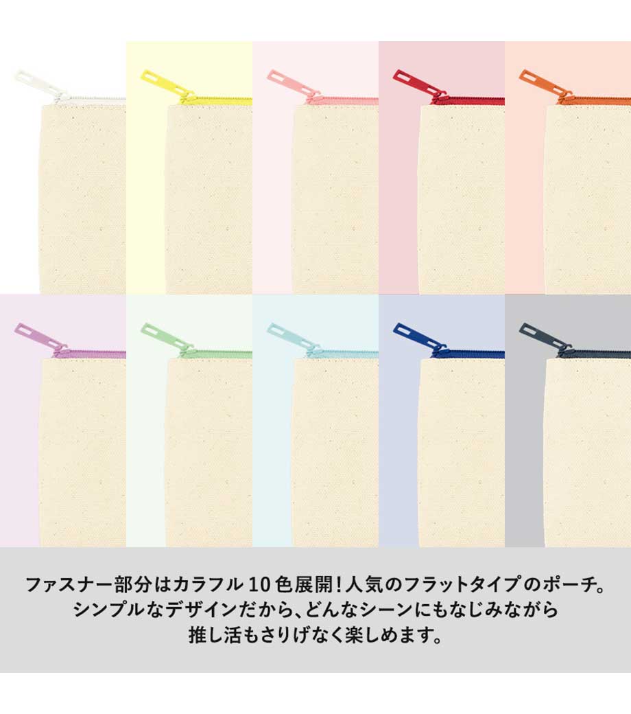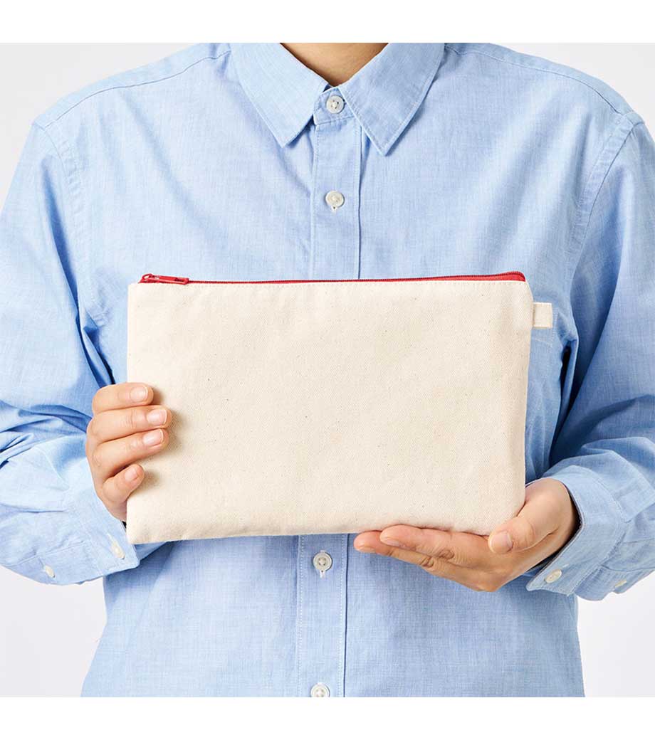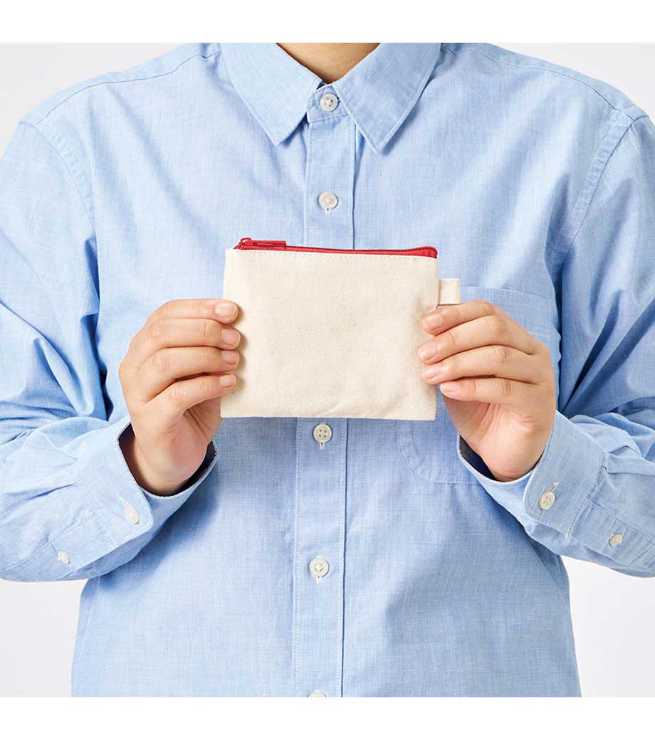 ファスナーの差し色がアクセントになったキャンバスポーチです。マチ付きでしっかり自立する舟形デザインで、コスメや小物をたっぷり収納できる使い勝手の良さが魅力です。サイドループ付きでキーホルダーやチャームも付けられ、アレンジを楽しめます。