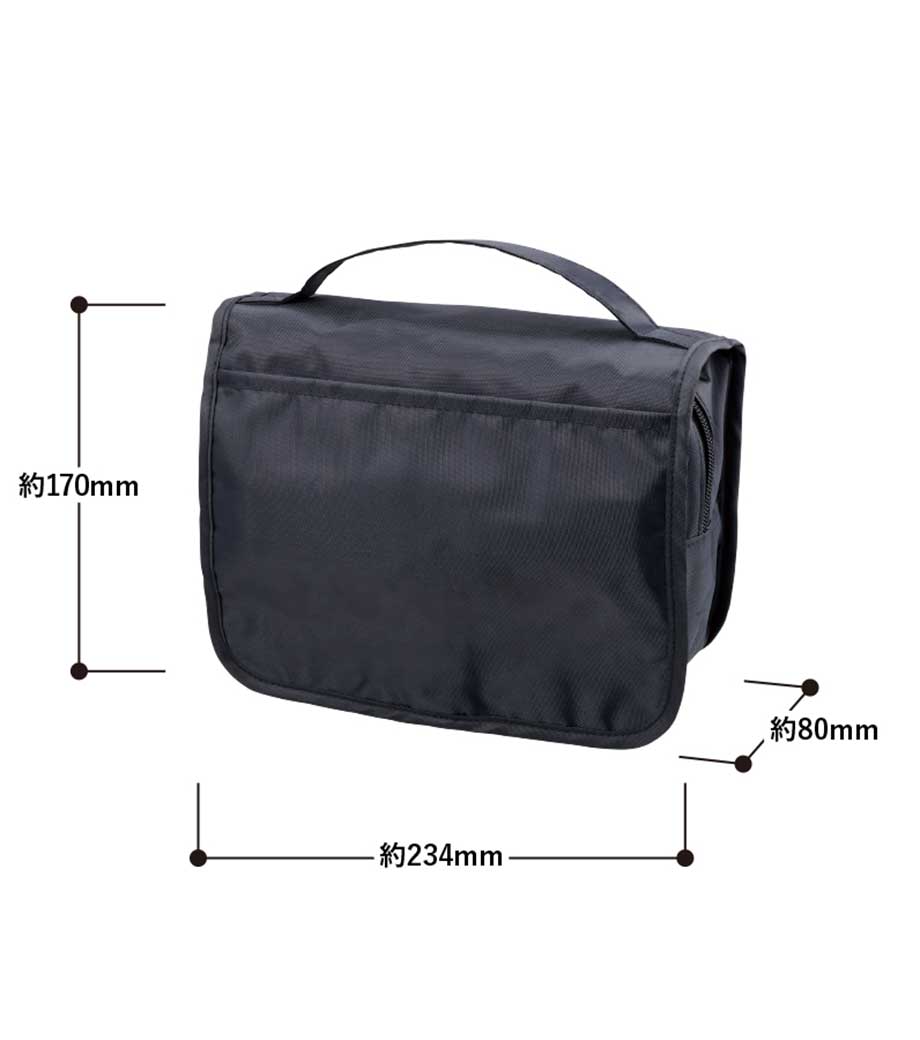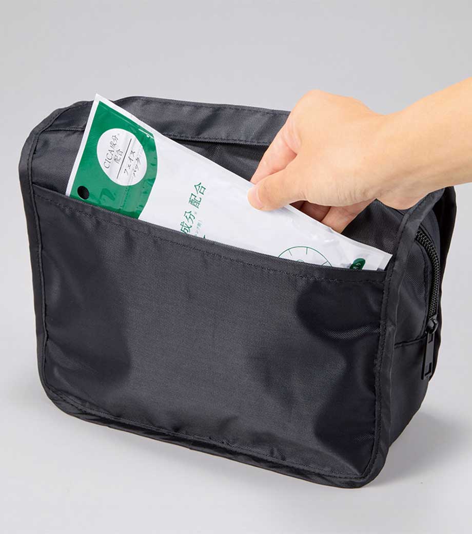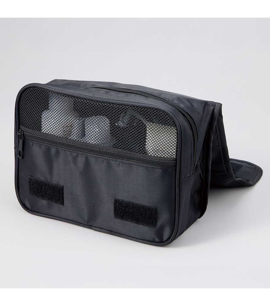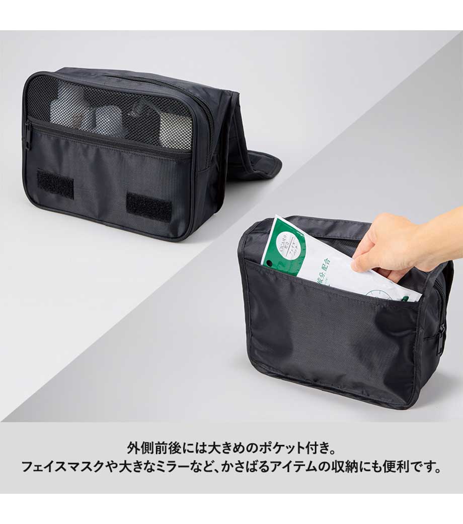 普段使いの洗面用具などが一式入るトラベルポーチです。化粧品のボトルがそのまま入るような余裕のあるサイズ感で出張や旅行にもぴったり。上部にメッシュポケットが2つ、下部はメッシュポーチに分れており、用途別に仕分けできます。ポーチの中は底板付きで、仕切りやベルトもありスッキリ収納。前後に付いた外ポケットにはマスクやミラーなどを入れられ便利です。