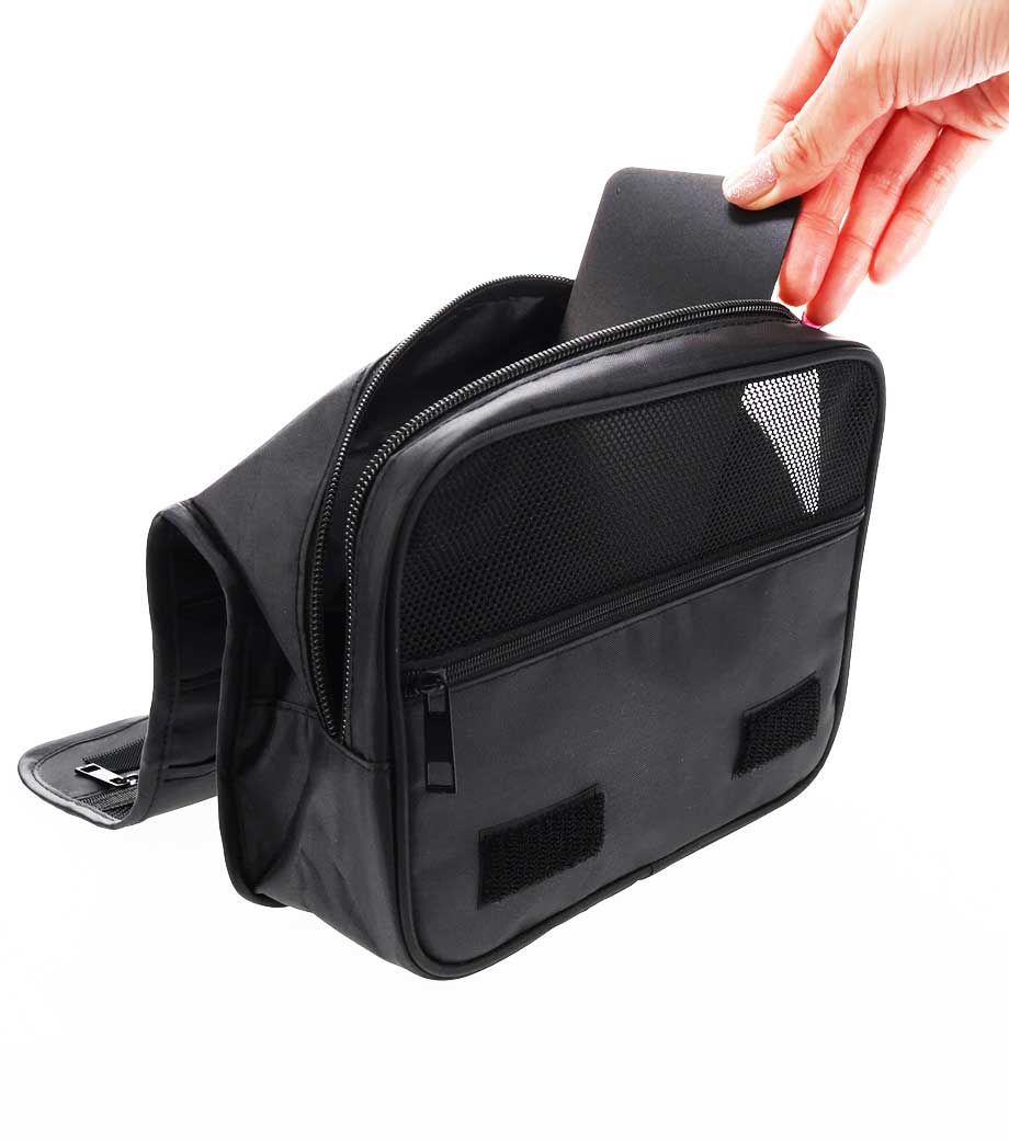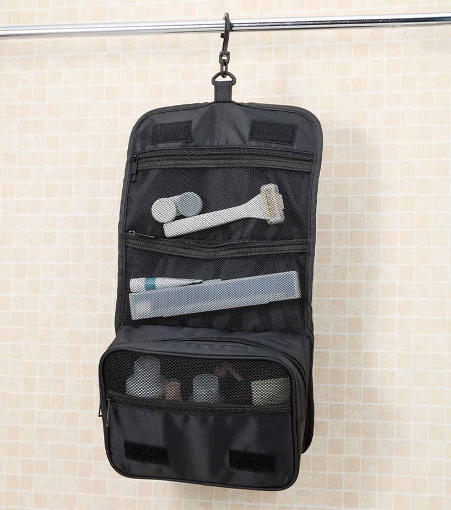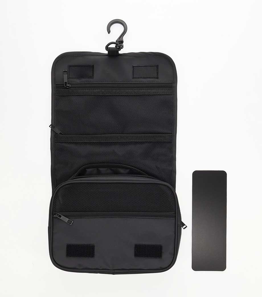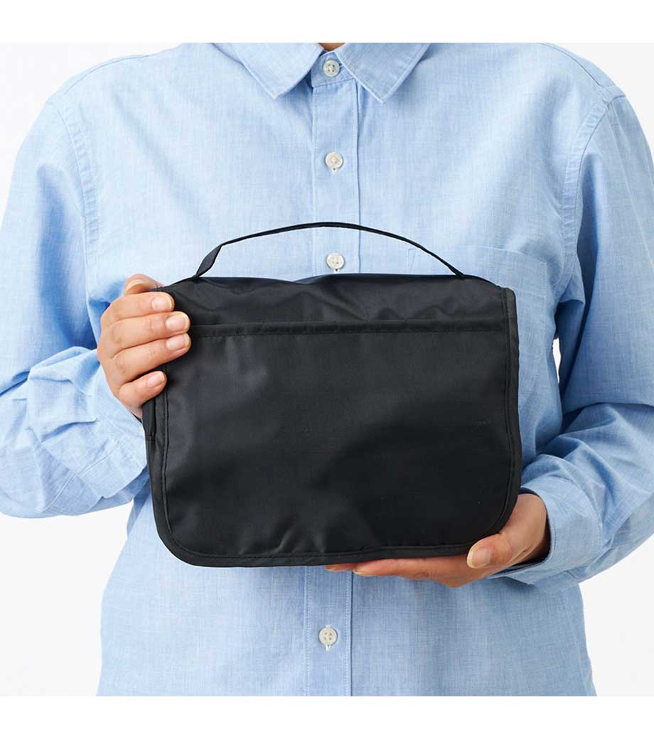 普段使いの洗面用具などが一式入るトラベルポーチです。化粧品のボトルがそのまま入るような余裕のあるサイズ感で出張や旅行にもぴったり。上部にメッシュポケットが2つ、下部はメッシュポーチに分れており、用途別に仕分けできます。ポーチの中は底板付きで、仕切りやベルトもありスッキリ収納。前後に付いた外ポケットにはマスクやミラーなどを入れられ便利です。