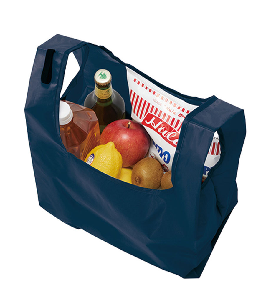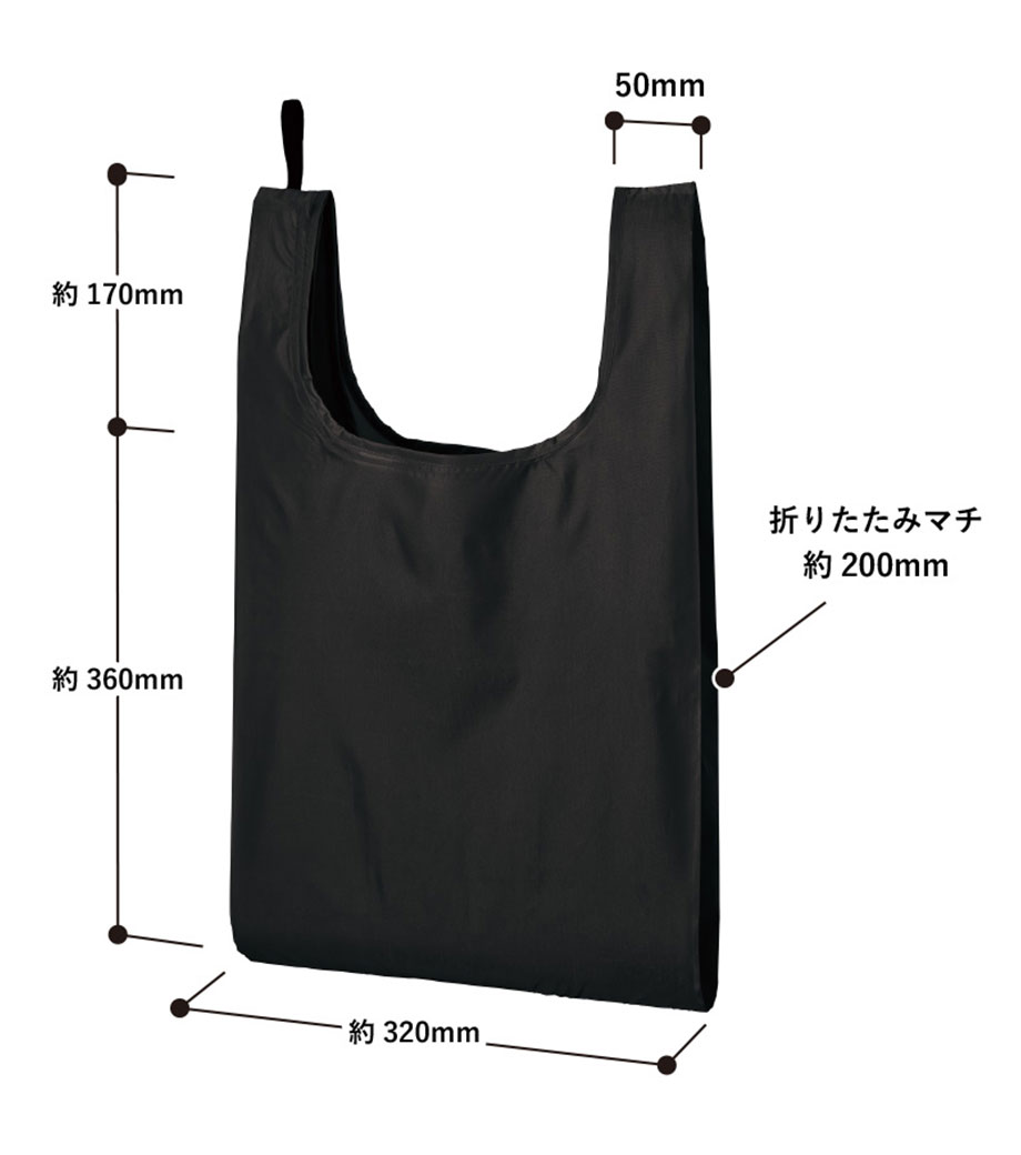 さらっとした手触りの光沢感あるポリエステル生地のマルシェバッグです。約200mmの折り畳める広いマチで底までしっかり収納でき、お弁当や食品トレーが入れやすい大きさ。スーパーでのまとめ買いや日常のお買い物に大活躍。使わない時は簡単に折りたたんで、縫い付けゴムバンドでとめればコンパクトに持ち運べます。