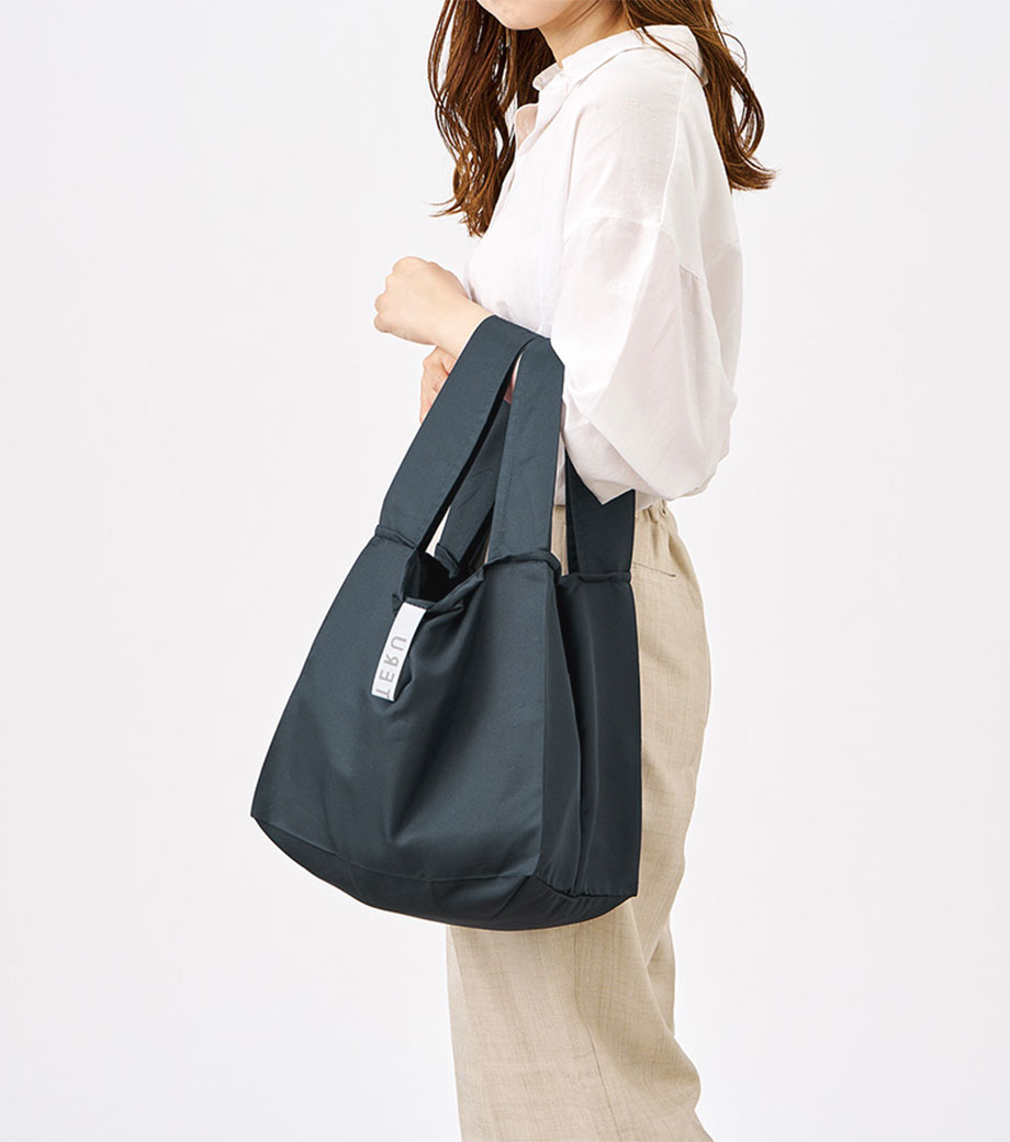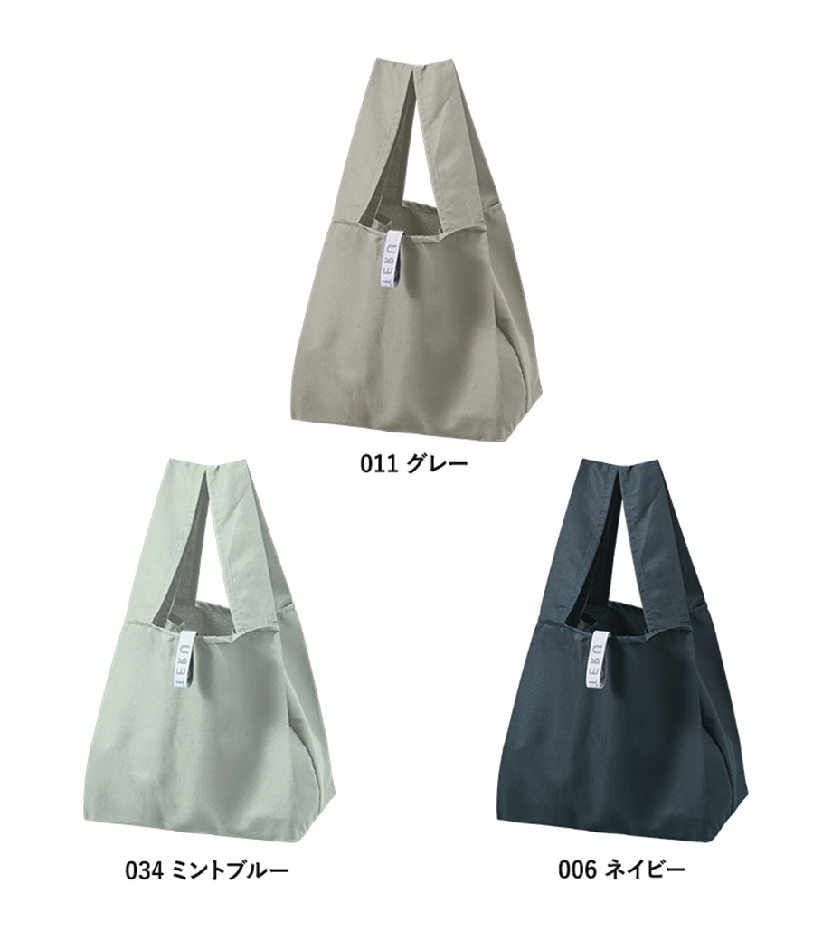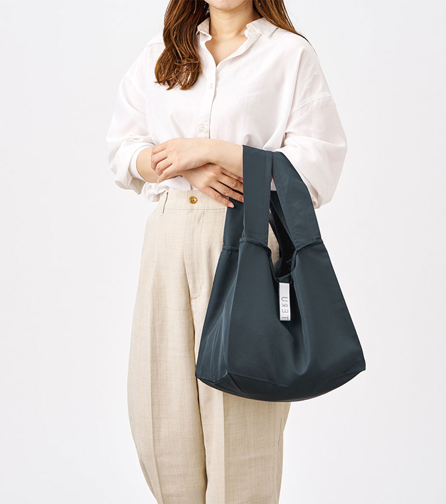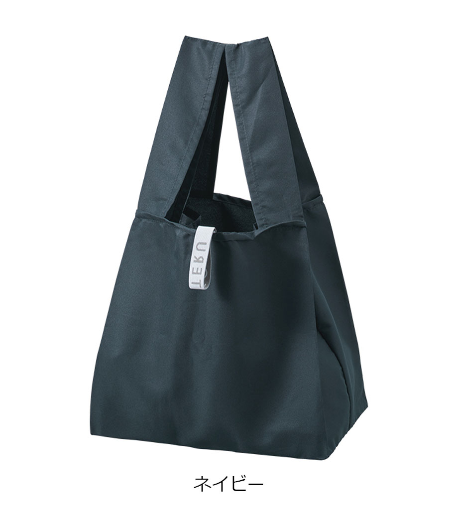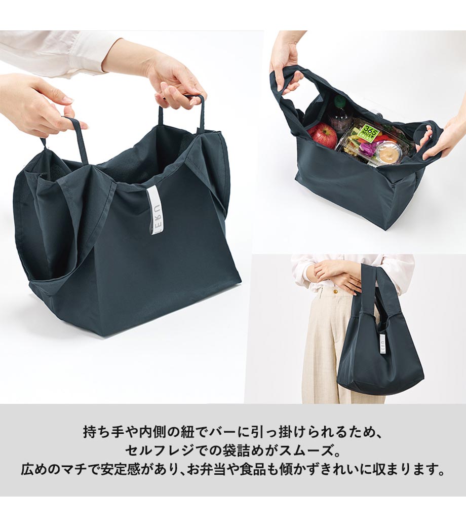 セルフレジでの使用に適したスクエア型エコバッグ。畳んでゴムバンドで留められるため、かさばらずコンパクトに持ち歩けます。持ち手はセルフレジのバーに引っ掛けて使用でき、バーが低い場合でも内側の紐を使ってセットできます。広めのマチで安定感があり、食品が入れやすいのもポイント。ネイビー、グレー、ミントブルーのカラー展開。