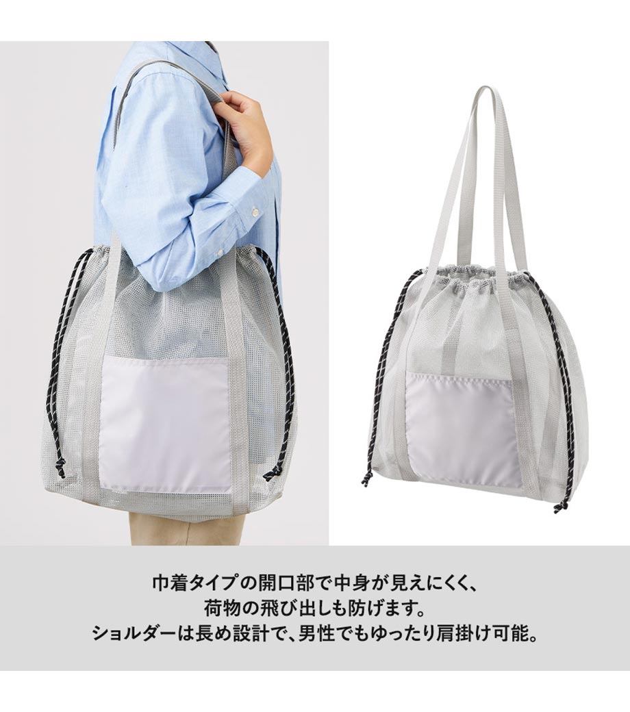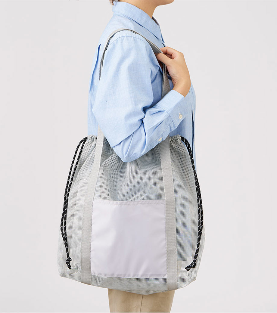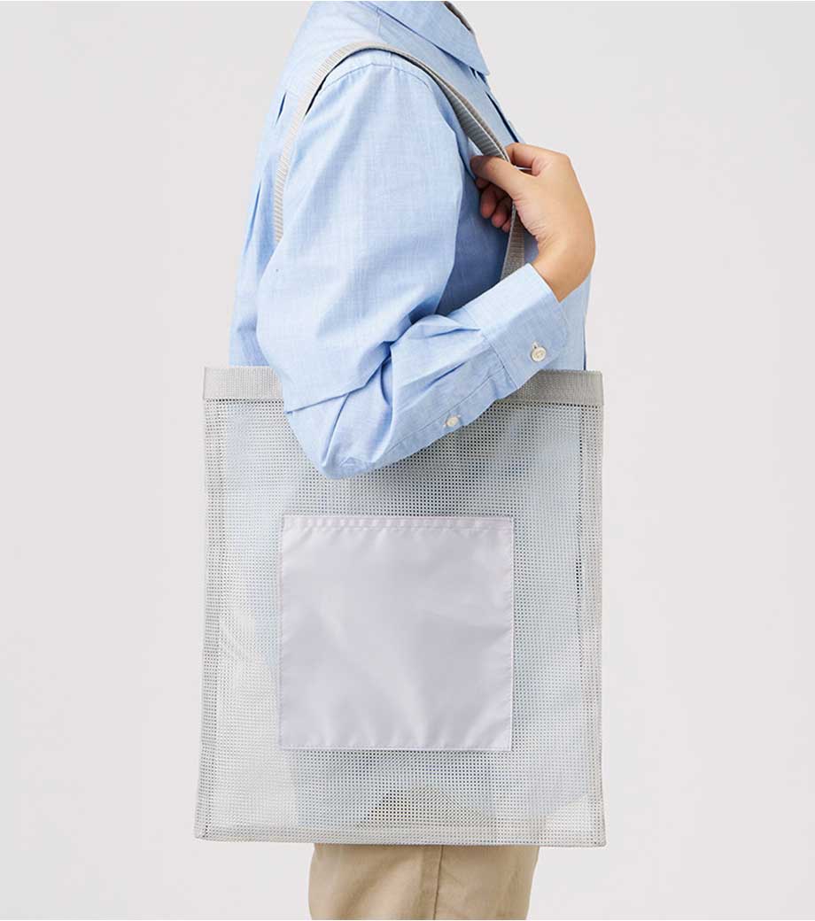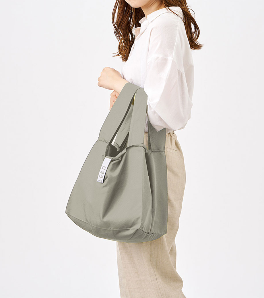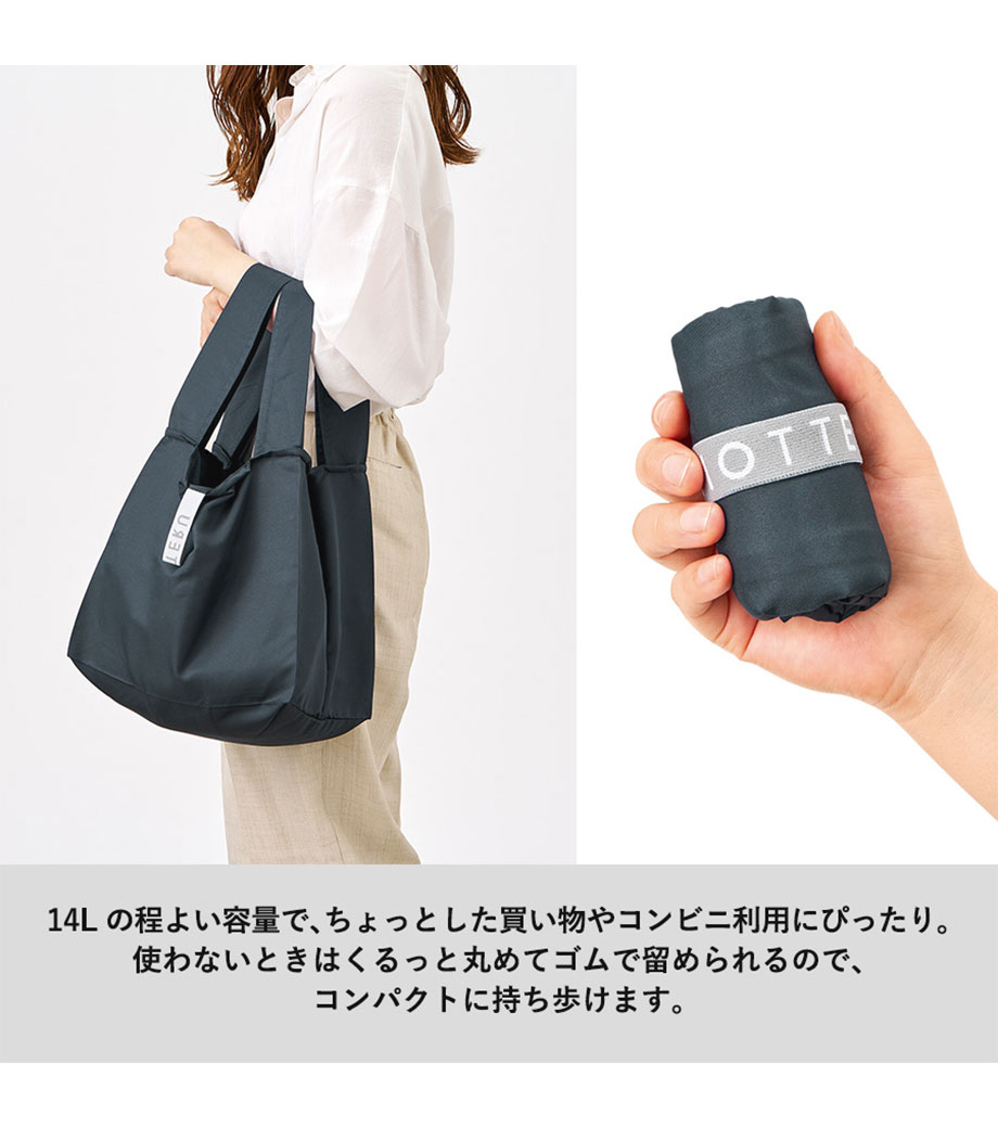 セルフレジでの使用に適したスクエア型エコバッグ。畳んでゴムバンドで留められるため、かさばらずコンパクトに持ち歩けます。持ち手はセルフレジのバーに引っ掛けて使用でき、バーが低い場合でも内側の紐を使ってセットできます。広めのマチで安定感があり、食品が入れやすいのもポイント。ネイビー、グレー、ミントブルーのカラー展開。