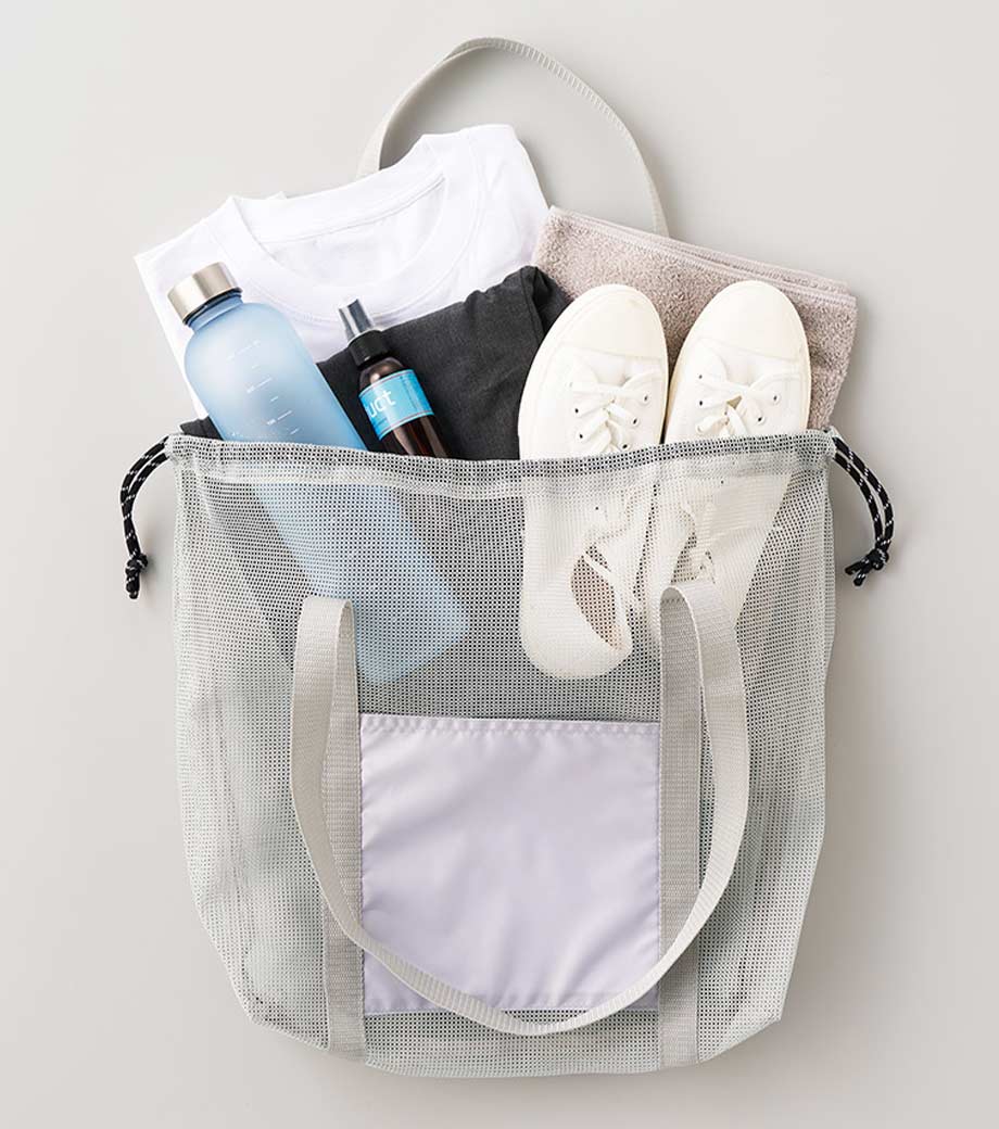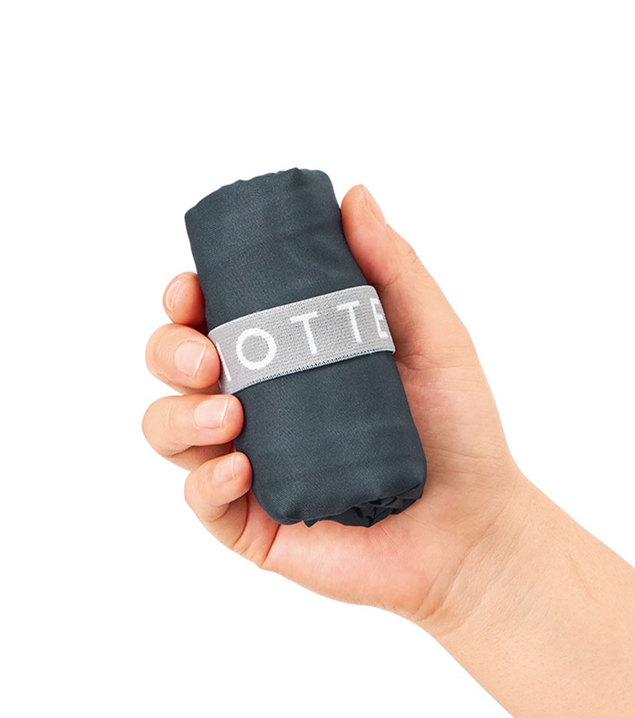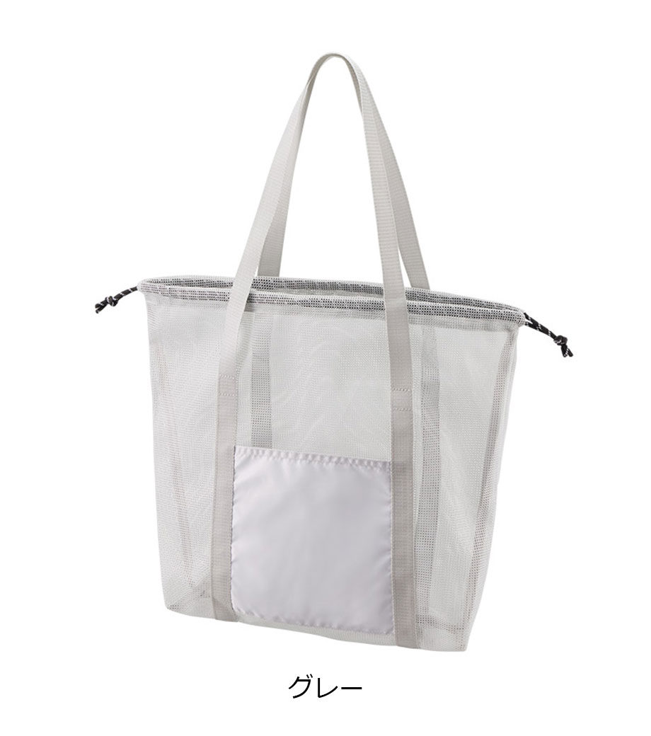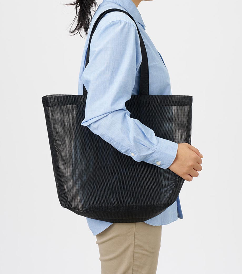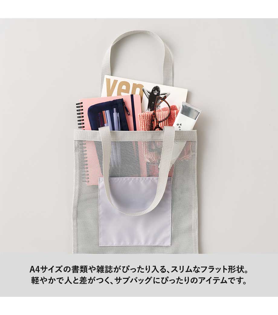 セルフレジでの使用に適したスクエア型エコバッグ。畳んでゴムバンドで留められるため、かさばらずコンパクトに持ち歩けます。持ち手はセルフレジのバーに引っ掛けて使用でき、バーが低い場合でも内側の紐を使ってセットできます。広めのマチで安定感があり、食品が入れやすいのもポイント。ネイビー、グレー、ミントブルーのカラー展開。