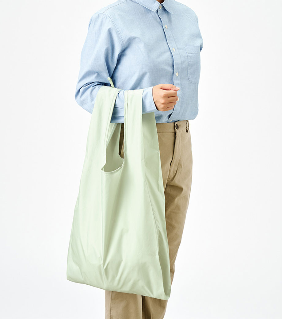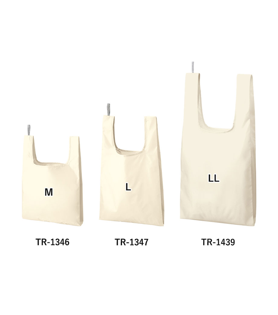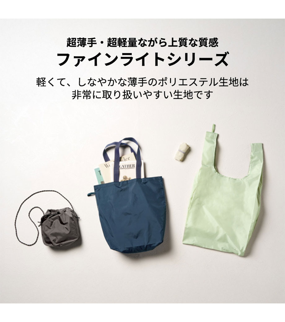 ナイロンのようにしなやかで上品な光沢と、さらりとした手触りが魅力のファインライトポリ素材を使用したマルシェバッグです。超薄手・超軽量で、ハンドルのゴムを留めればさらに極小サイズにまとまり携帯性抜群。LLサイズは、まとめ買いにも安心な大容量設計です。