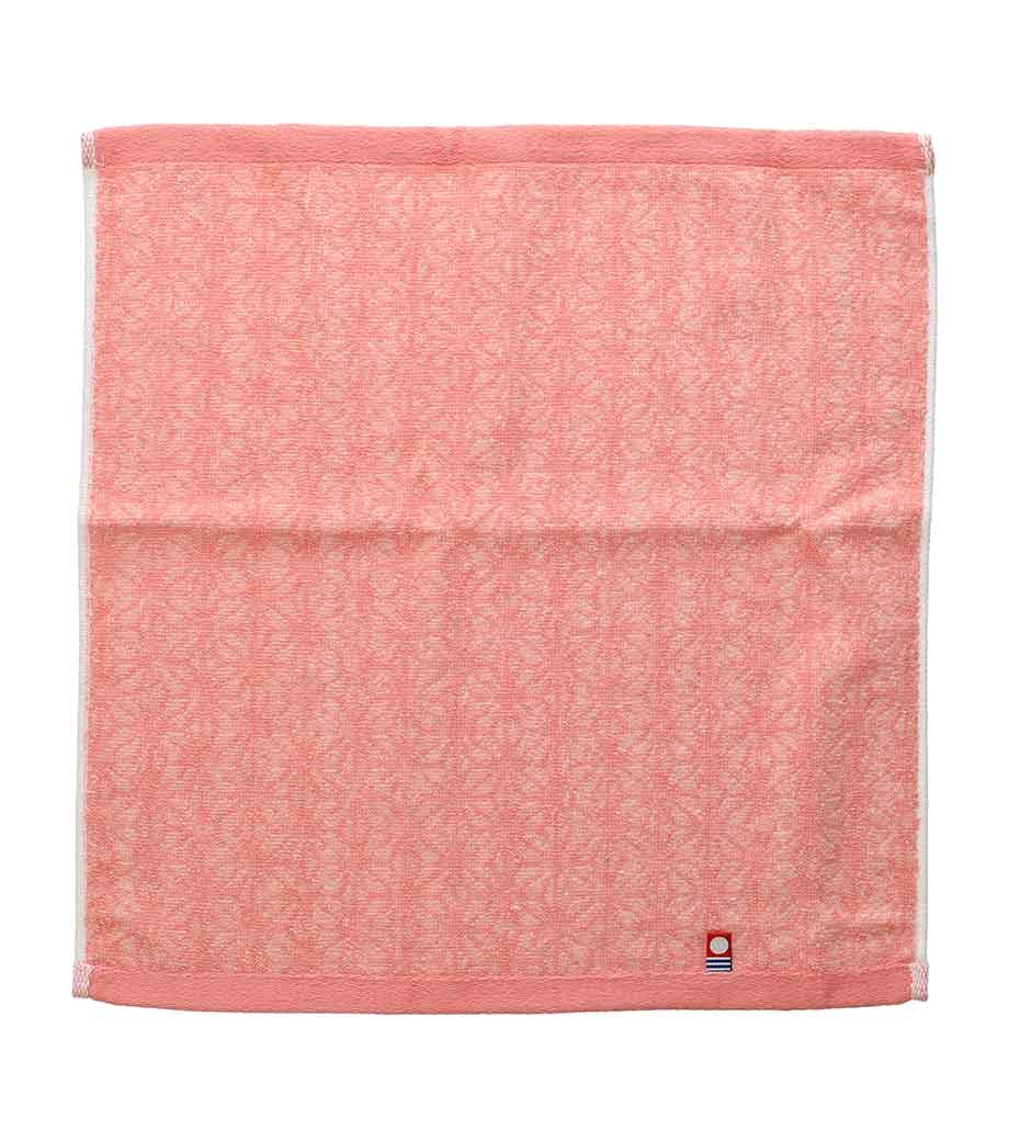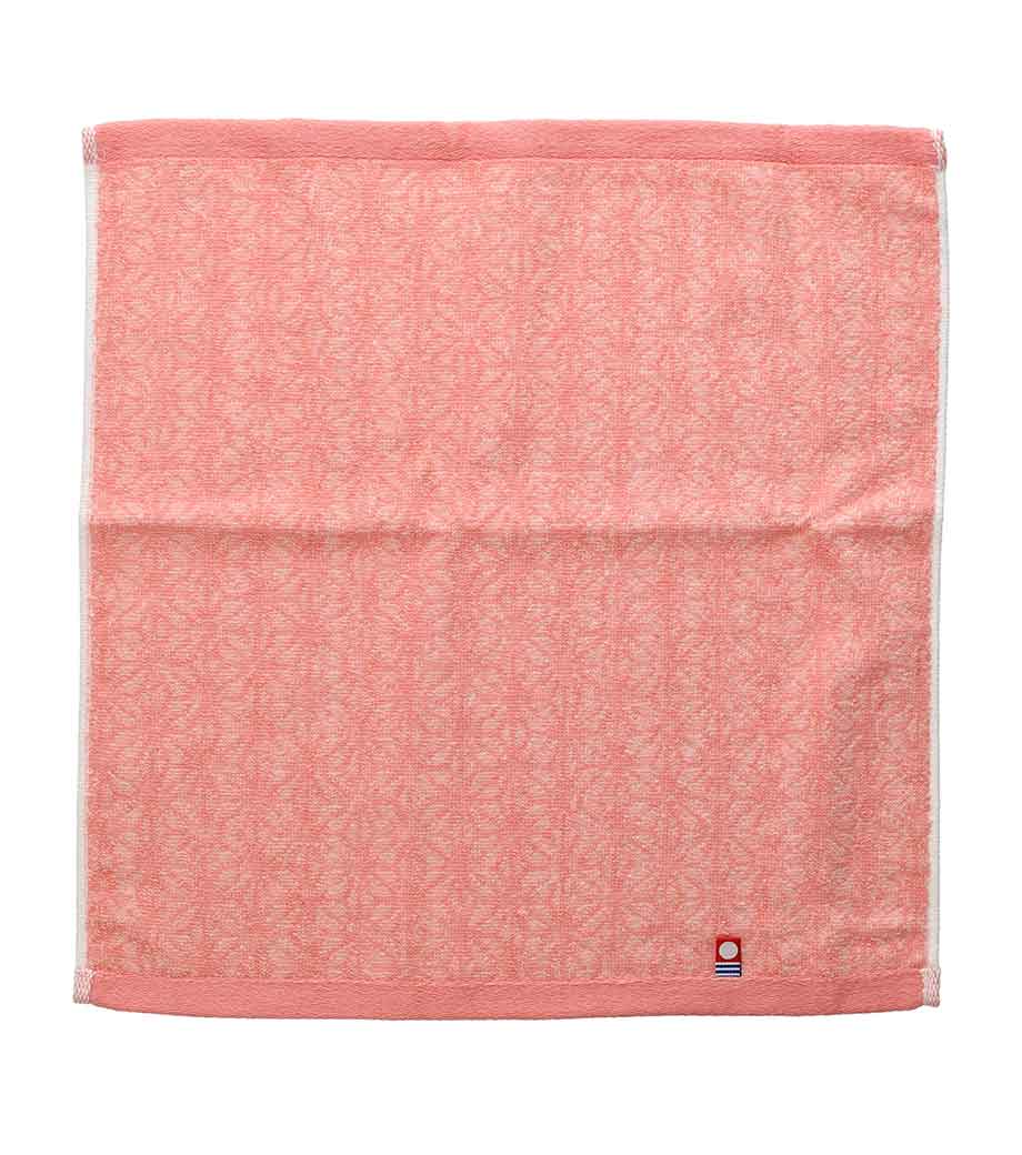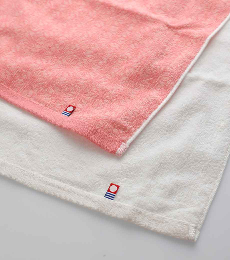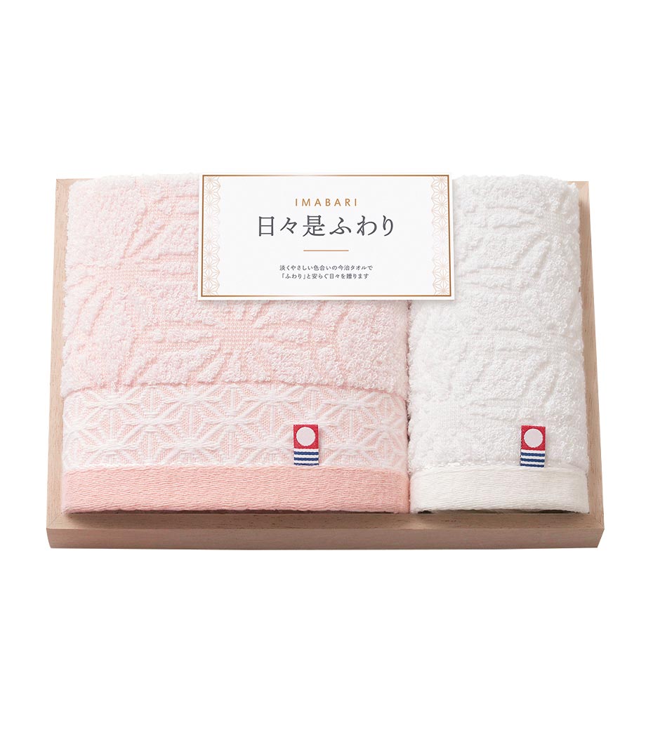 今治産ならではのやわらかな肌ざわりを楽しめる紅白2枚組のハンドタオルセットです。おめでたい紅白カラーに魔除けや健やかな成長を願う意味が込められている日本の伝統文様、麻の葉柄が施されています。