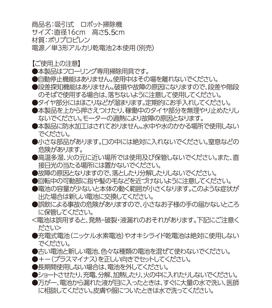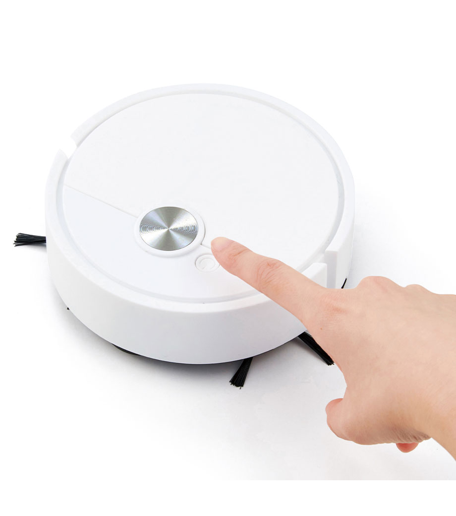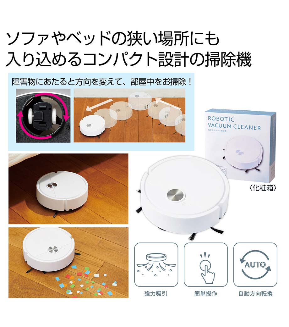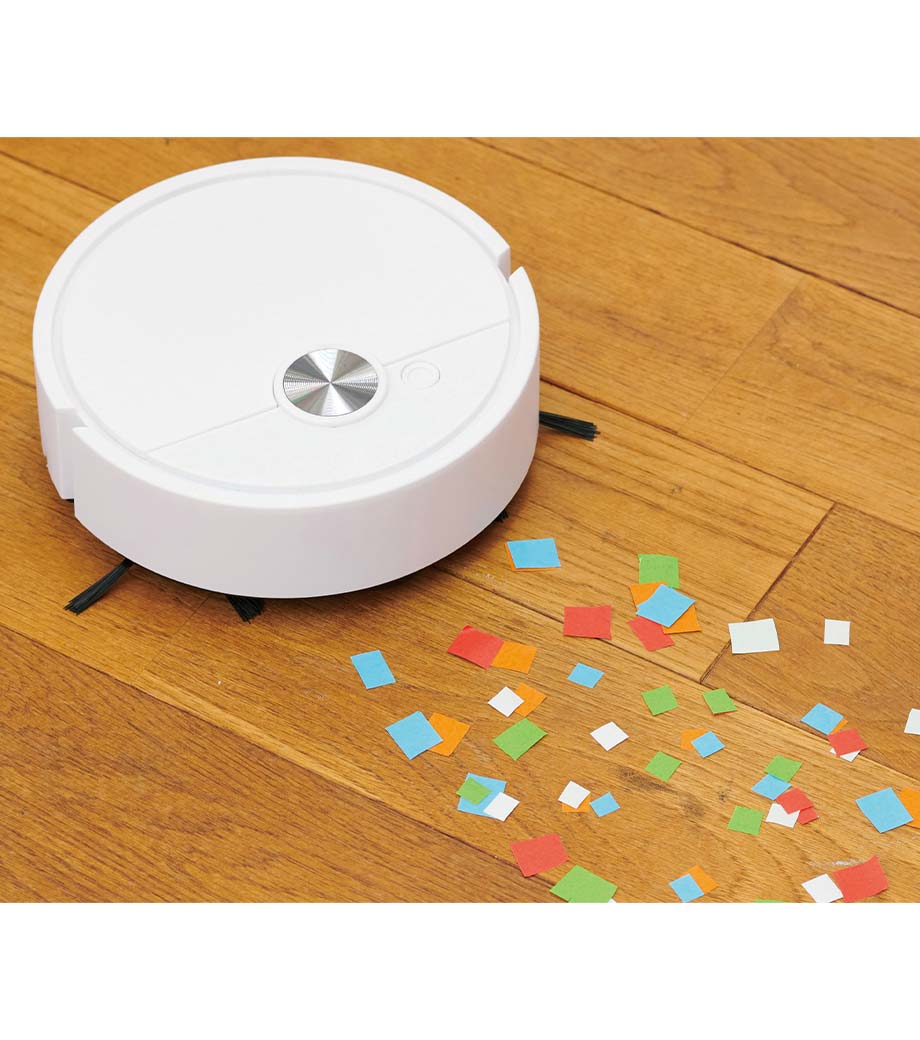 フローリングの床やソファ下のちょっとしたお掃除に便利な、ミニサイズのロボット掃除機。壁や障害物に当たるとくるっと方向転換します。掃除が終わったらフタを開けて、たまったゴミを捨てるだけでお手入れ簡単。充電の必要がない電池式です。