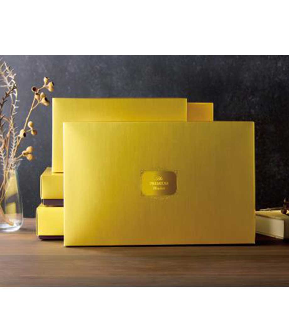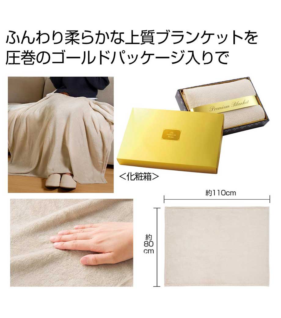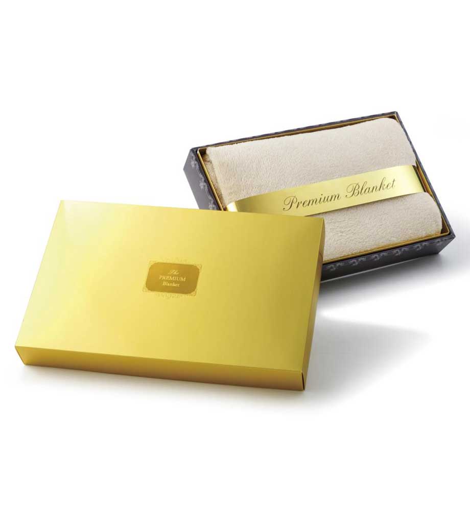 ゴールドの化粧箱に入った手頃な価格ながらも上品な印象を与えるブランケットです。