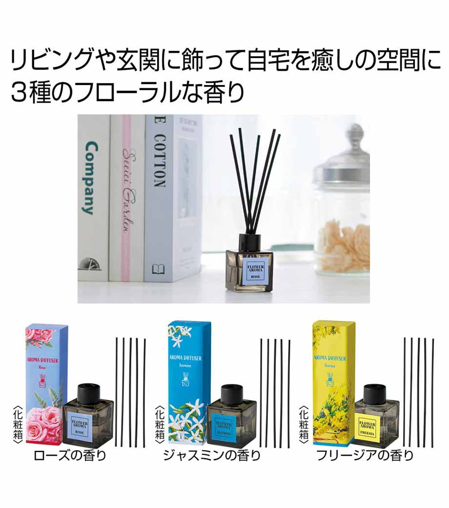 玄関やリビング、寝室にそっと置くだけでふんわりと優しい香りが広がるアロマディフューザー 。ローズ・ジャスミン・フリージアの華やかで心地よいフローラルな3つの香りを取混ぜでお届けします。