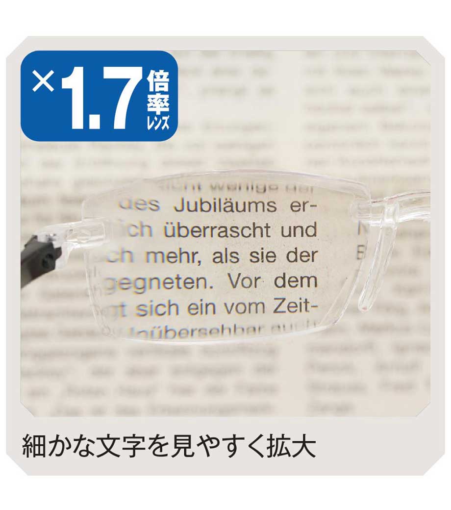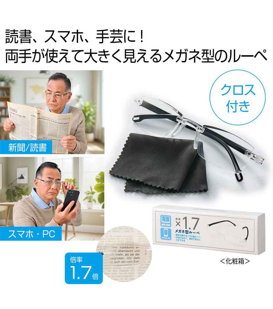 新聞や読書、スマートフォン、PC操作などに便利なメガネ型ルーペ。さっと掛けるだけで両手が自由に使えるのでページをめくったり入力作業をしたりする際も快適です。倍率は1.7倍で文字や細かな部分をやさしく拡大。目の負担をやわらげ毎日の情報チェックをサポートします。