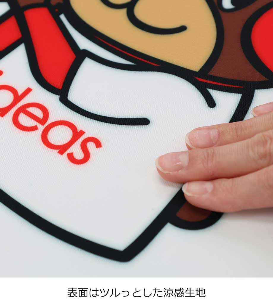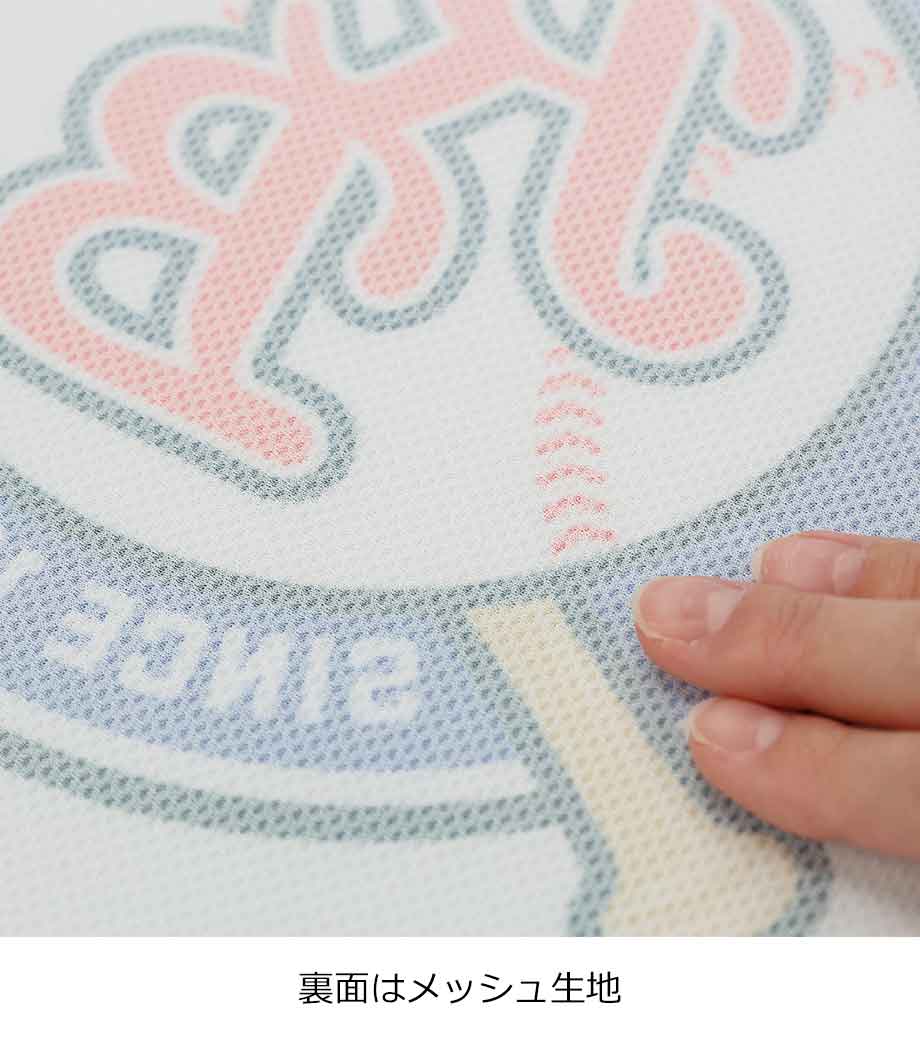 ひんやり感のある生地全面にフルカラー印刷できるフェイスタオルです。冷感の基準を示すQ-MAX値は約0.2で、触れたときにほんのりと冷たさが感じられます。濡らして使う必要がなく、気軽に暑さ対策ができるオリジナルグッズです。