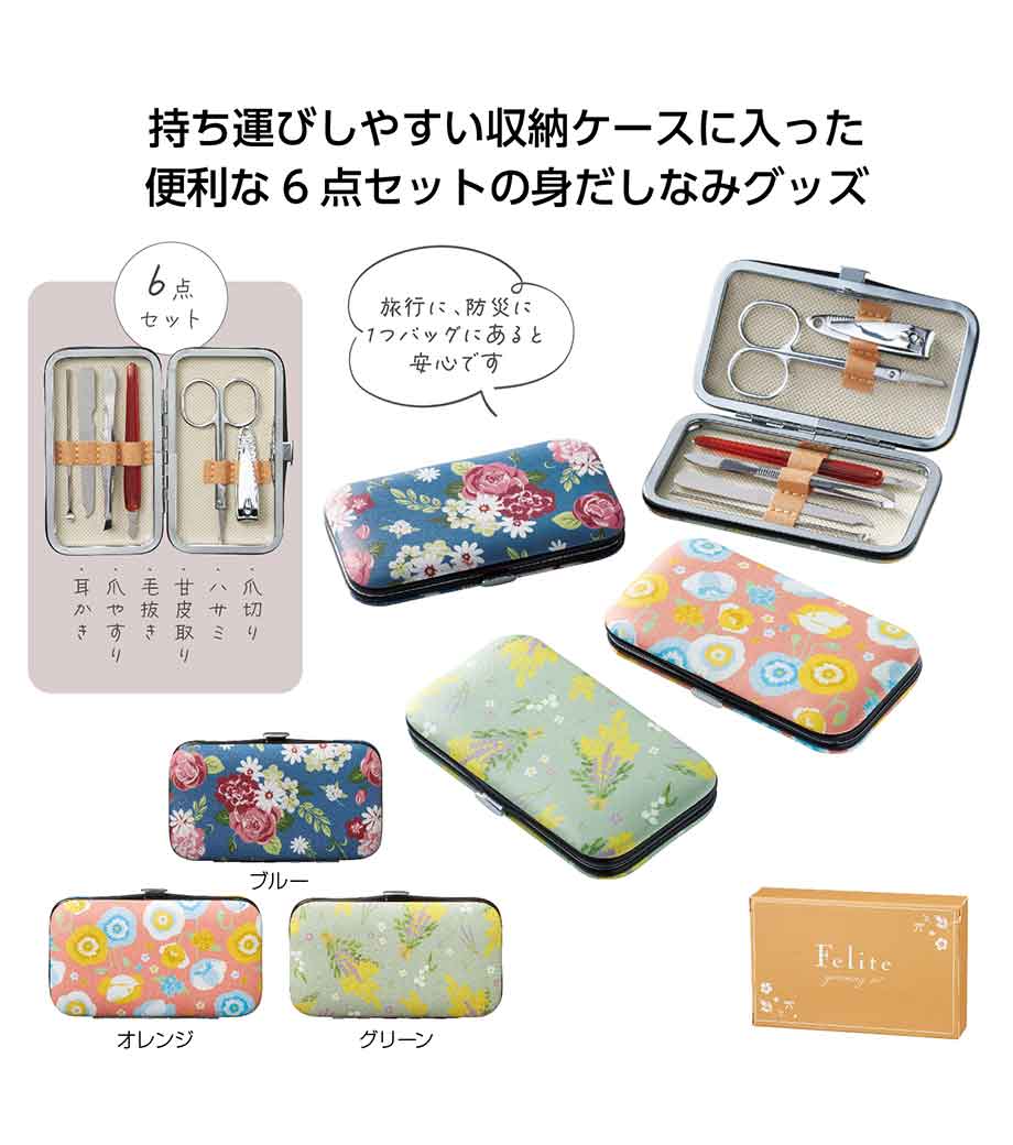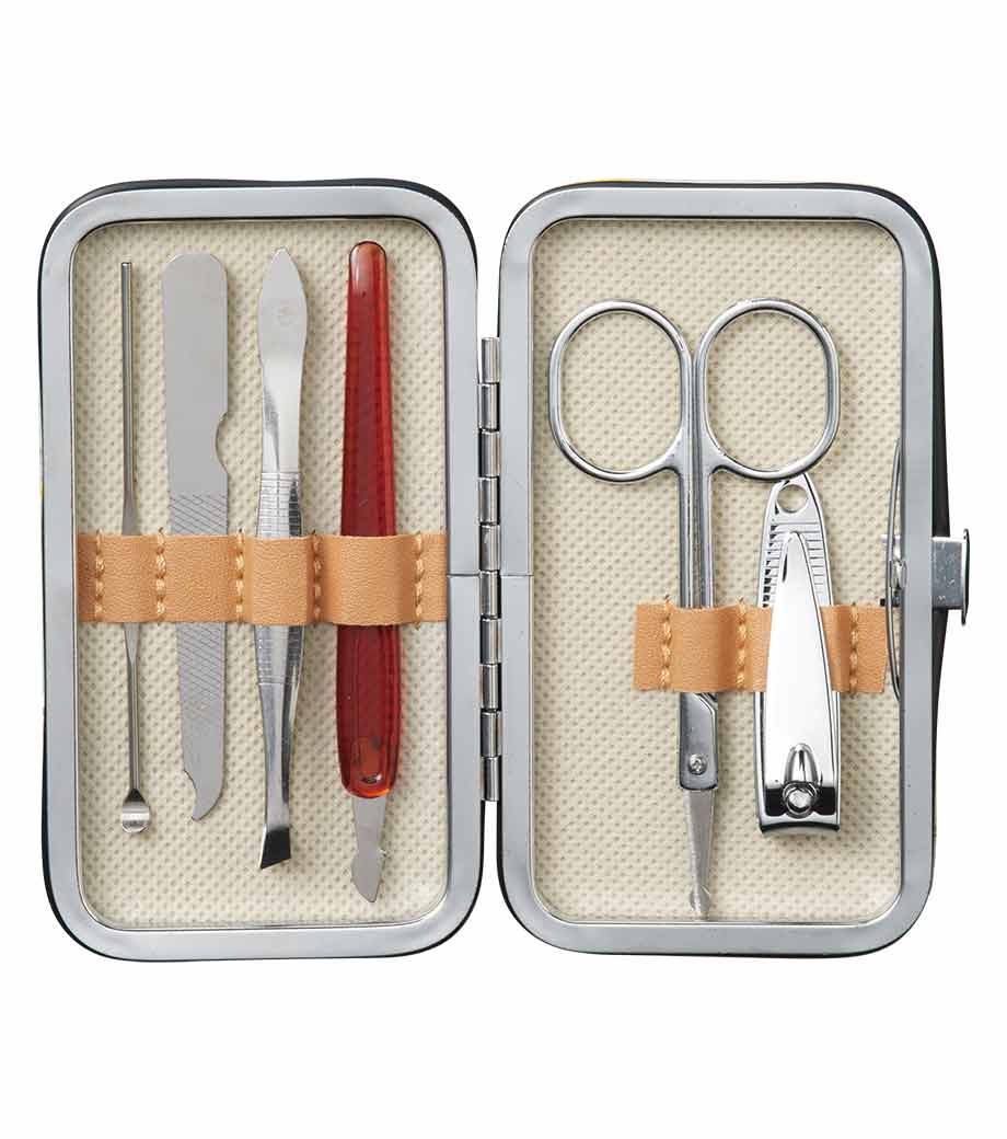 爪や眉のお手入れができるセットです。爪のお手入れに使用できるプッシャー、爪やすり、爪切り、眉のお手入れに使用できる眉毛カットはさみ、ピンセットの5点が揃っています。手のひらに収まるコンパクトサイズのケースはシンプルな黒。かさばらないサイズ感なので普段のバッグに入れておいたり、旅行先でのエチケットケアとしても重宝しますよ。