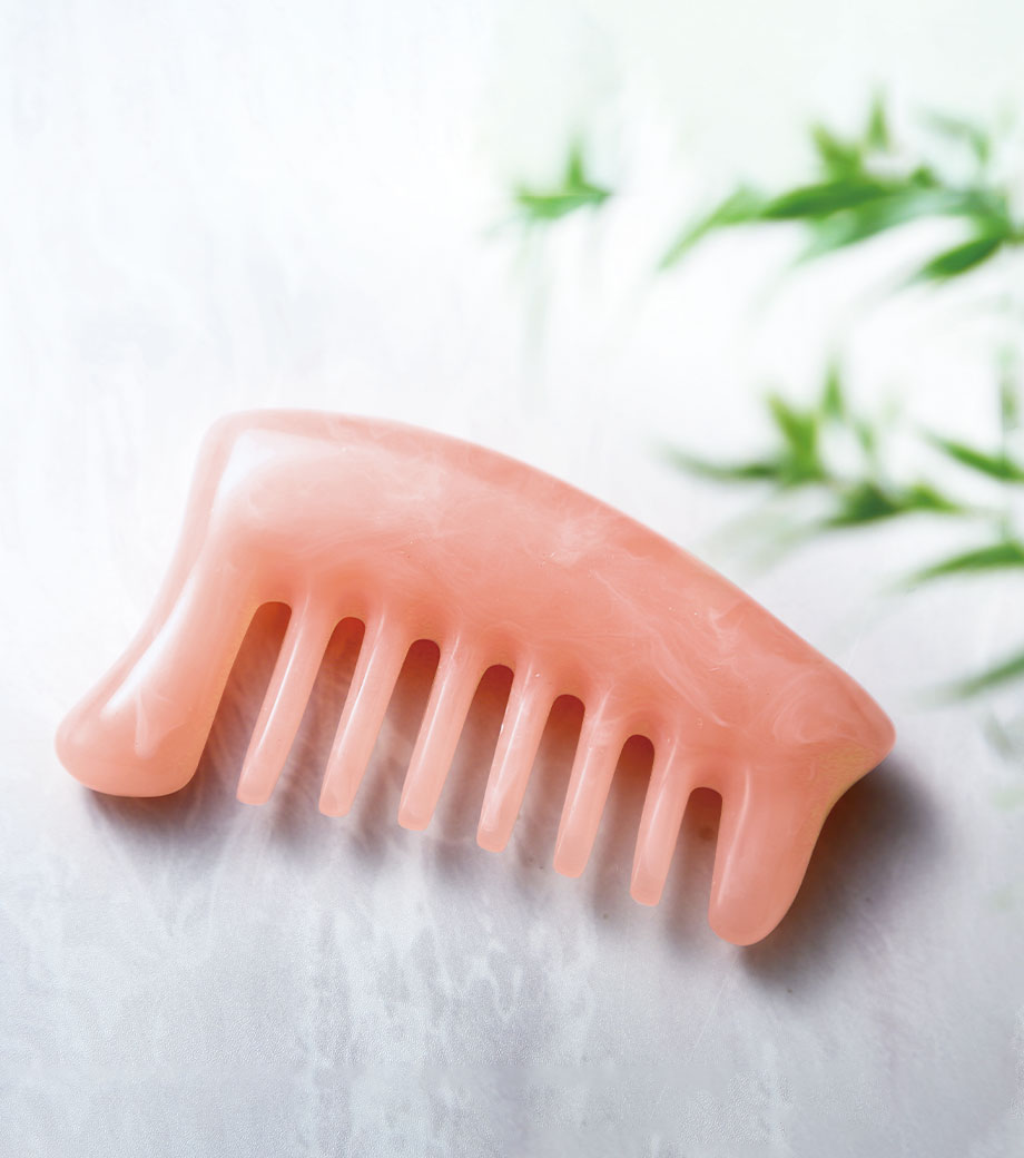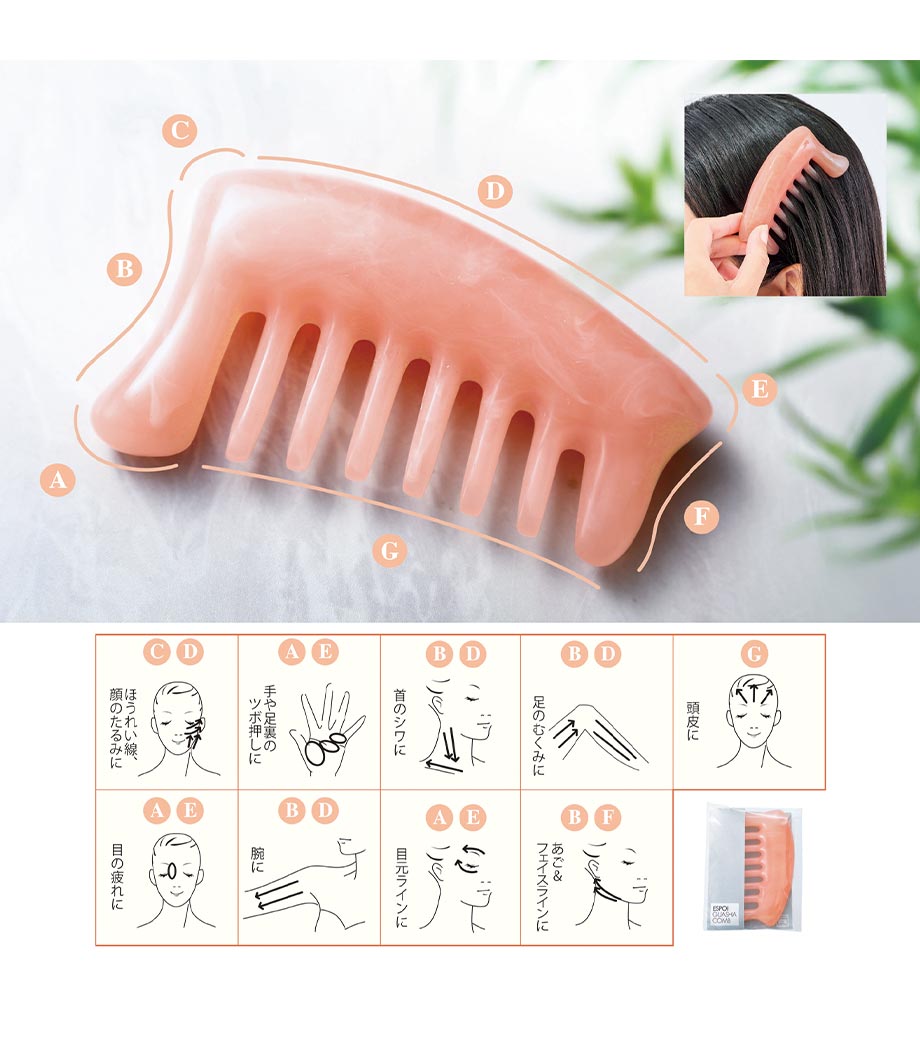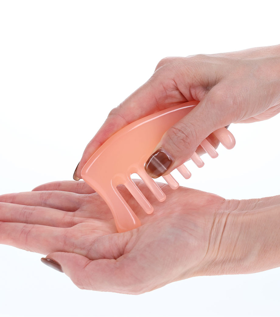 コームとしてのケアとマッサージ機能を兼ね備えた2WAY美容アイテム。手のひらにぴったり収まるフィット感と、まるでジュエルのようにきらめく質感が魅力です。各箇所でツボ押しができ、マッサージすれば滞っている血流がスムーズになりむくみ解消や疲労回復に役立ちます。バスタイムや日常のリラックスタイムにおすすめ。1色パッド印刷が可能でエステサロンや美容関係のノベルティとして人気です。