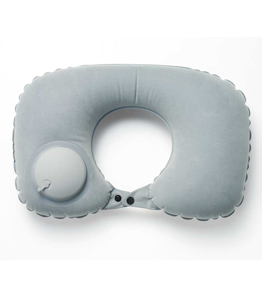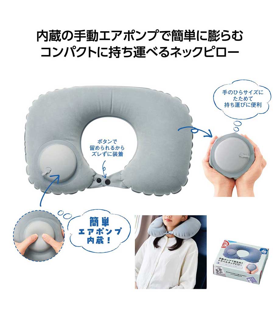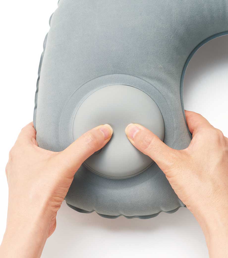 手動ポンプ内蔵のネックピローです。息を吹き込まず手動でふくらませるから衛生的。お好みの固さに調節できます。首元はボタンで留められるので使用している時にズレる心配がありません。