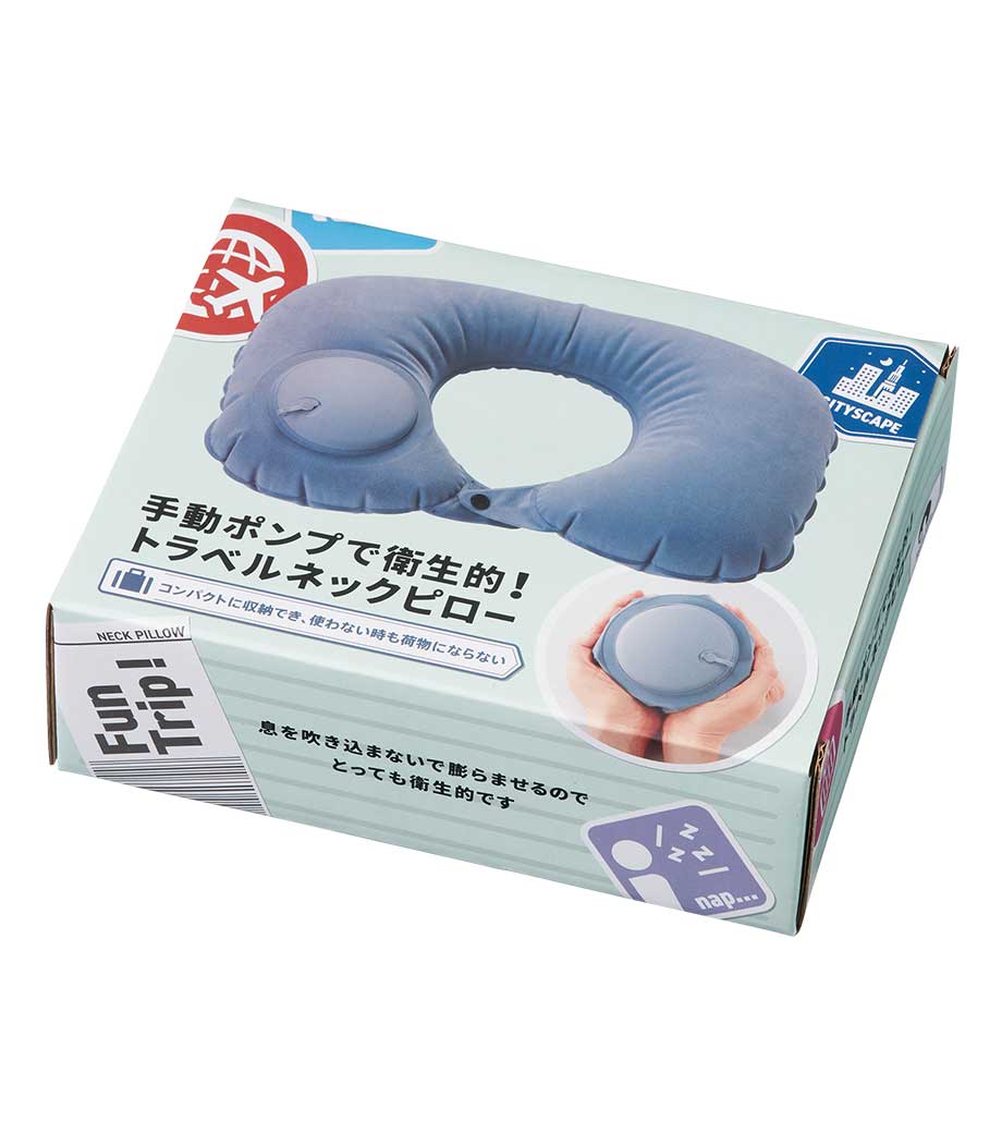 栓を開けて空気を抜くとコンパクトな手のひらサイズに。旅行バッグの隙間に入れて長距離移動のリラックスタイムに活用できます。旅行会社のノベルティにおすすめです。