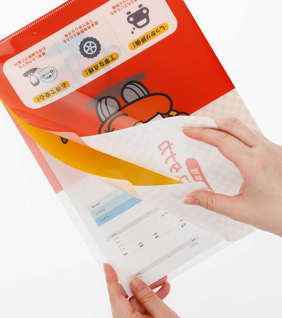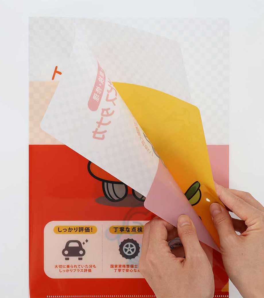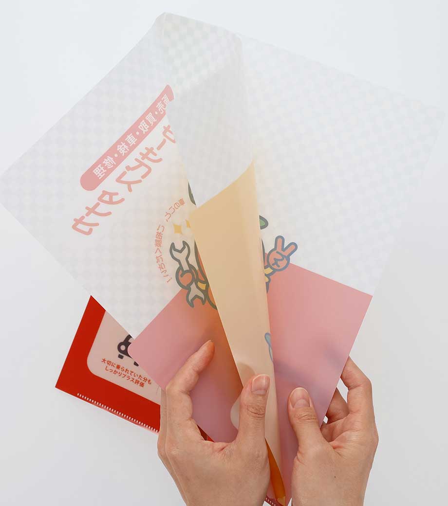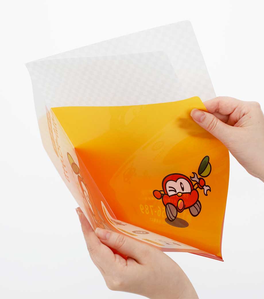 オモテとウラの全面にフルカラー印刷が可能なクリアファイル。細かなデータや写真がきれいに表現できるので、デザインにこだわったオリジナルのノベルティを作成していただけます。